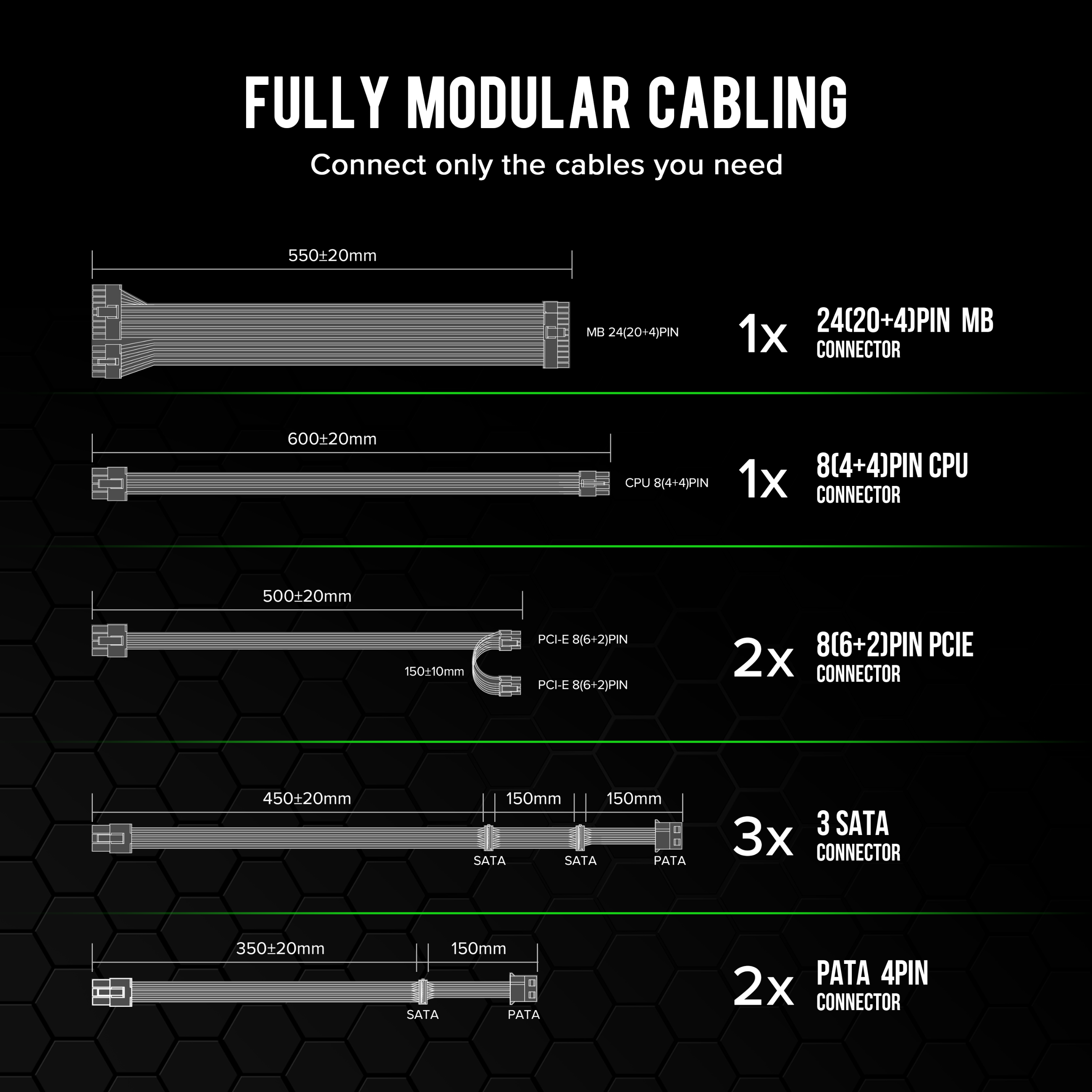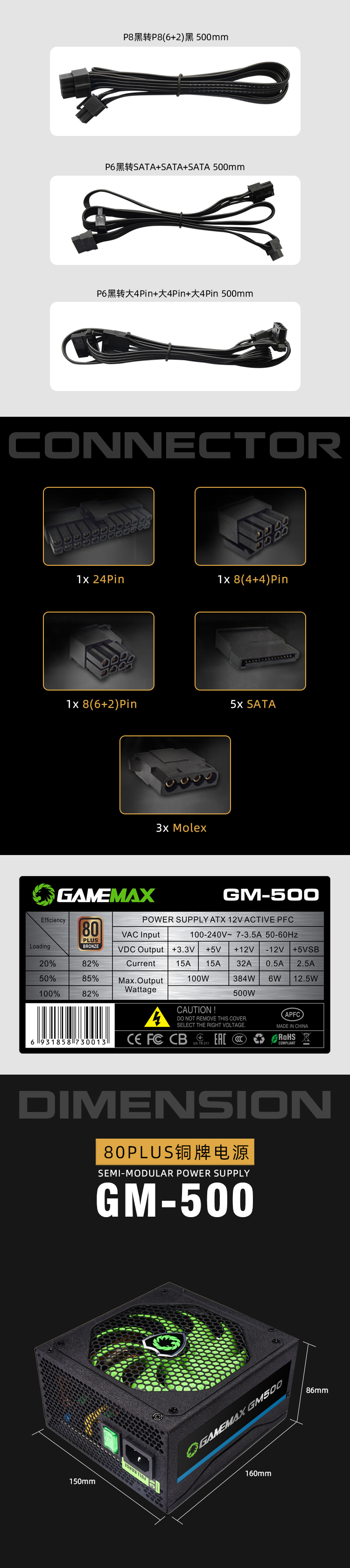 GameMax游戏帝国GM 系列电源,采用高效80+APFC电路铜牌设计,输出端口为半模组,模组化线材允许您仅连接系统需要的电缆。 更少的电缆使电脑机箱内部更整洁,并且在您的机箱内有更好的气流。并GM系列电源 具有多重保护设计,输出高效率,12V大电流升级版,为电脑运行提供耐用性和对您下一个系统构建的完全信心。
