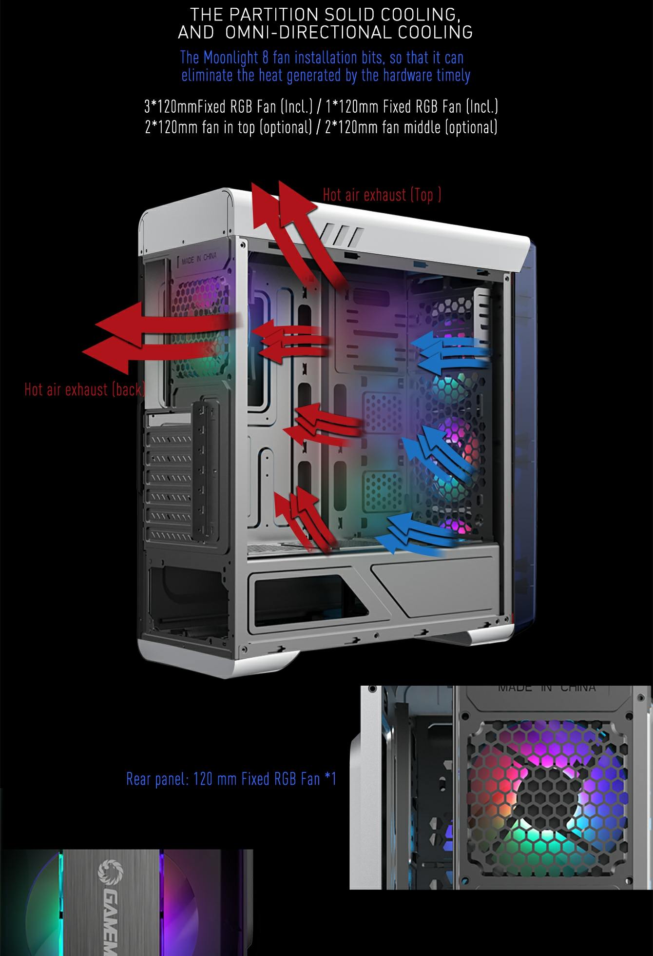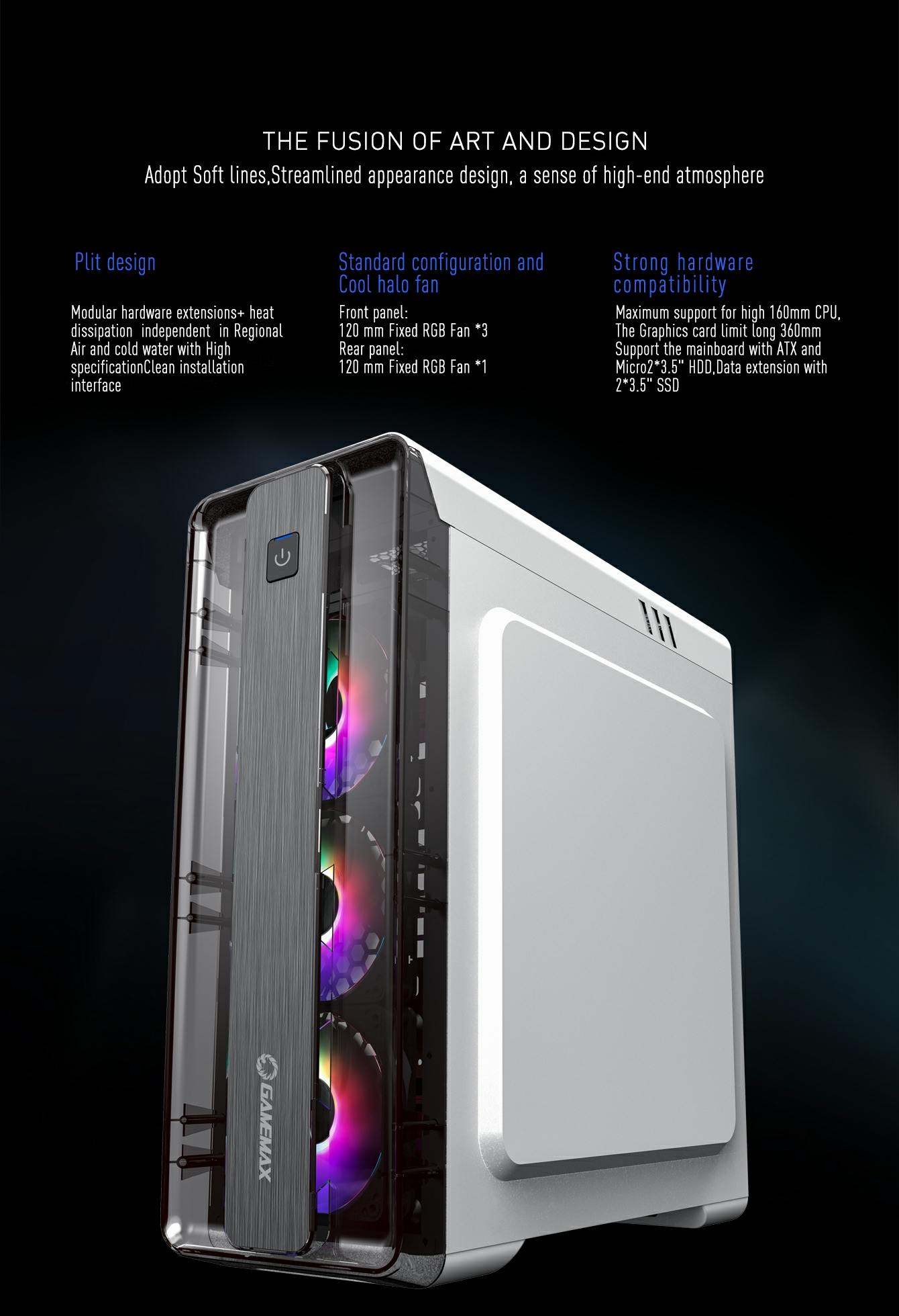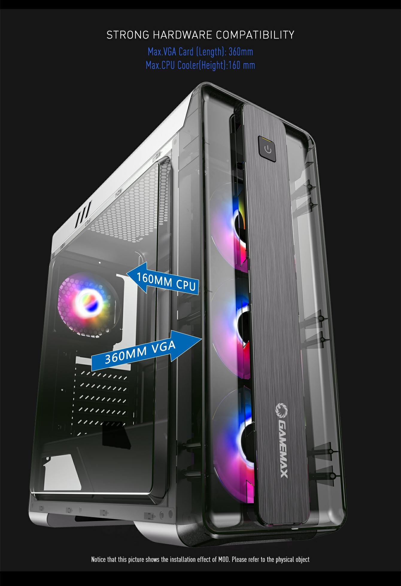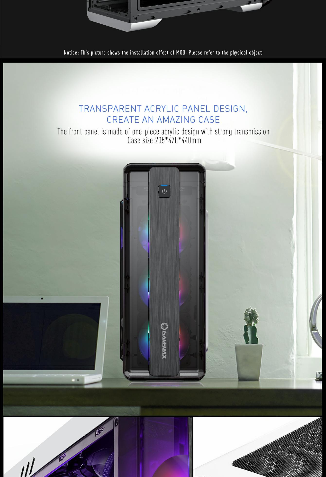 • The total 4x bright fixed color FRGB Fans at the front and rear fans, give the case a unique style, whilst keeping the system cool