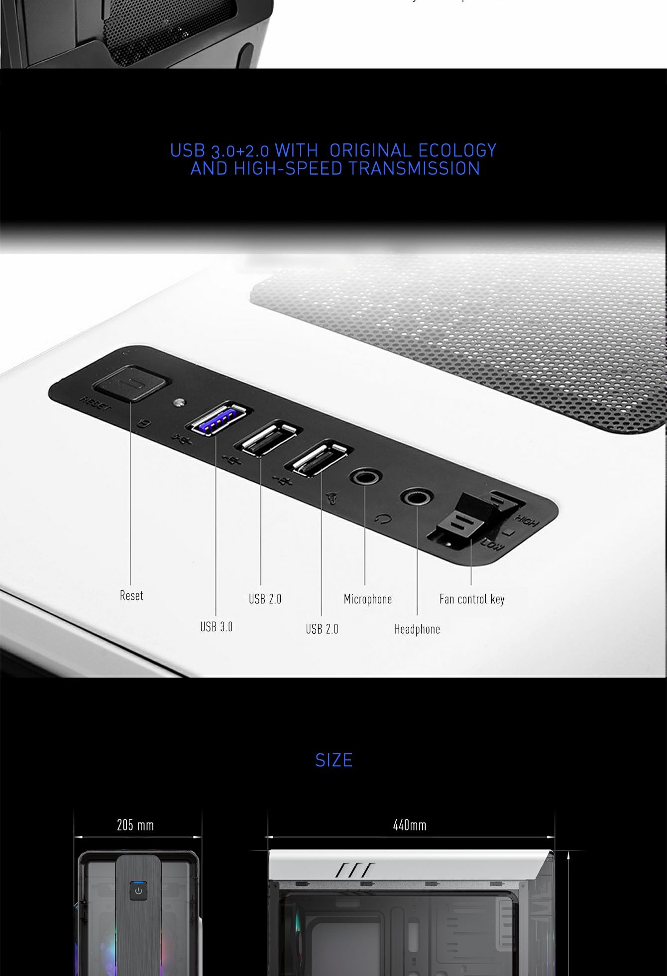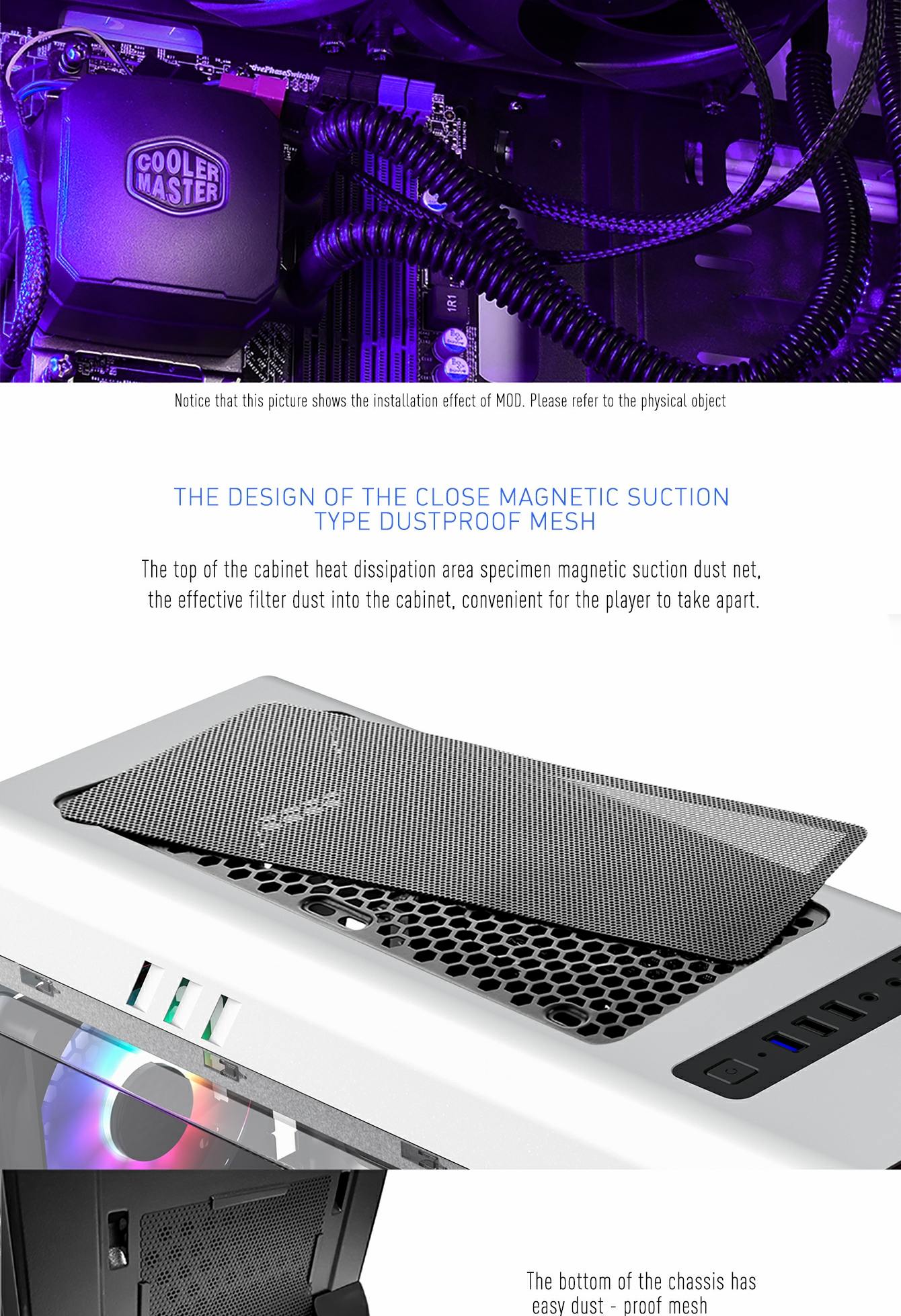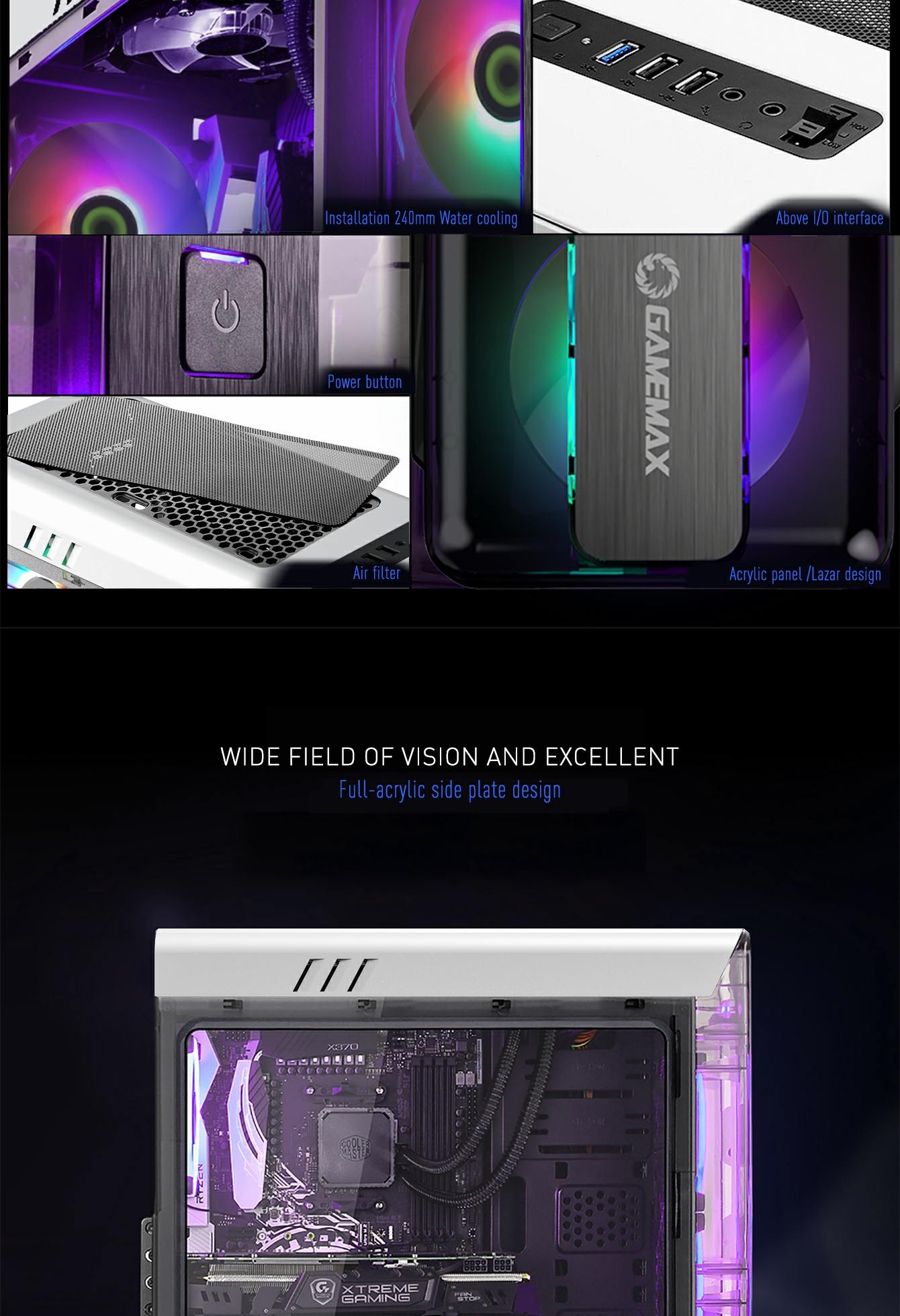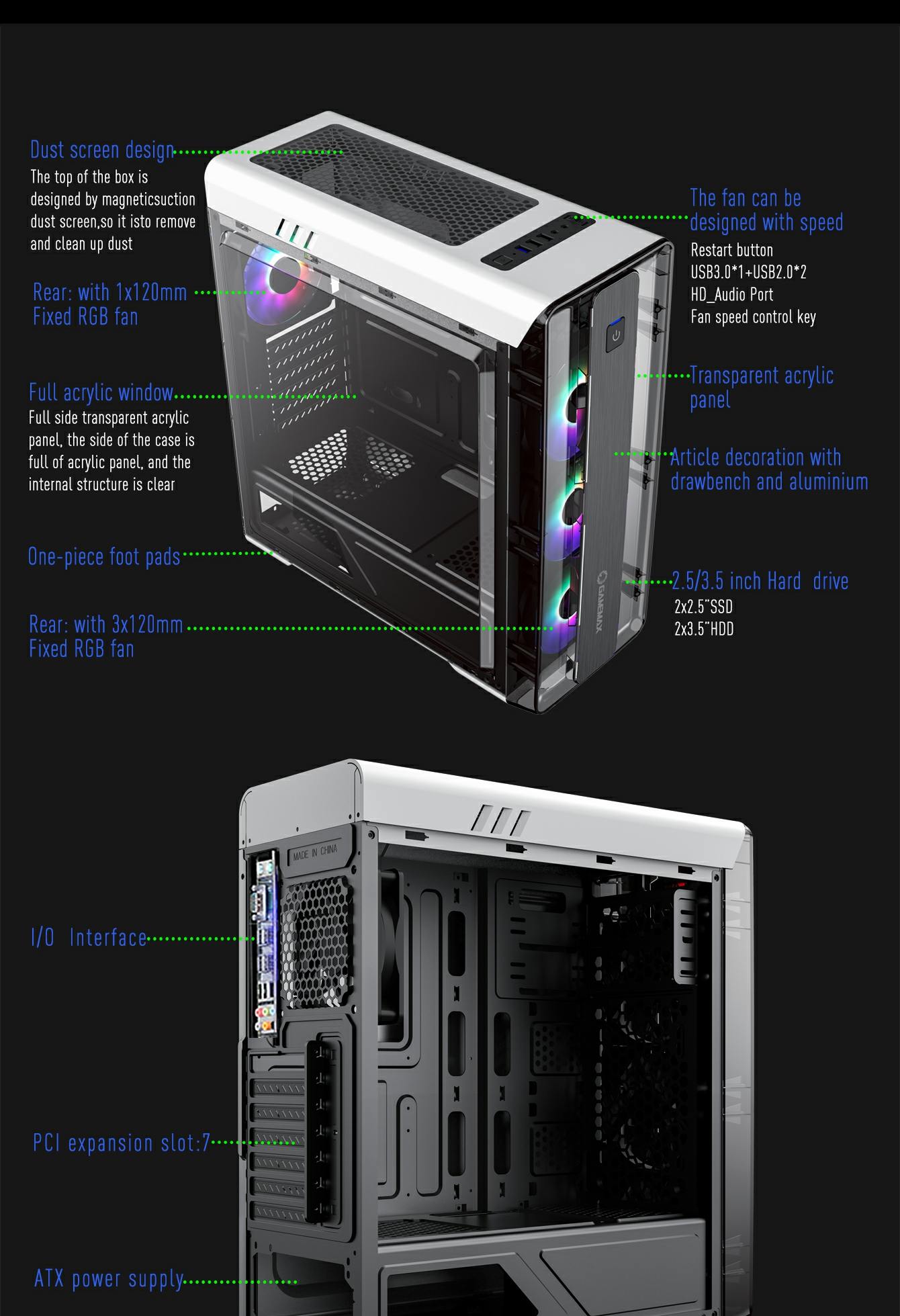 • The total 4x bright fixed color FRGB Fans at the front and rear fans, give the case a unique style, whilst keeping the system cool