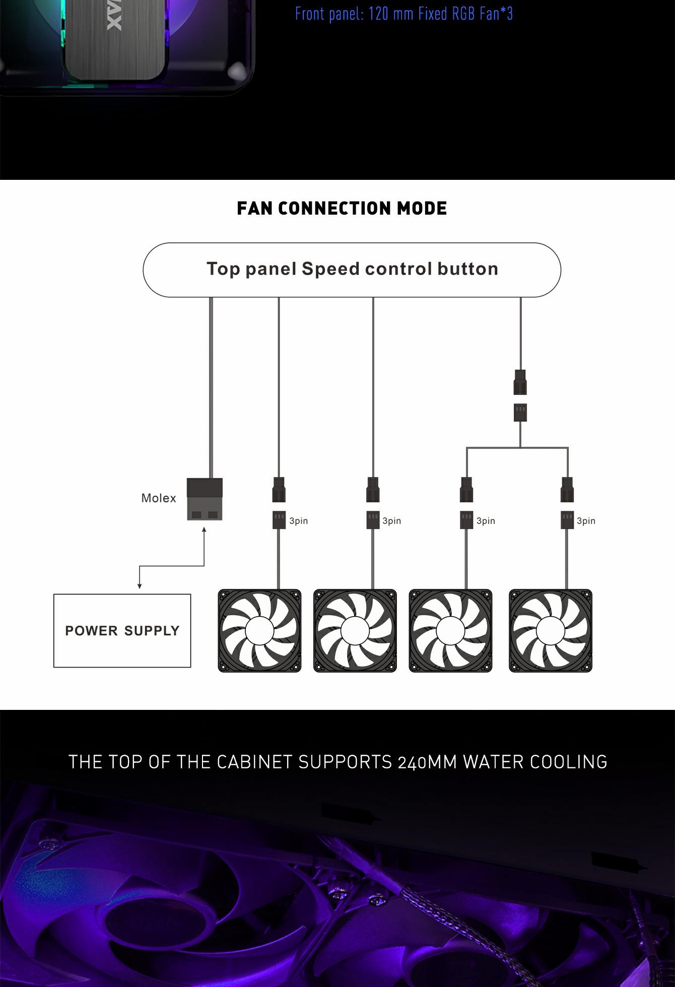 | Reserved Fan Ports: (optional) | Front: 3x120mm FRGB 4colors fan ( Included) |