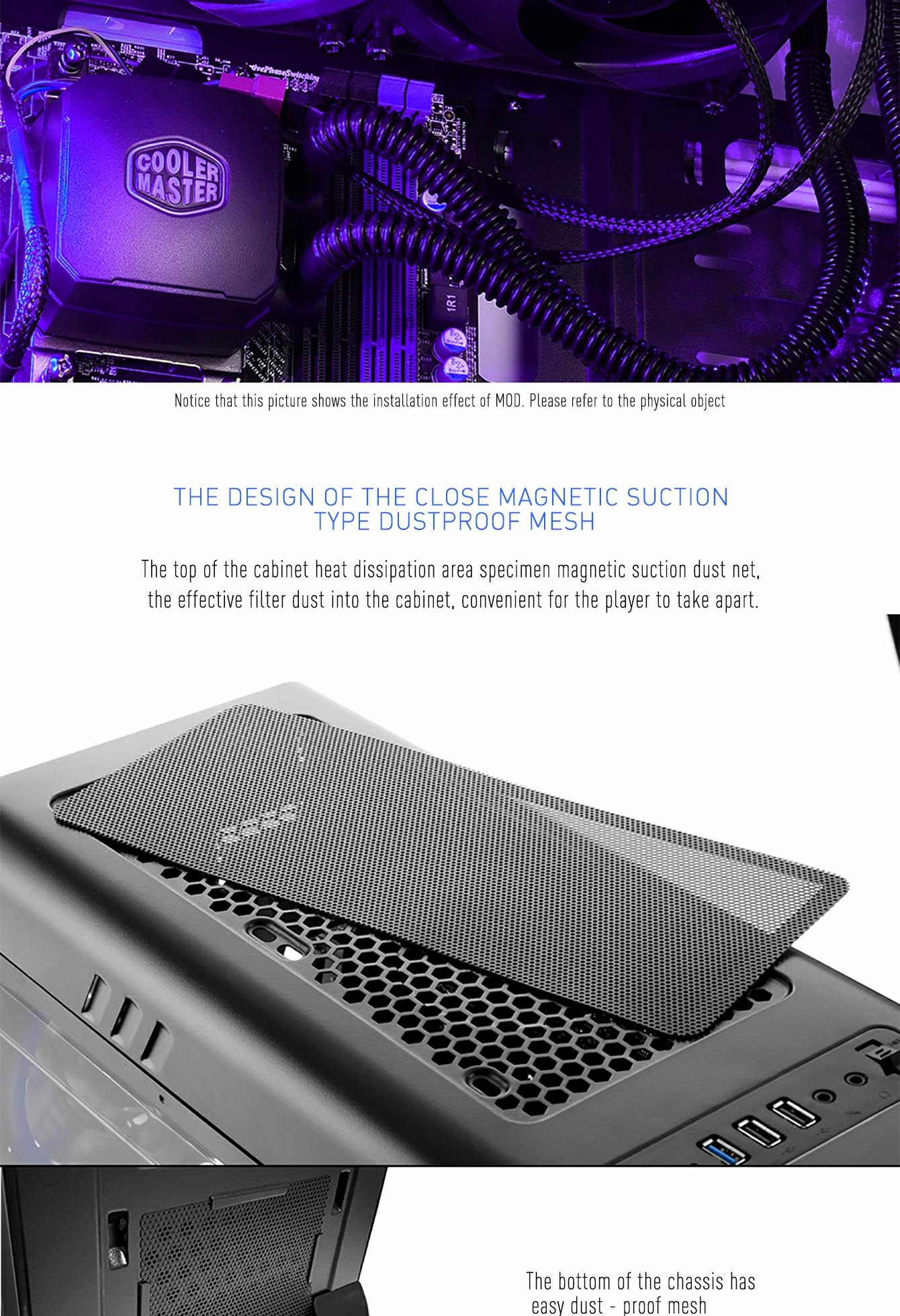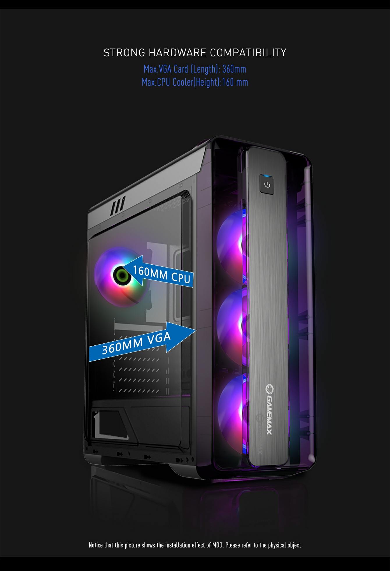The total 4x bright fixed color FRGB Fans at the front and rear fans, give the case a unique style, whilst keeping the system cool
