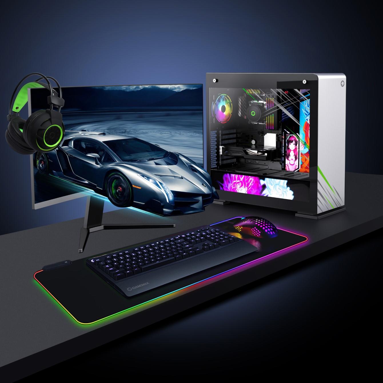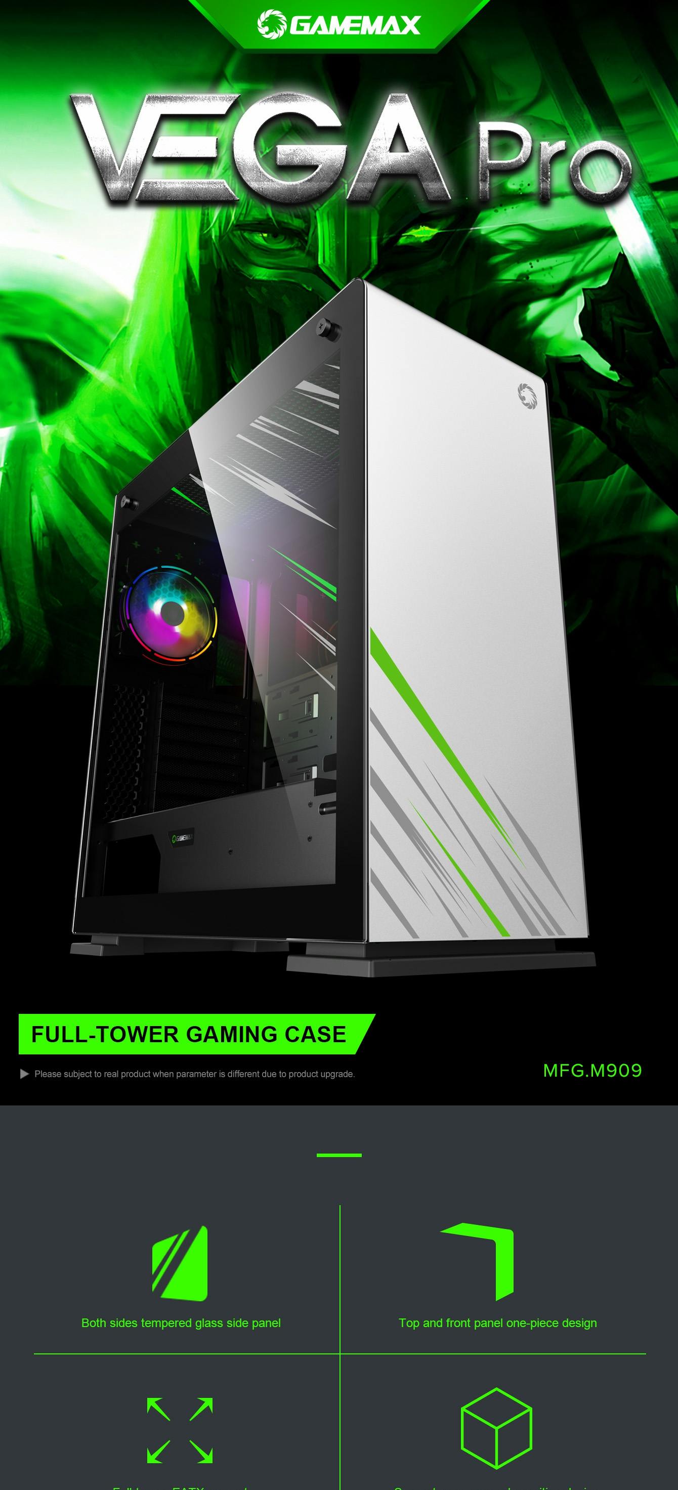 GameMax Vega Pro Full tower PC Case White Case, Dual Tempered Glass side panels designed for gamers, the full tower chassis features a full metal front and top metal panel, and top panel with 3x120 or 140mm fan position for support an extraordinary thermal performance