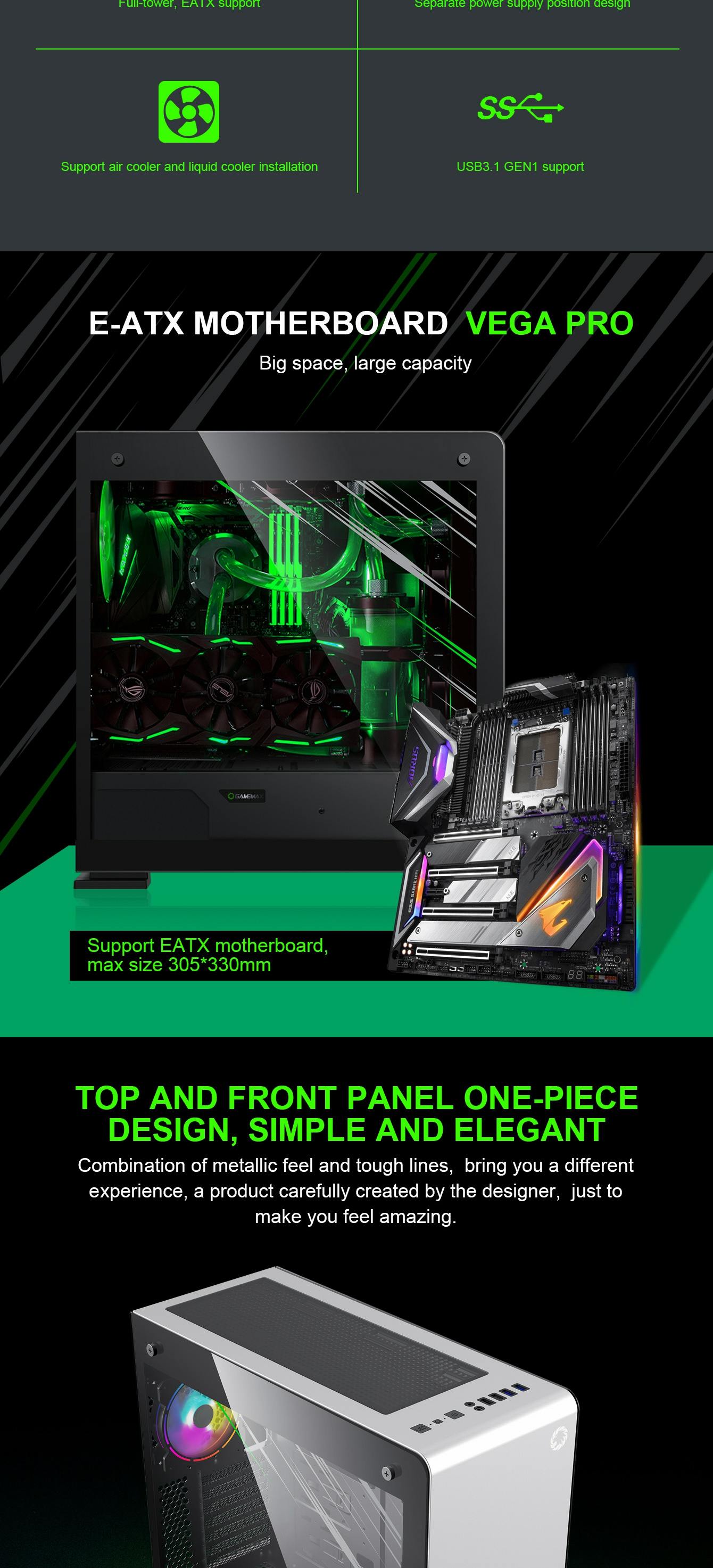 • Vega Pro supports up to a standard ATX and up to E-ATX big motherboard