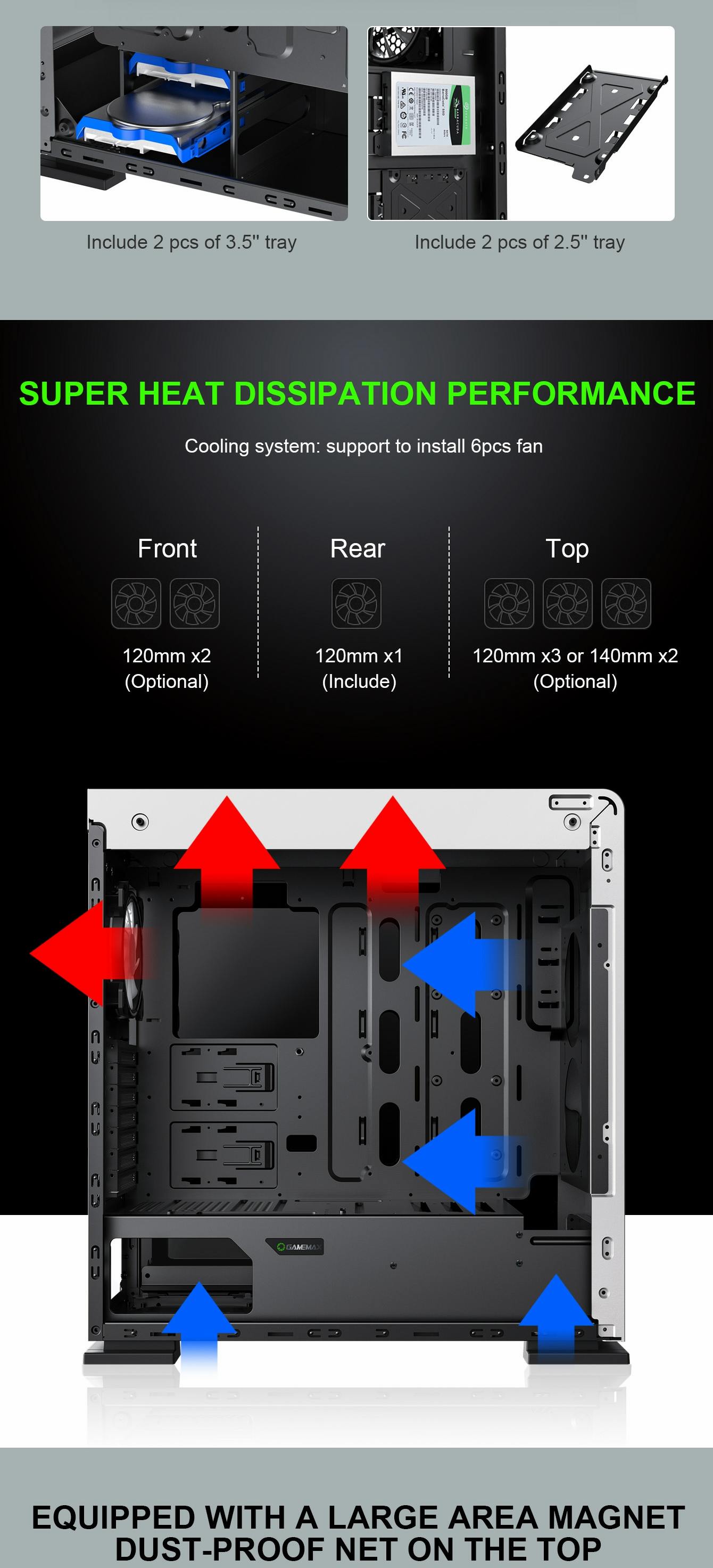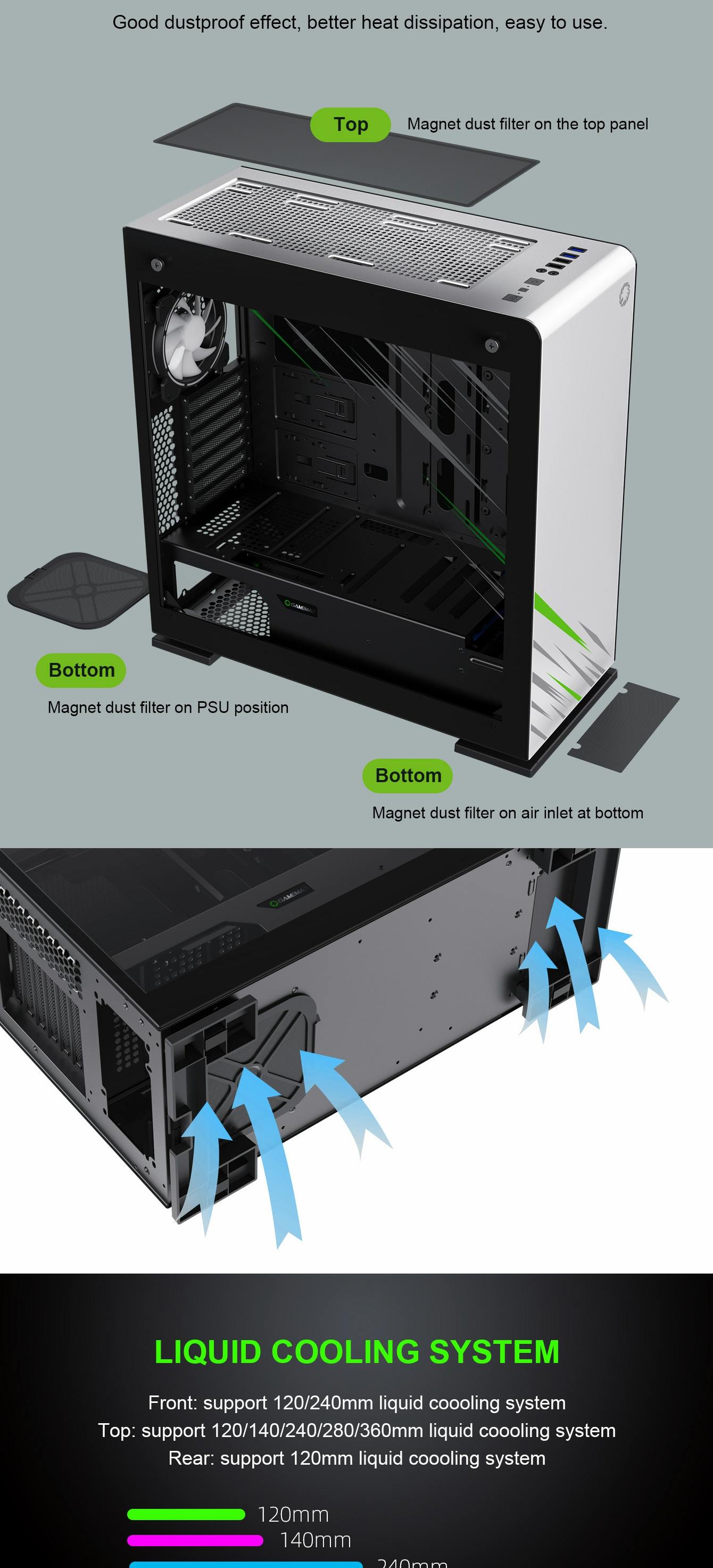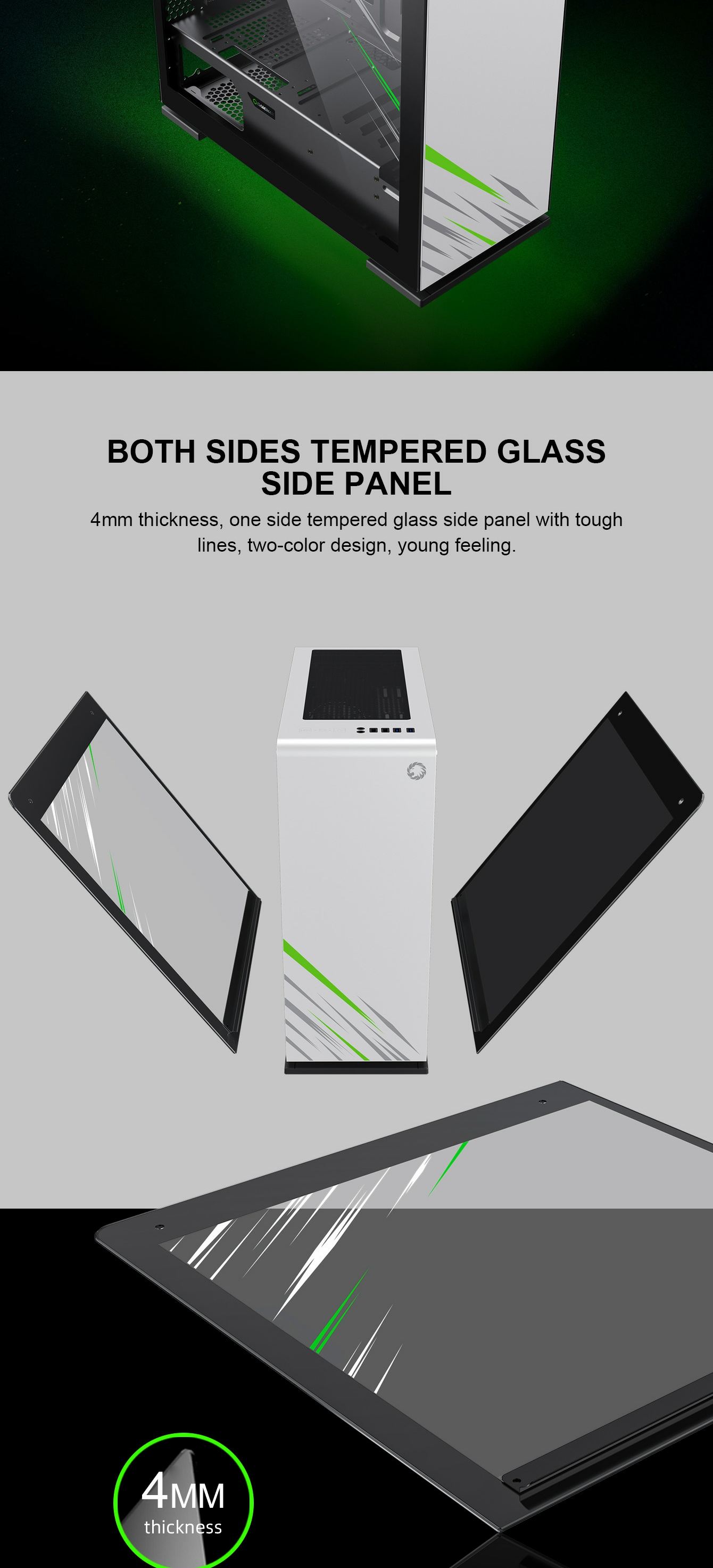 • Vega Pro Chassis is made of 1.2mm thickness steel, it with Dual Tempered Glass Side Panels, and front and side with paint texture for improved the gaming factor, also there are additional hidden bottom air intake holes with dual dust-filters.