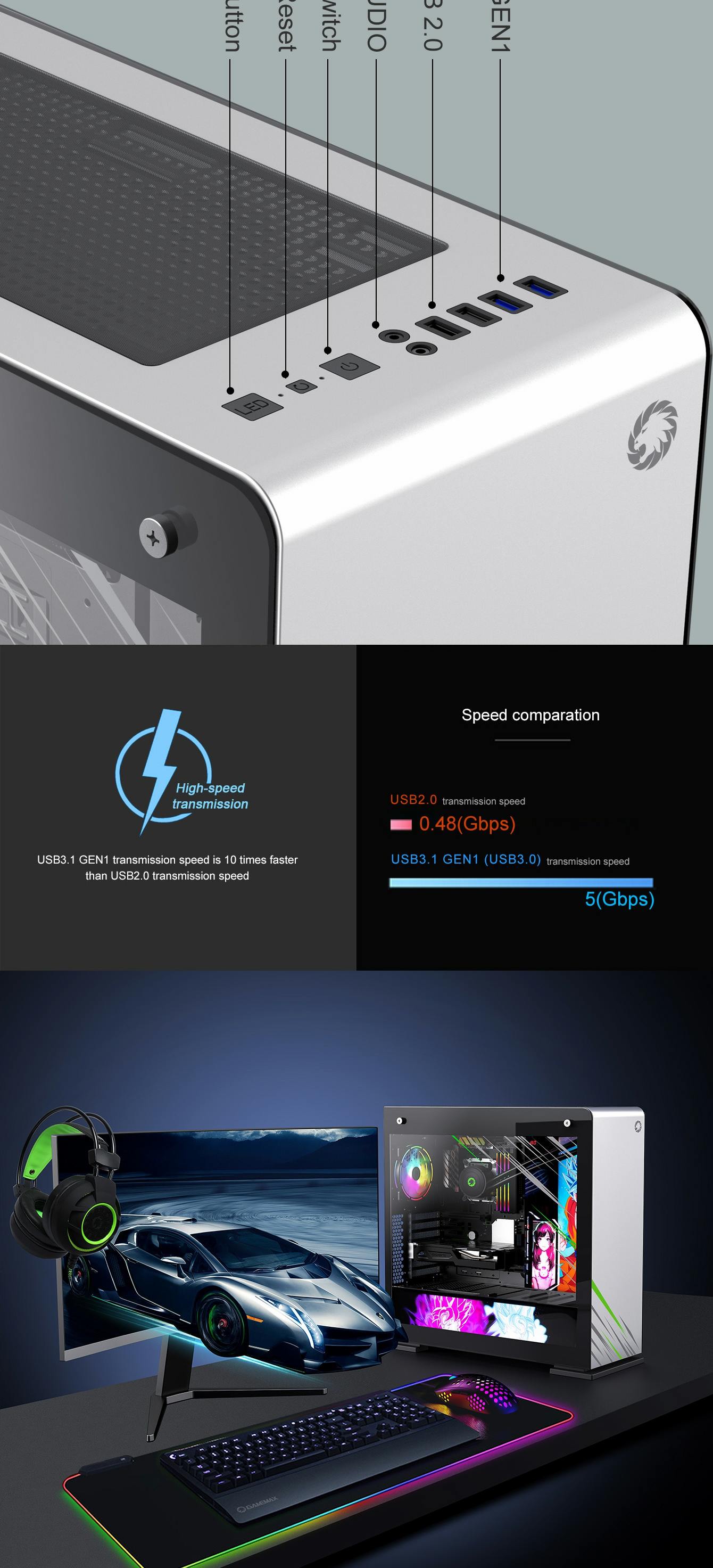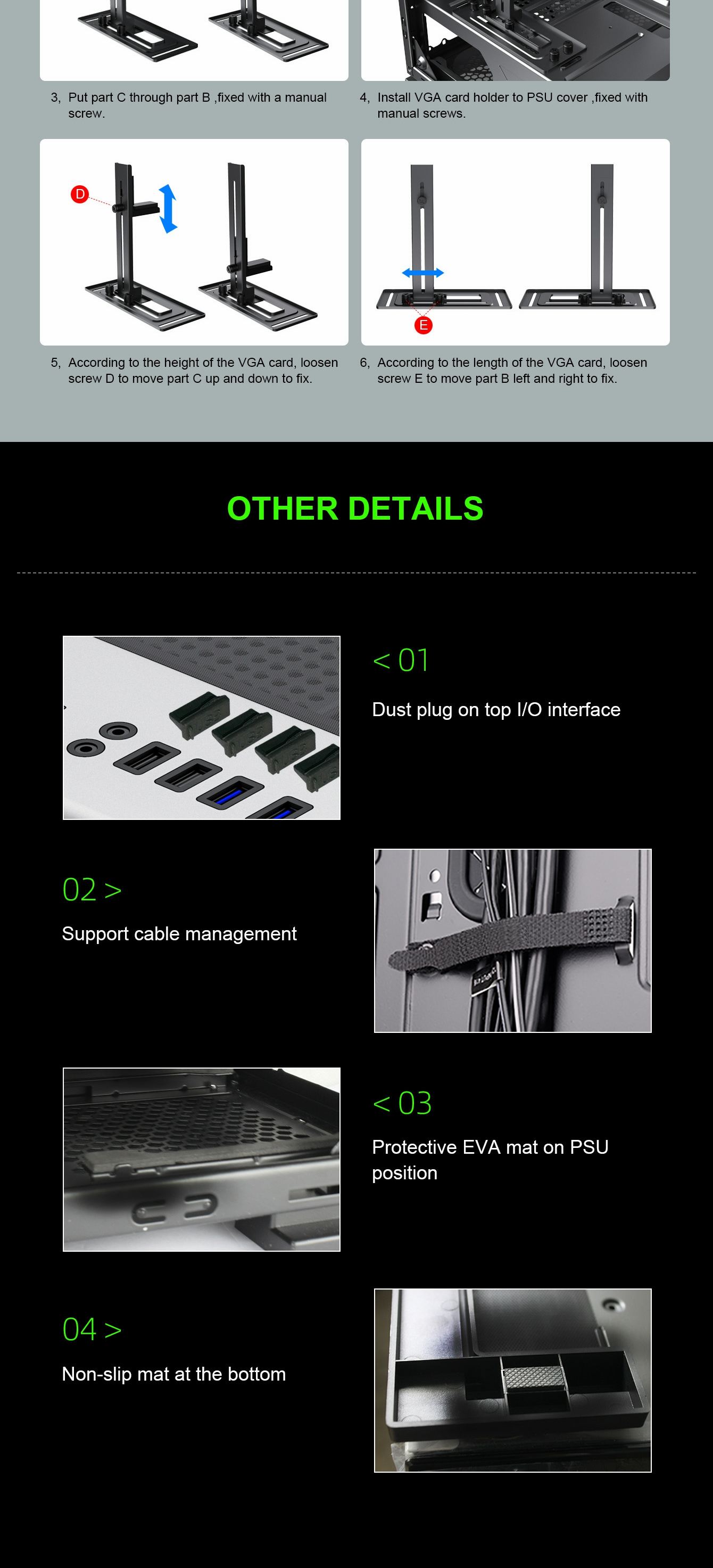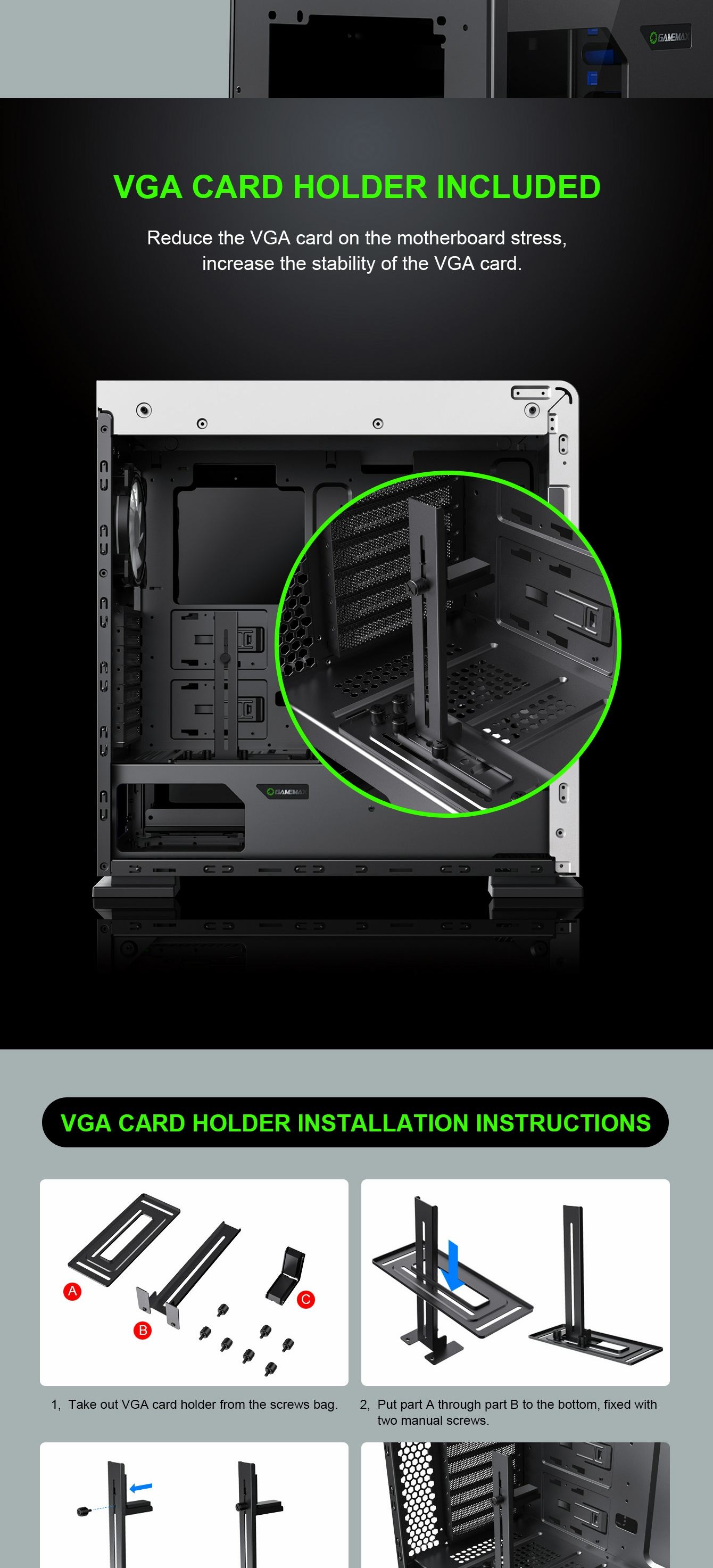 • Vega Pro Chassis is made of 1.2mm thickness steel, it with Dual Tempered Glass Side Panels, and front and side with paint texture for improved the gaming factor, also there are additional hidden bottom air intake holes with dual dust-filters.
