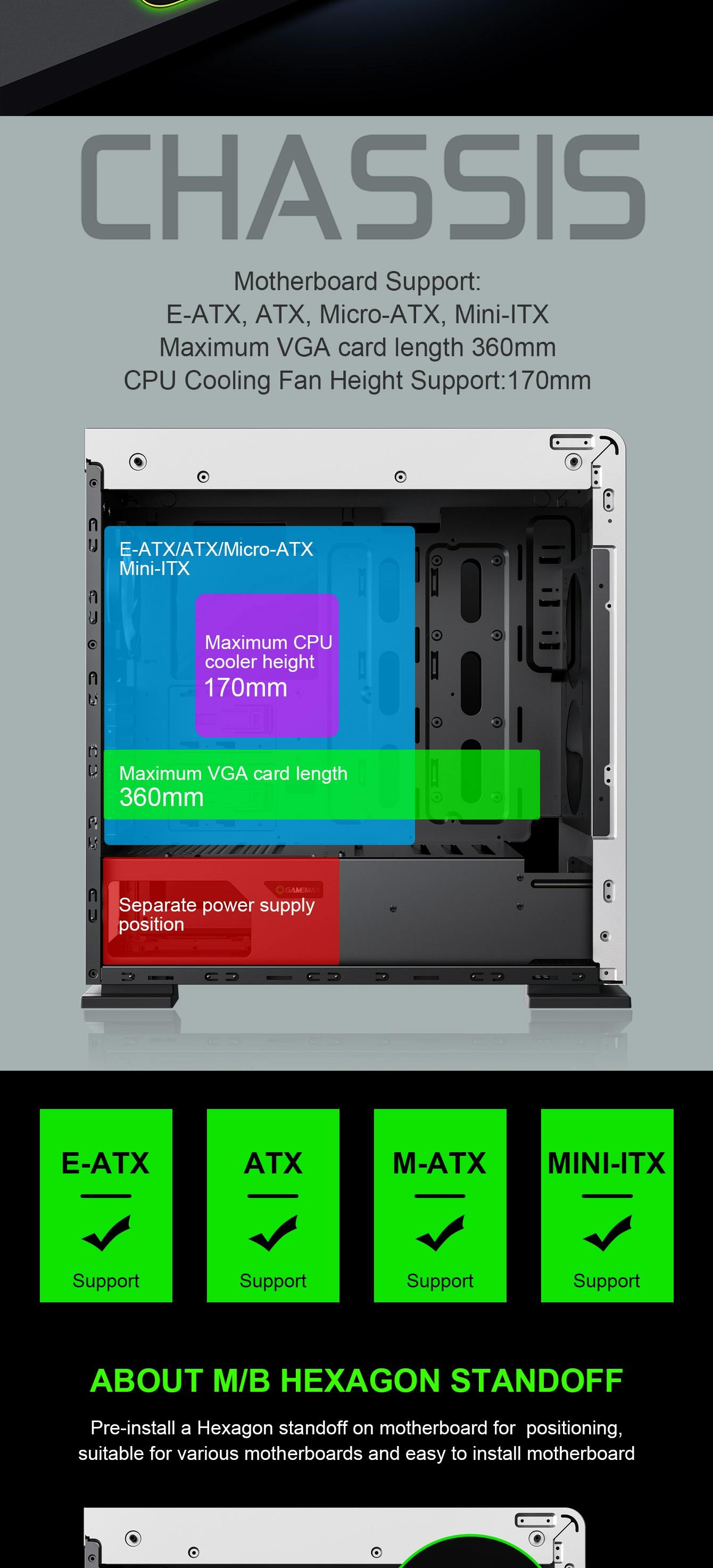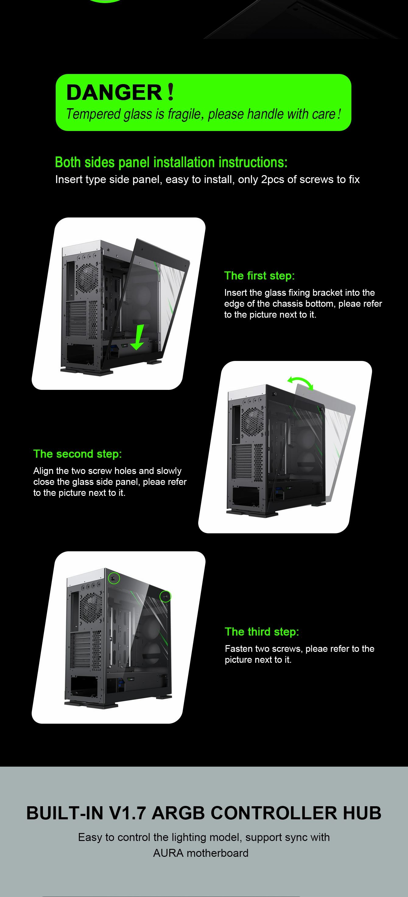 | Vega Pro Chassis | SPCC Rear:0.8mm,Top/Front:1.2mm Left/Right: Tempered Glass | |