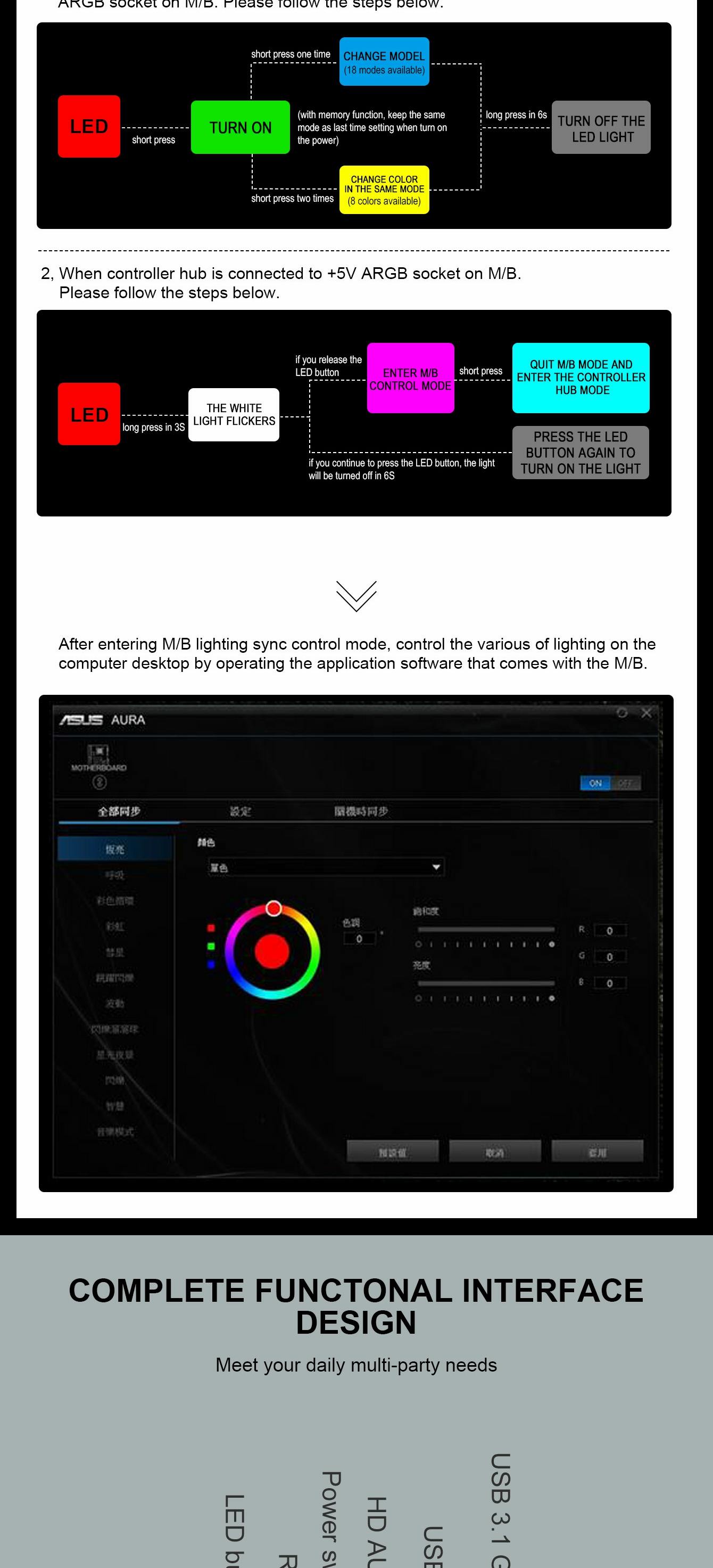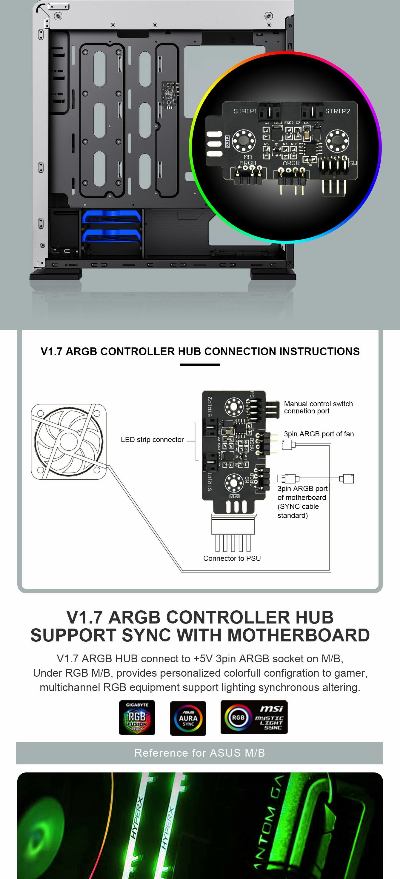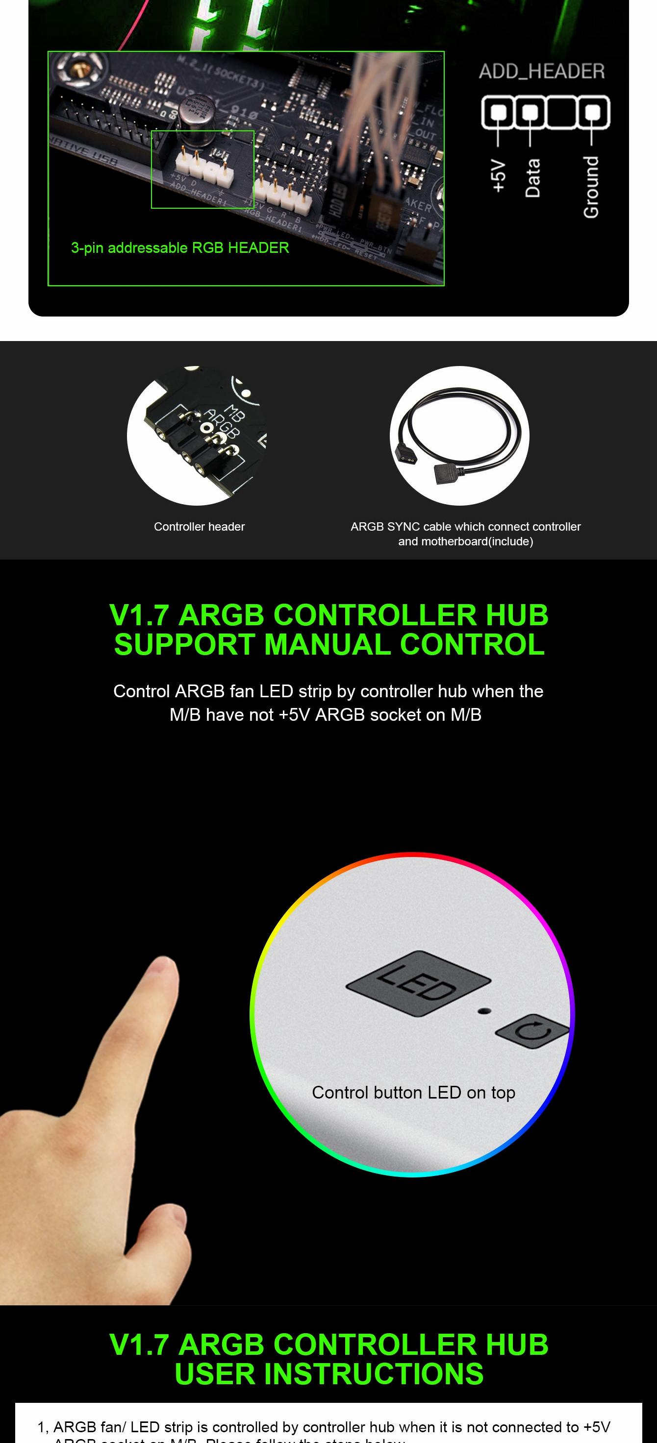• Additionally, the Vega comes with a V1.7 ARGB HUB controller, that allows manual control of ARGB light by the top RGB button, also Supports to SYNC with motherboard ARGB socket