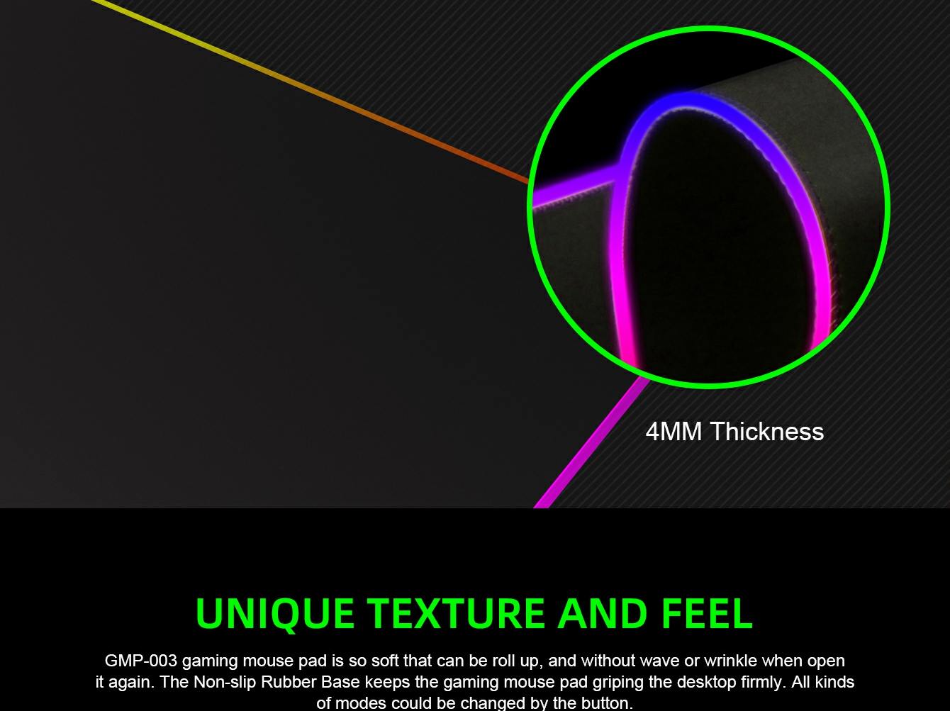 GMP-003 gaming mouse pad is so soft that can be roll-up, and without a wave or wrinkle when opened again