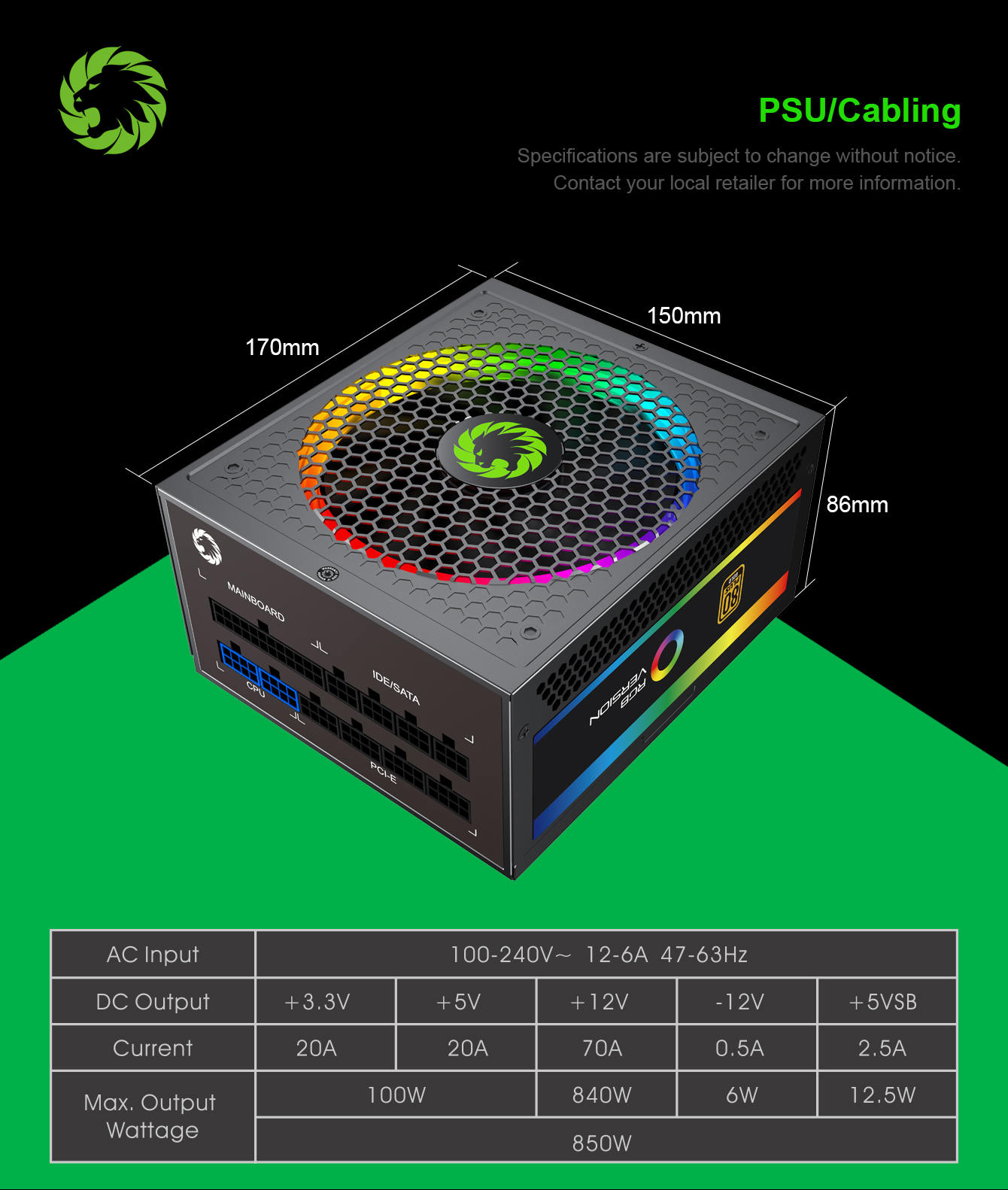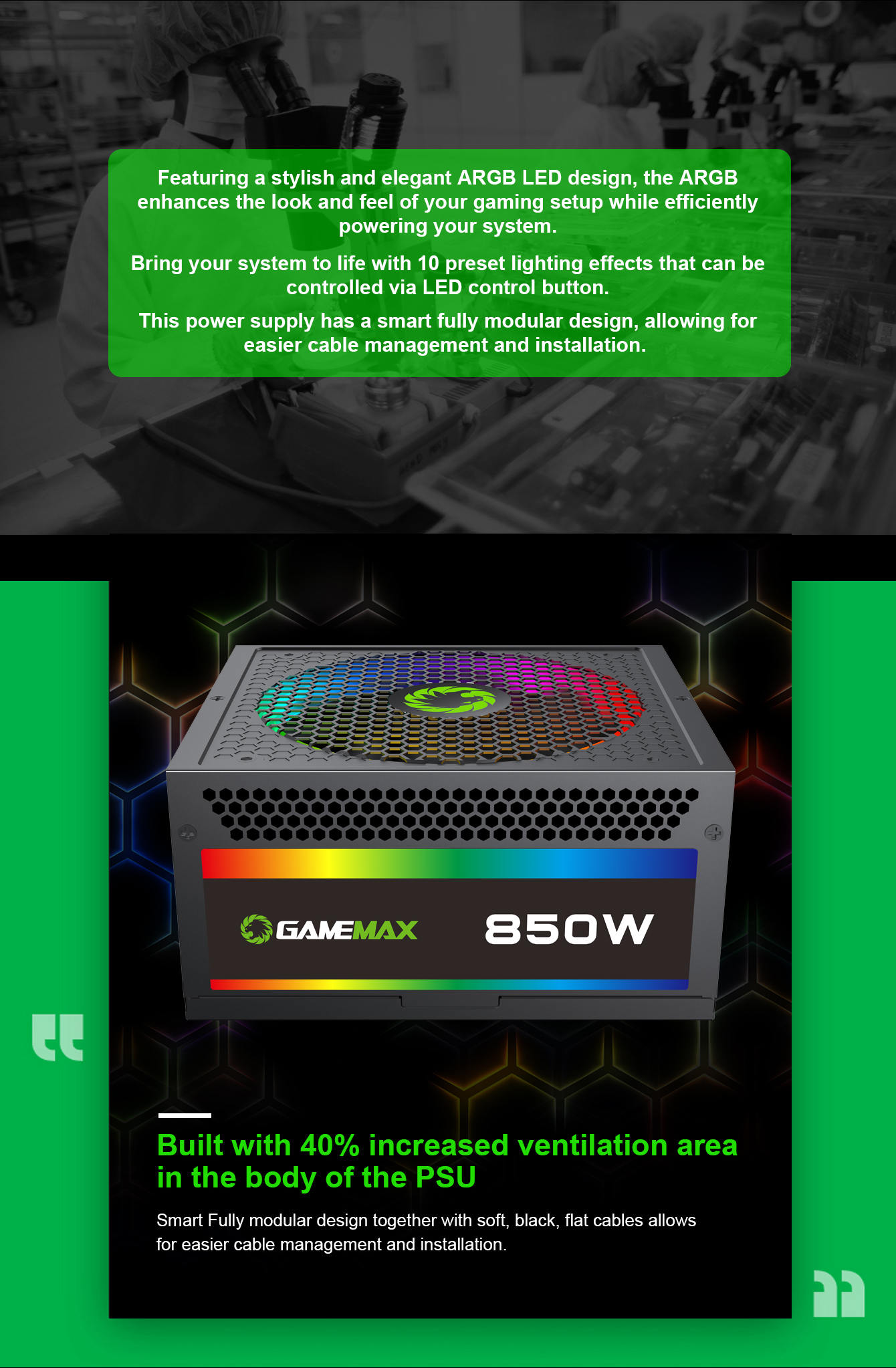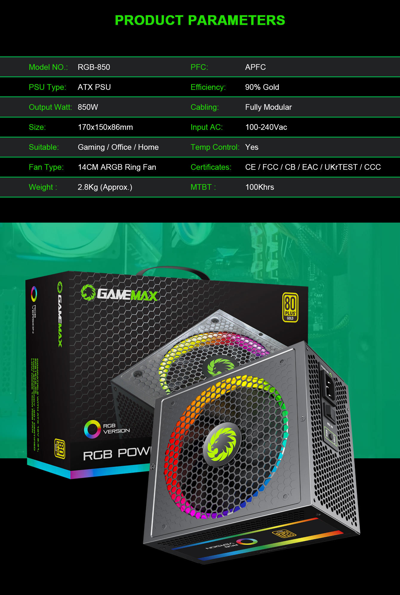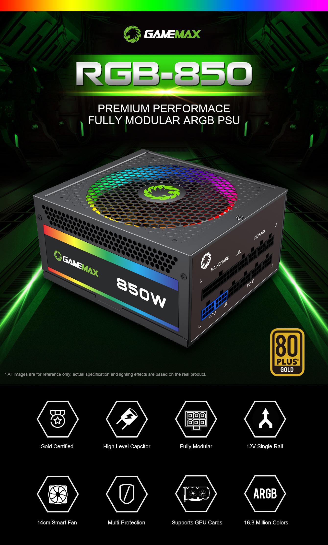 Power Supply 850W Fully Modular 80+ Gold Certified with RGB Light Mode , GAMEMAX RGB850 Rainbow
