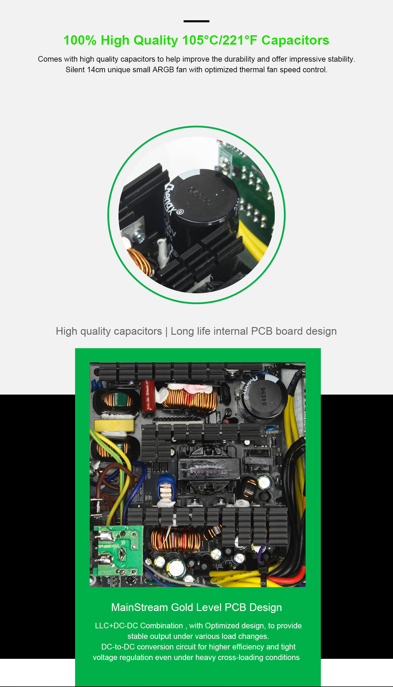 • Powerful single +12V rails offer stable DC output and support high-end graphic card and PC system