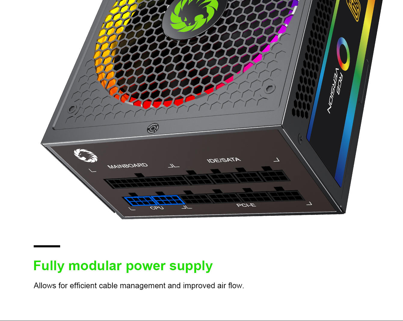 • Full Modular: Modular cables not only reduce the confusion of cables' management, but also increase airflow to improve overall efficiency and heat dissipation performance
