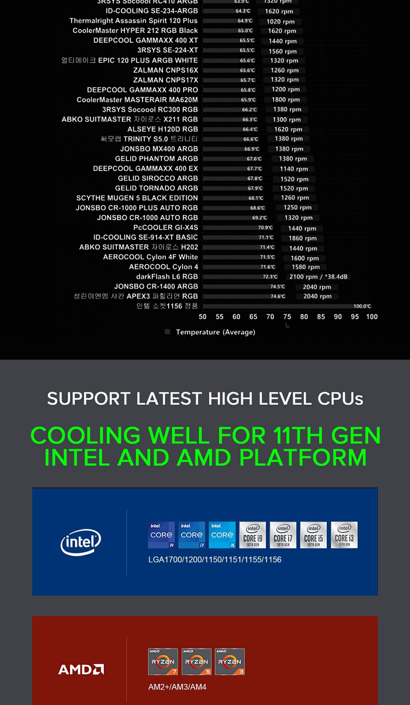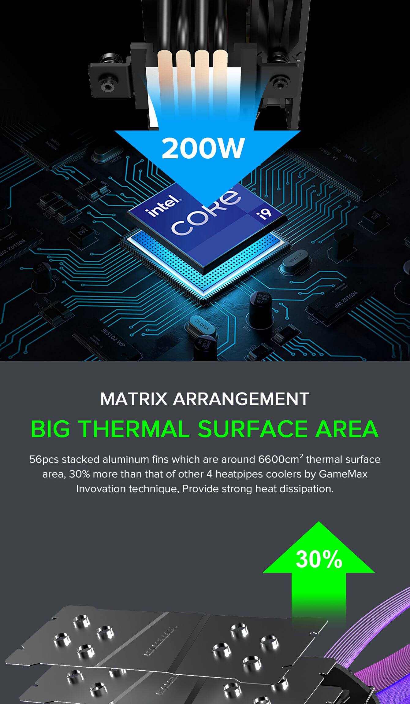• 56pcs stacked aluminum fins with 6600cm2 thermal surface area for strong heat dissipation, 30% bigger than that of other 4 heat-pipes coolers