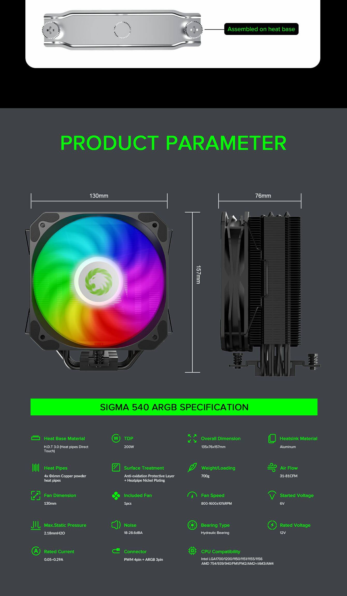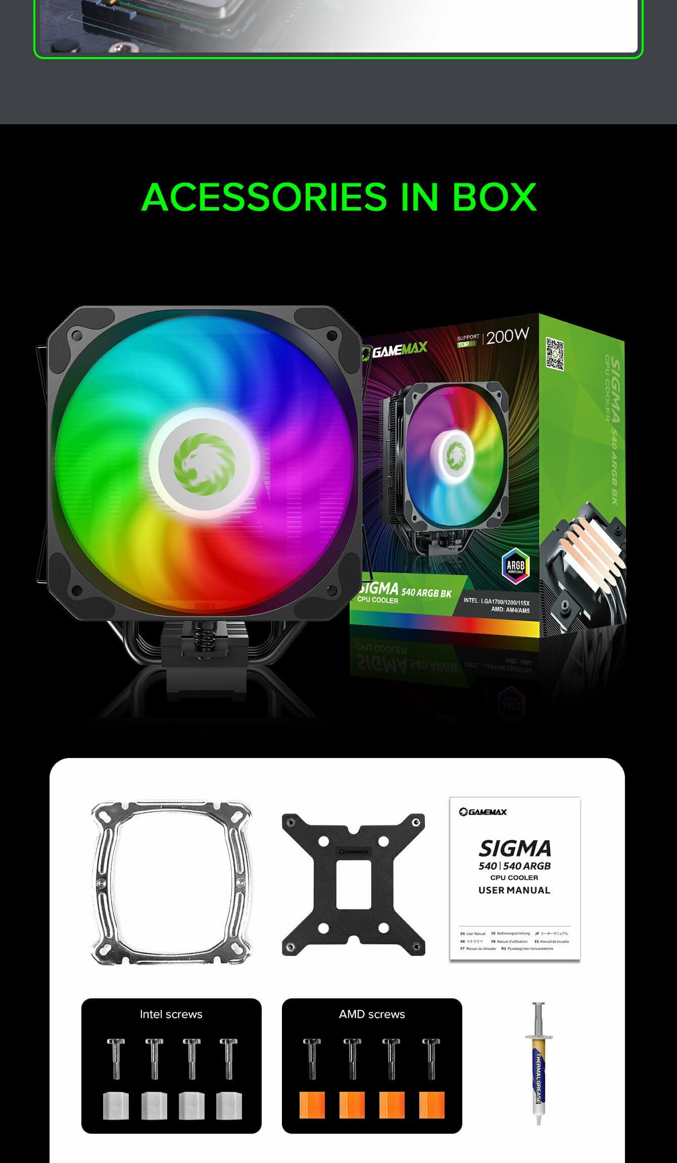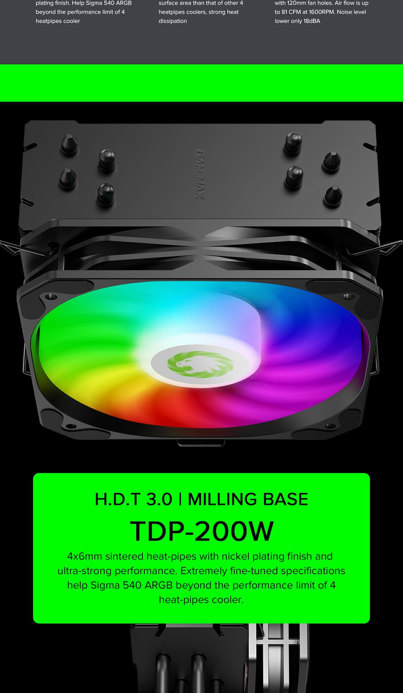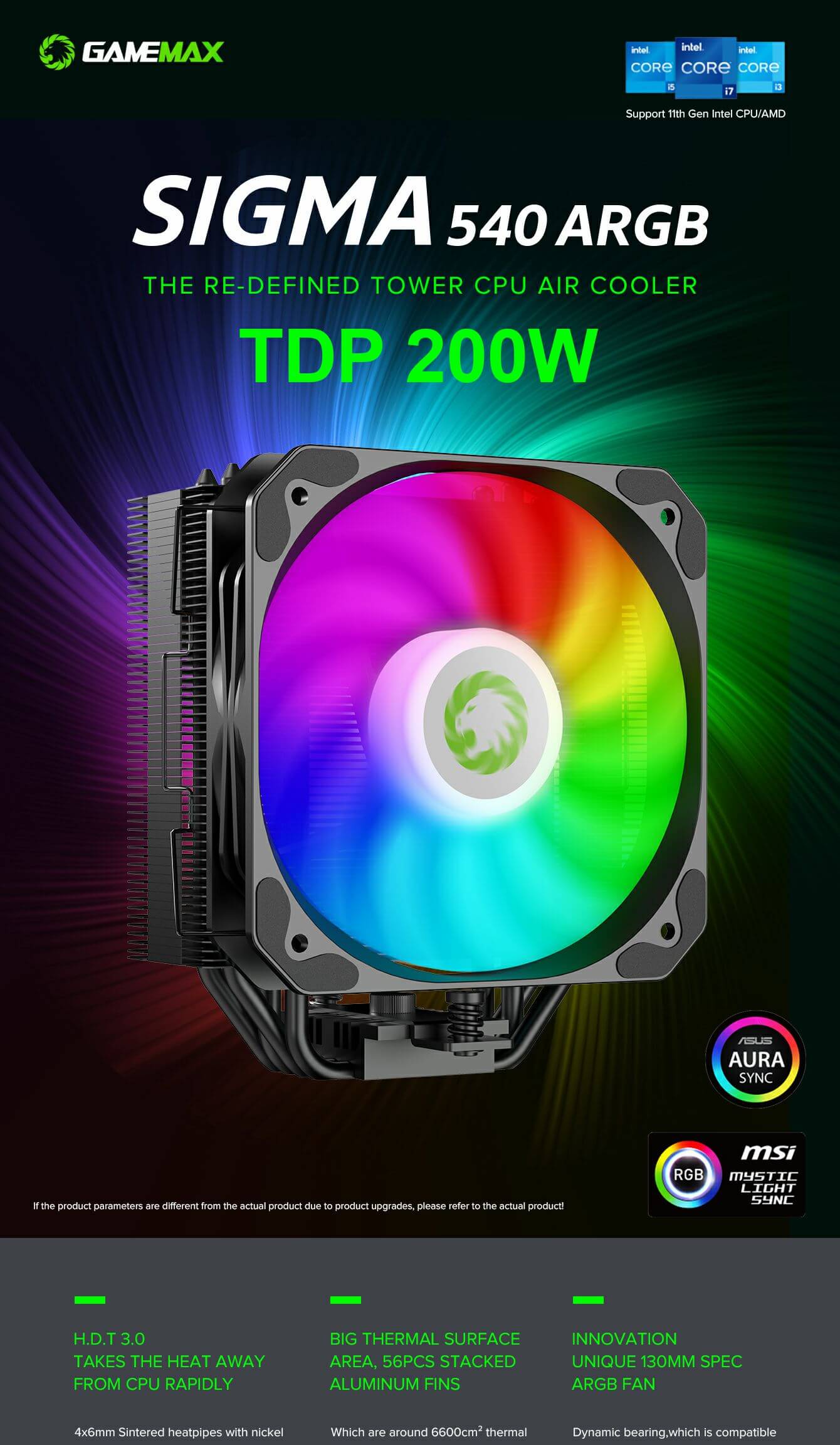 GameMax Sigma 540 ARGB Black Tower CPU air cooler with a large area radiator on four thermal tubes, Supports Intel Gen12 and Gen13 CPUs and AMD latest model, 130 mm unique high airflow fan and attachments under all current sockets