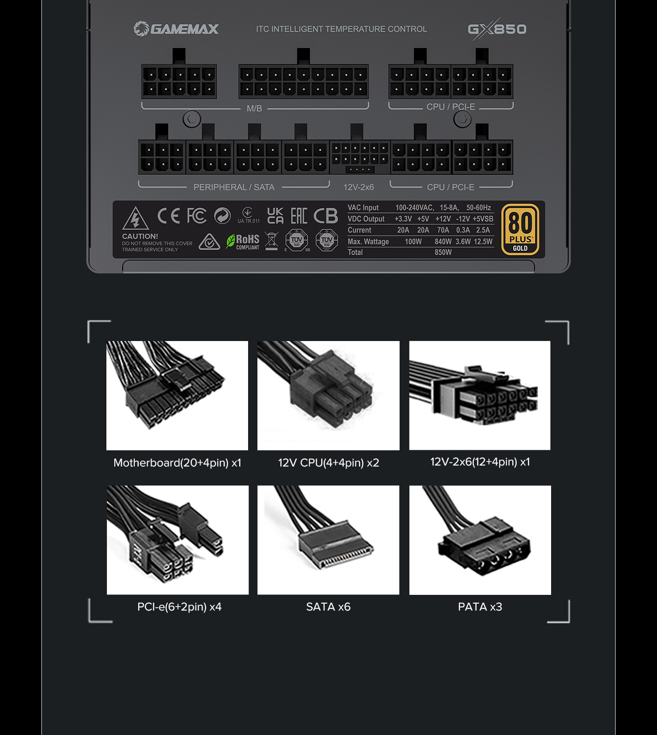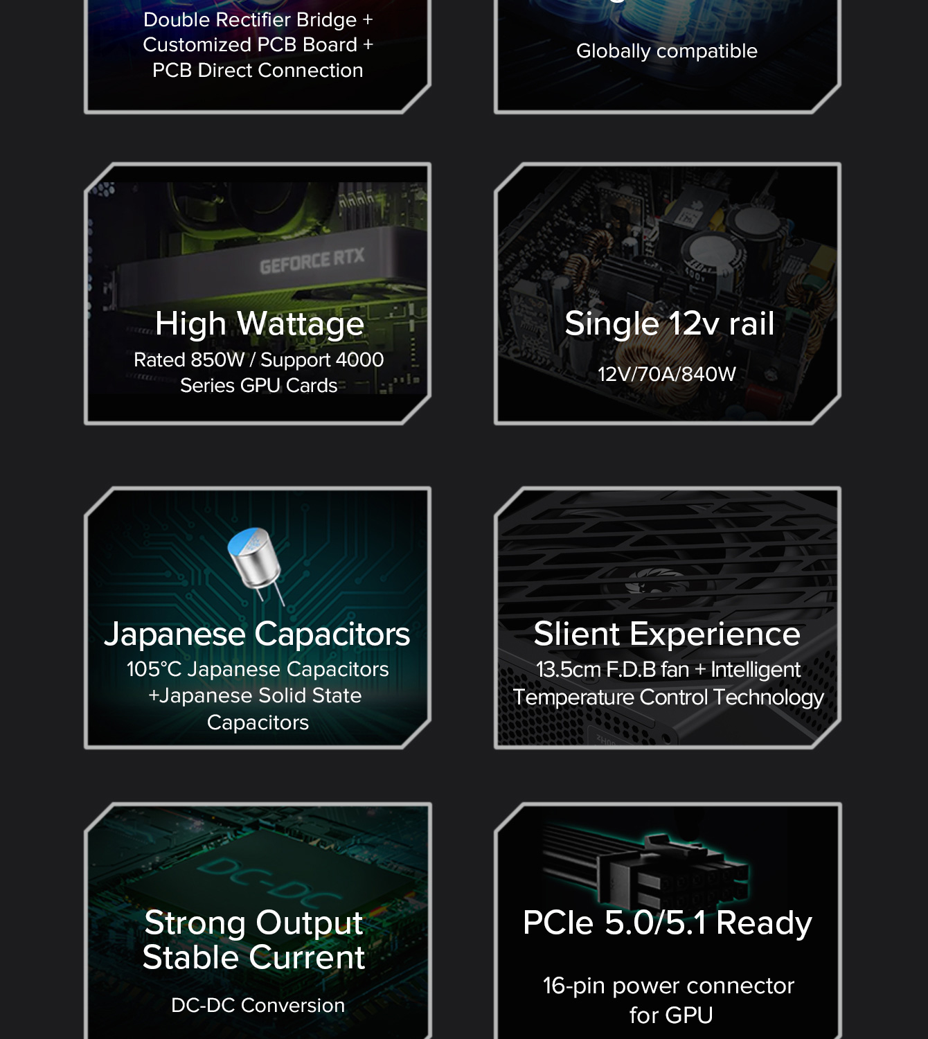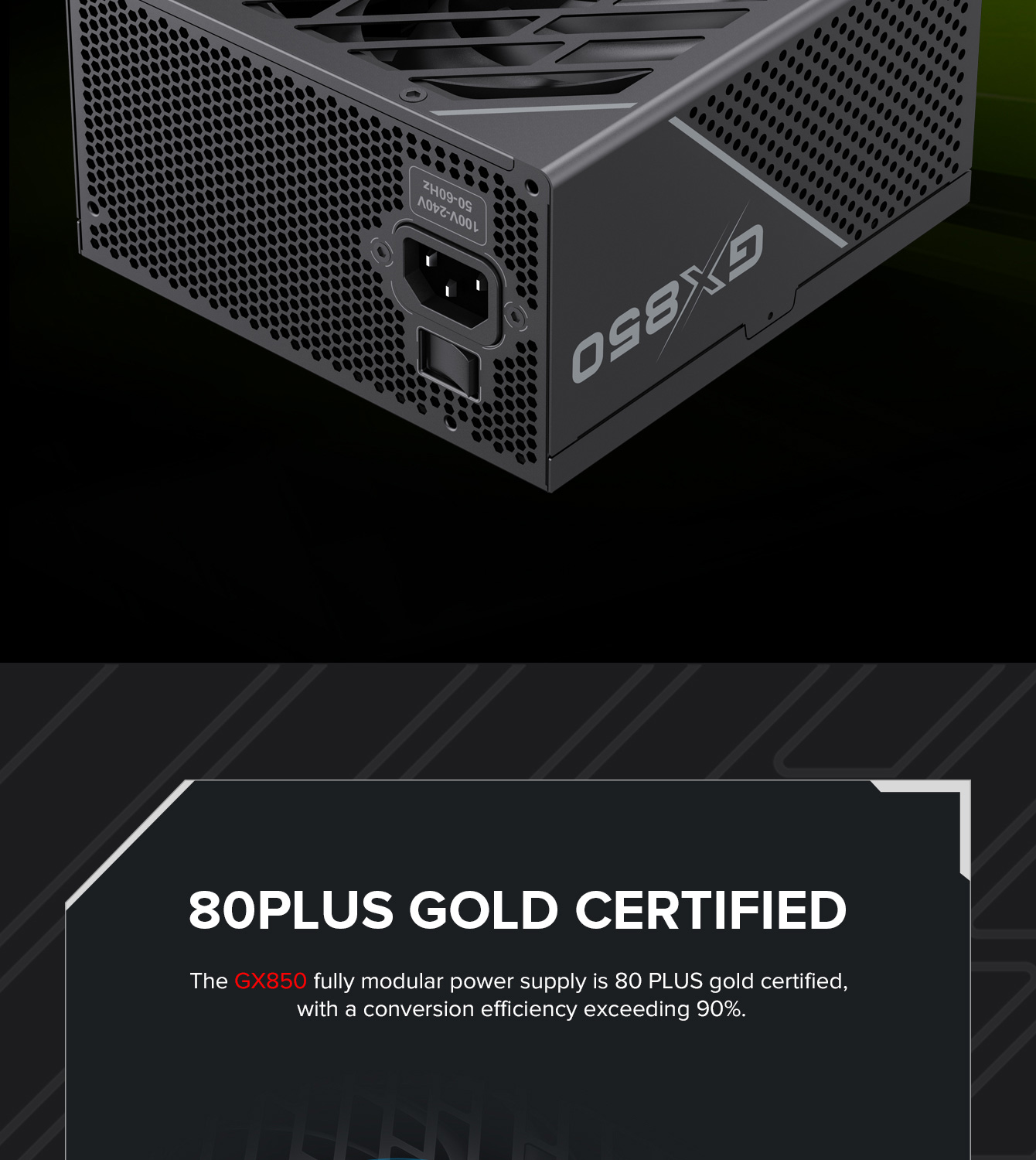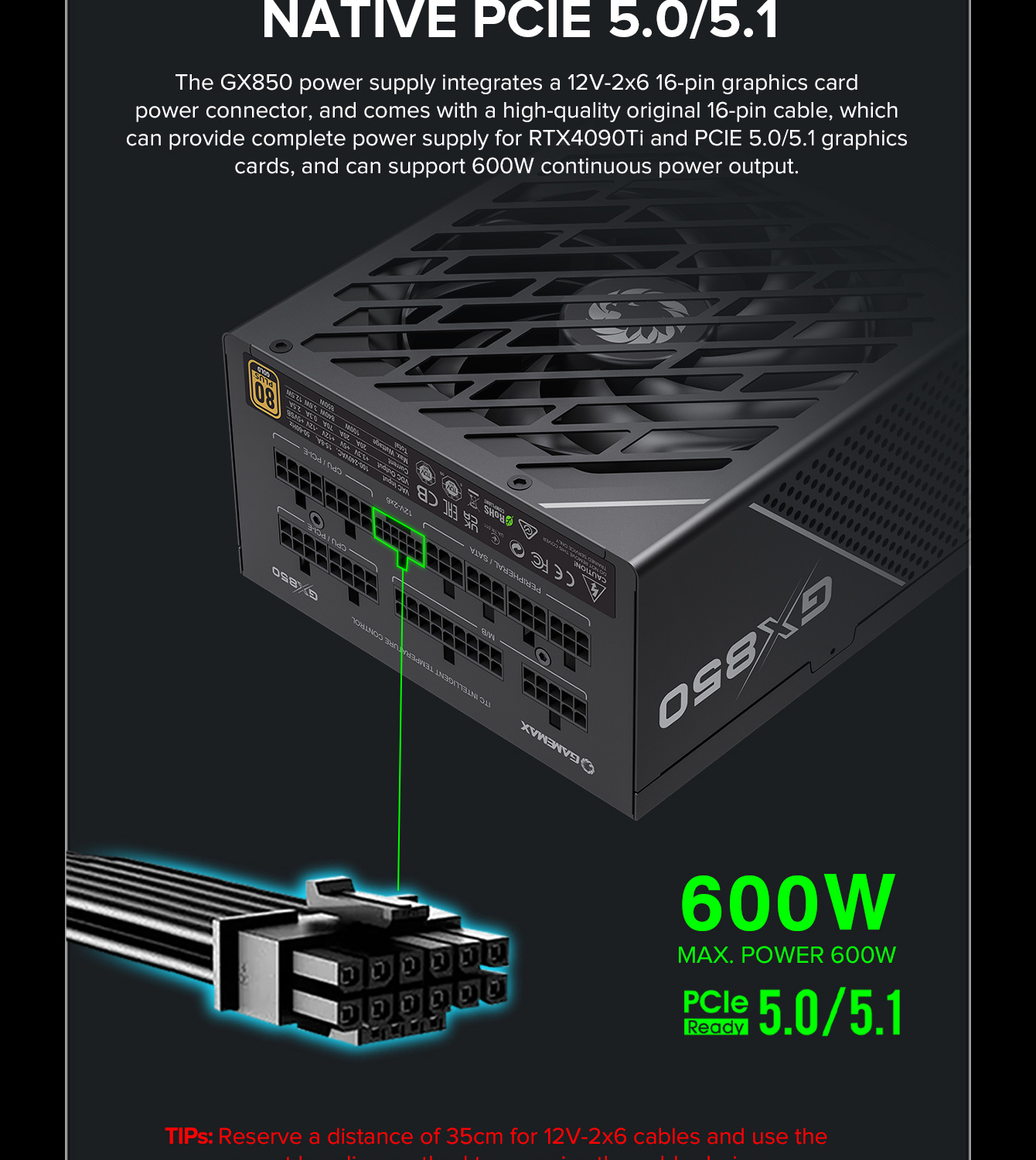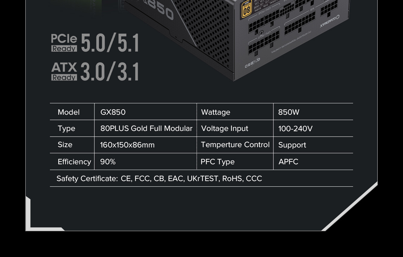 850W 80 Plus Gold ATX3.1 PCIe5.1 power supply with PCIe5.1 12V-2*6 connector for direct RTX™ 40 Series GPU connection, minimizing current loss.