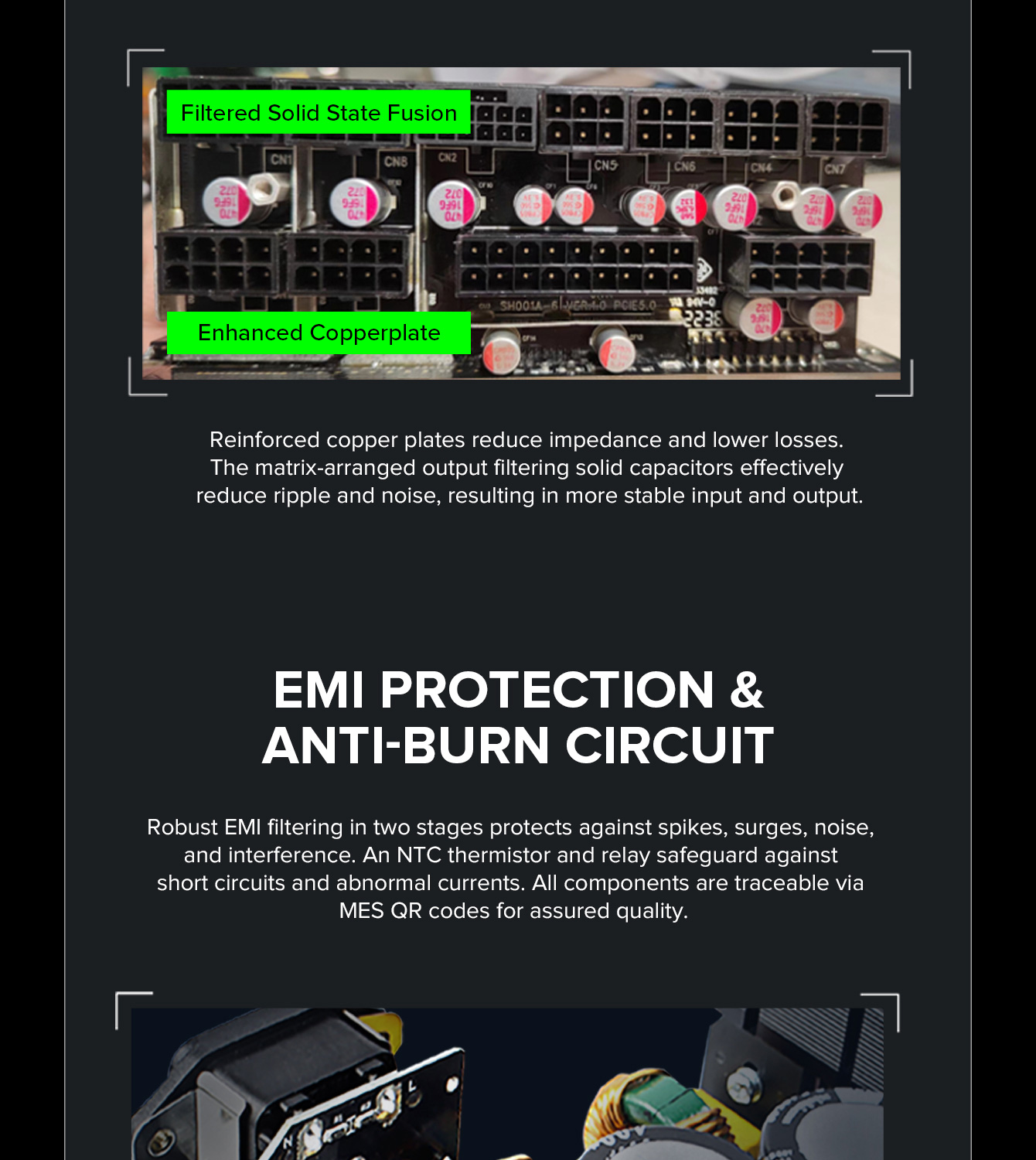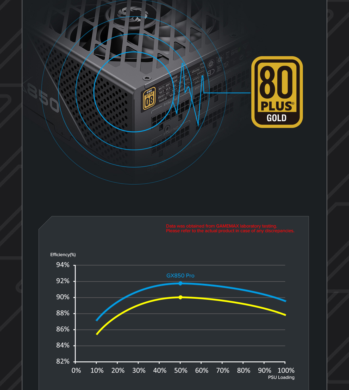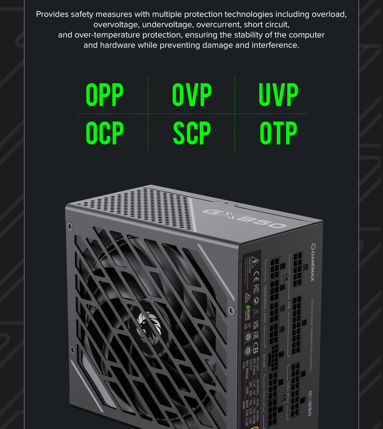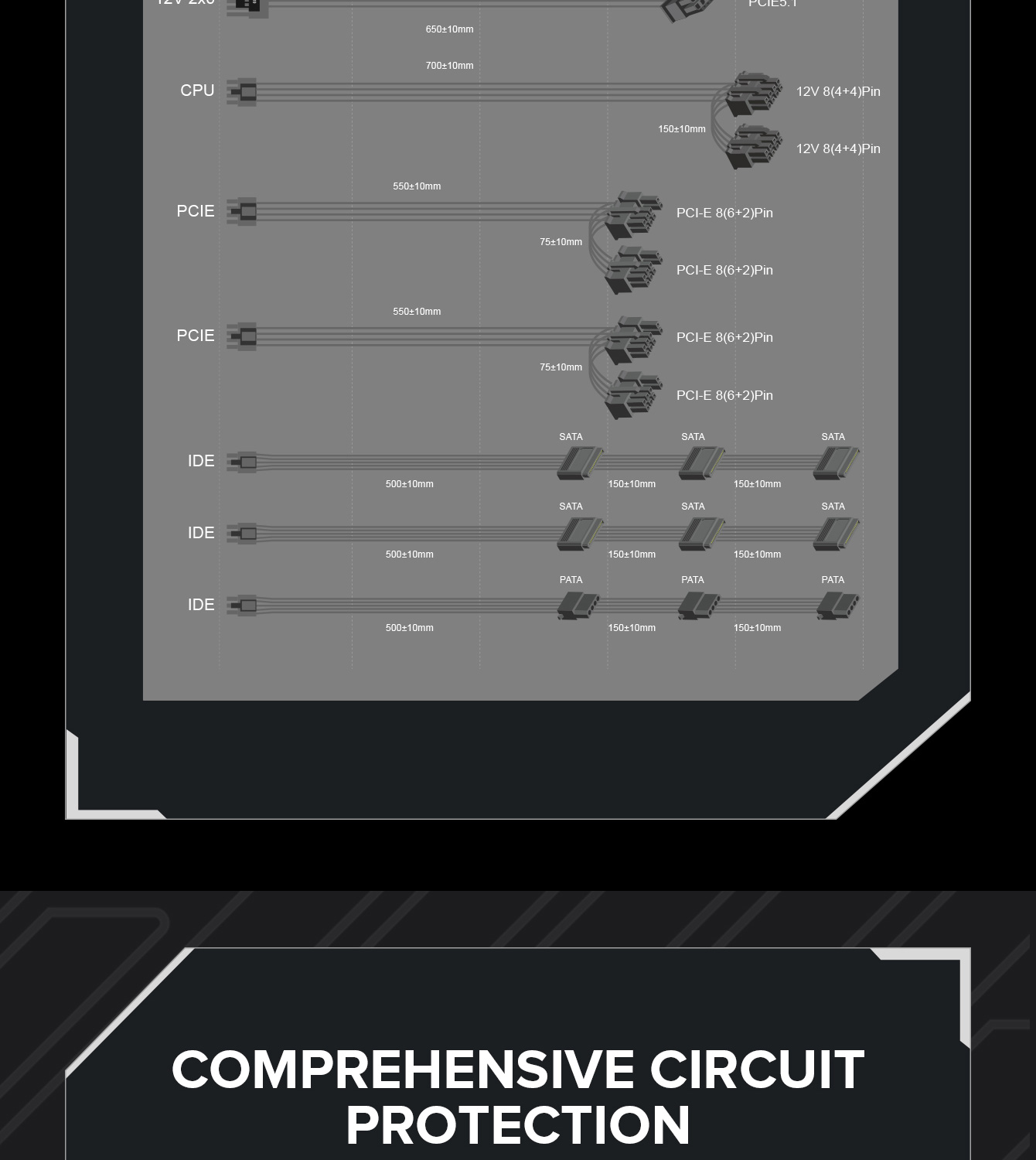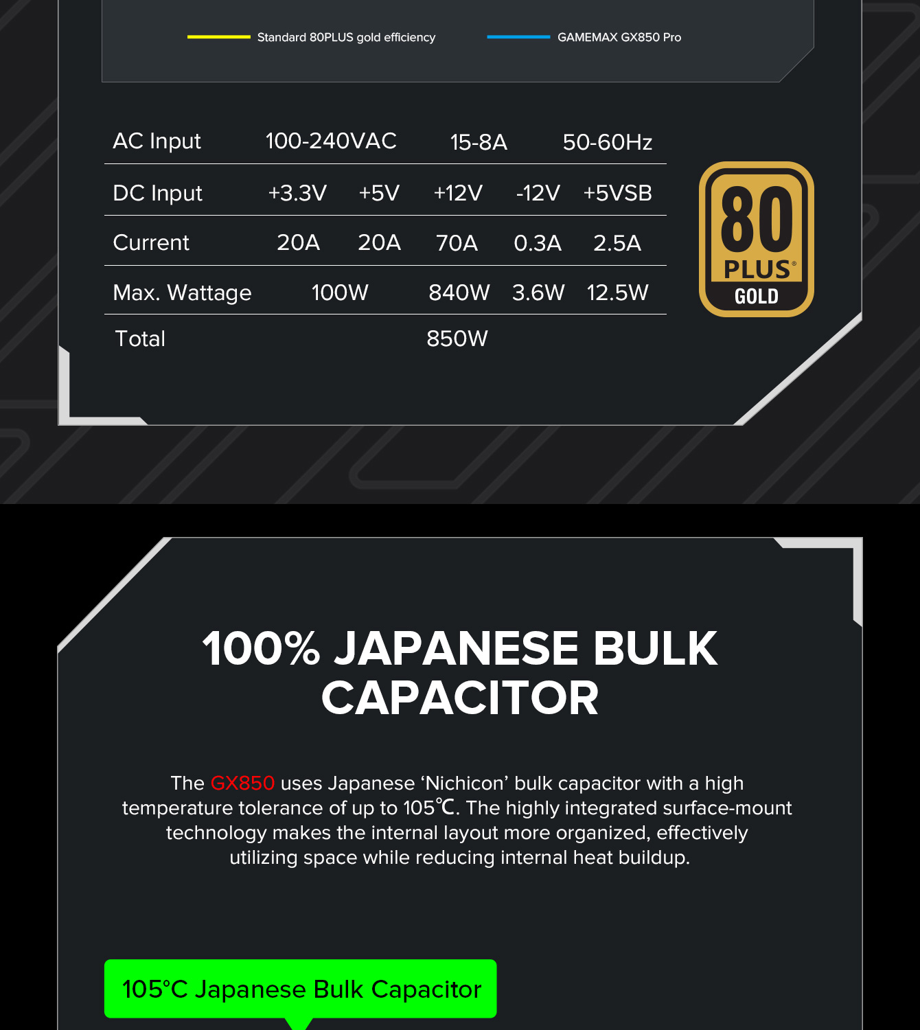 850W 80 Plus Gold ATX3.1 PCIe5.1 power supply with PCIe5.1 12V-2*6 connector for direct RTX™ 40 Series GPU connection, minimizing current loss.
