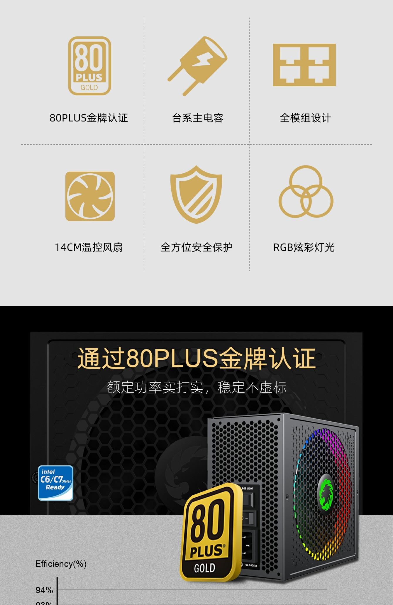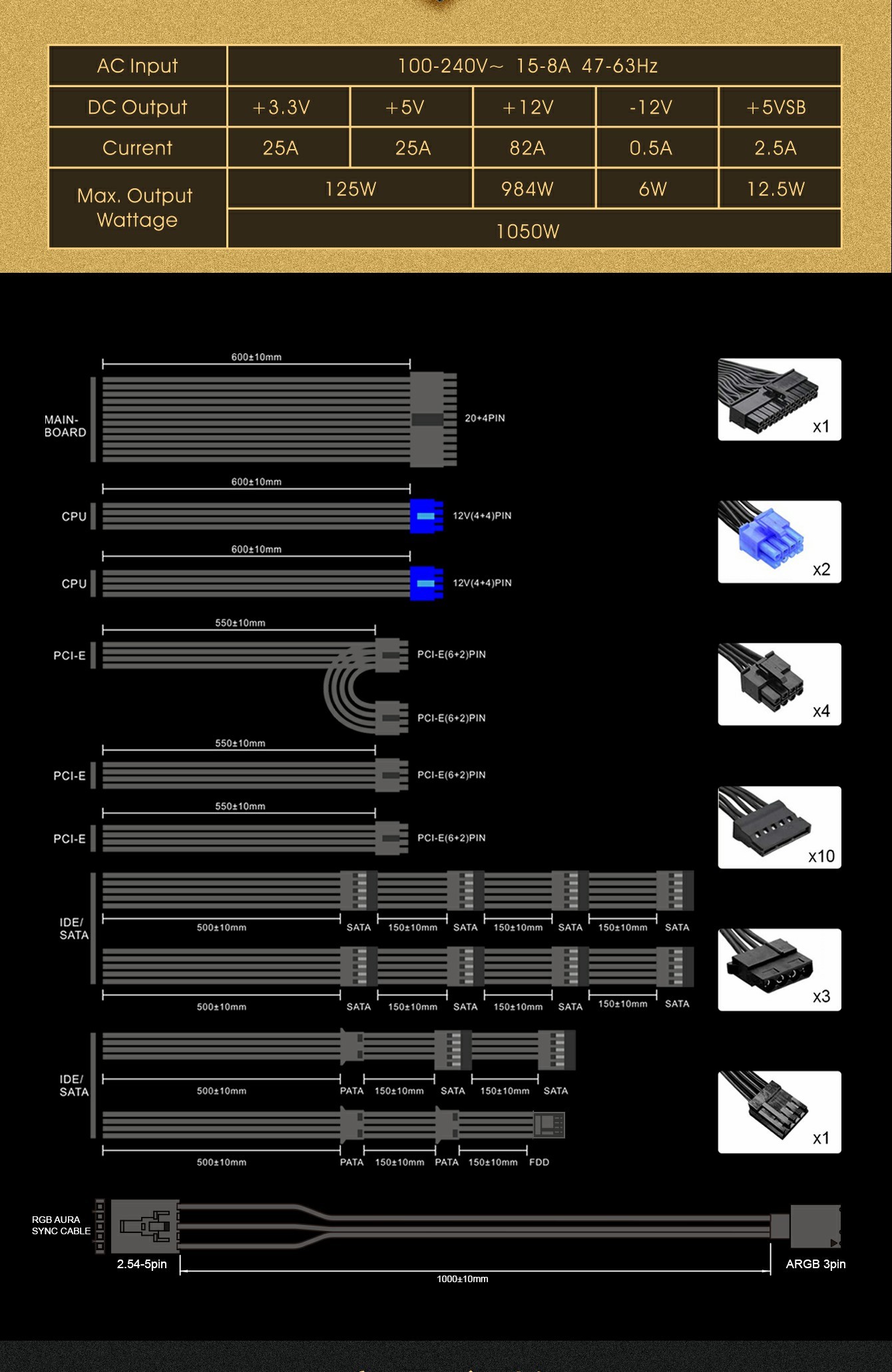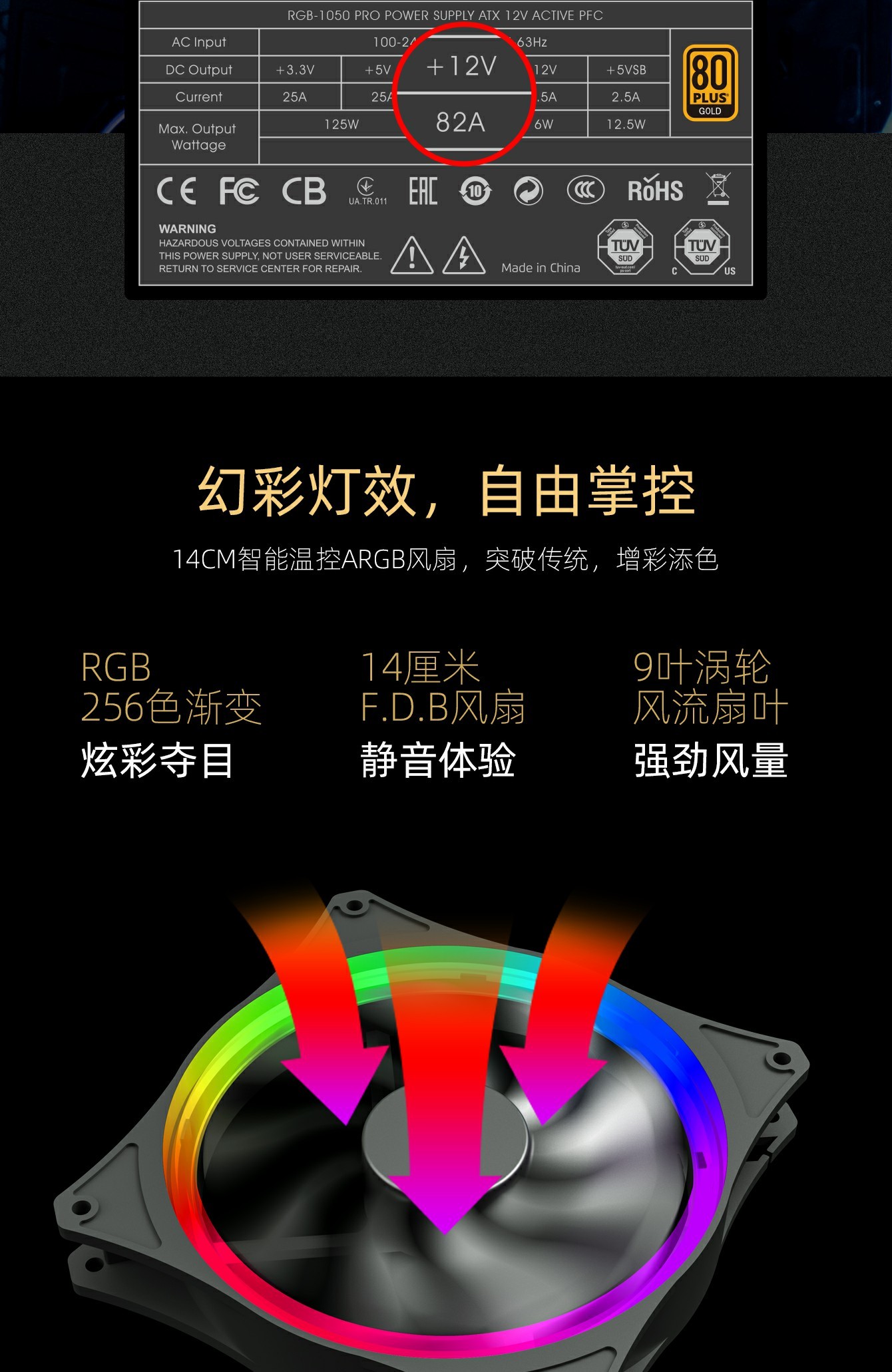 80 Plus 金牌认证:RGB-1050 PRO 在典型负载下具有 90% 或更高的效率。更低的功耗、更低的噪音和更低的温度。