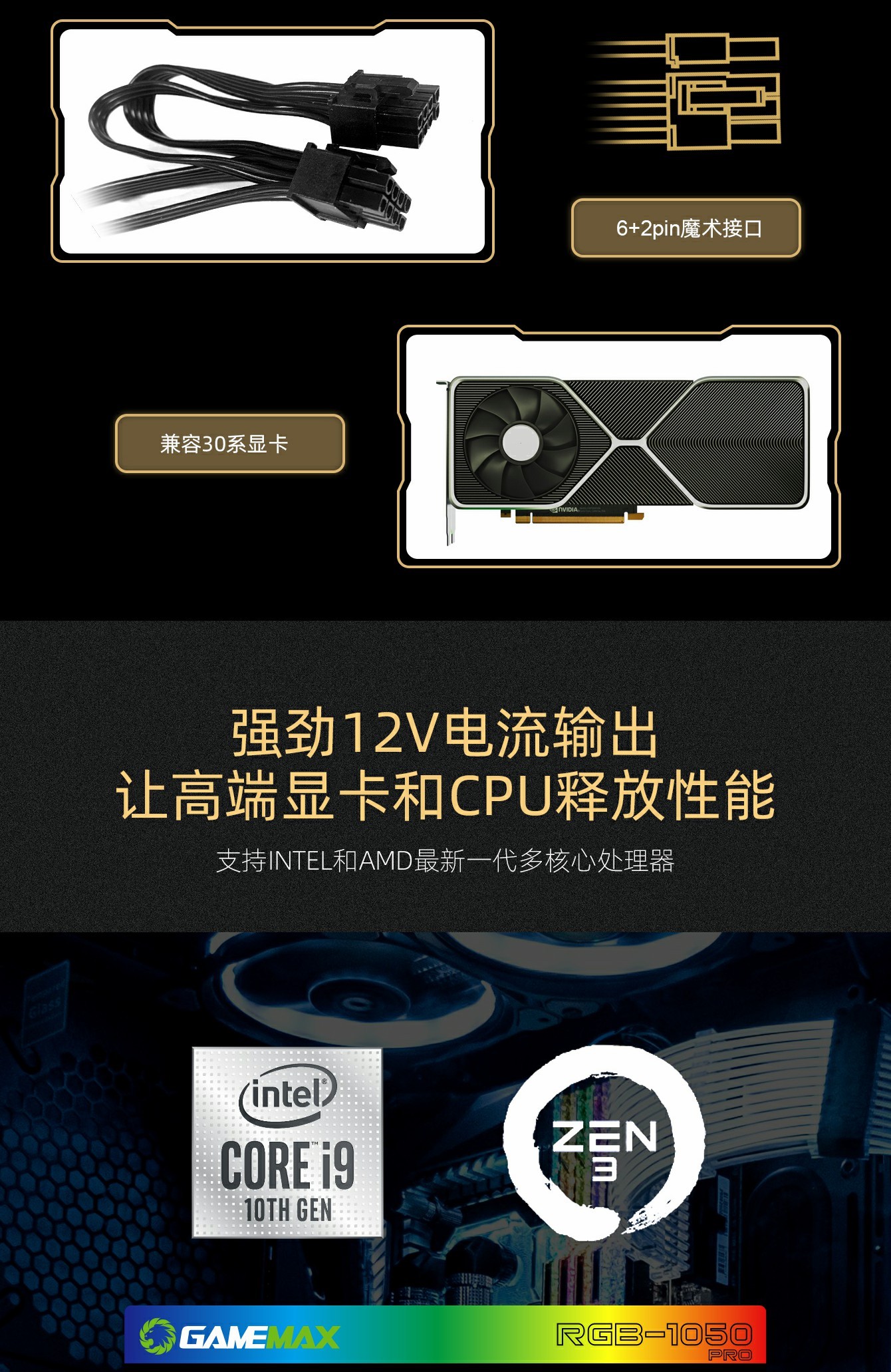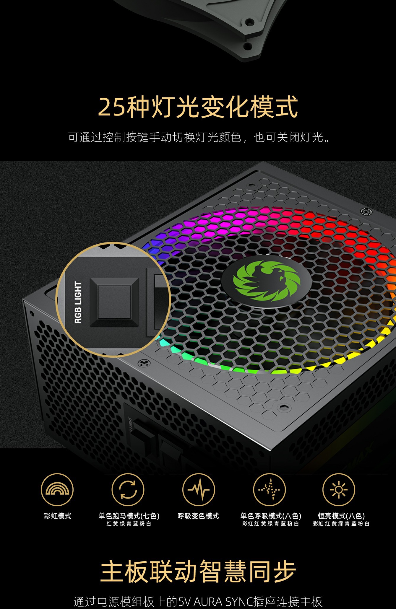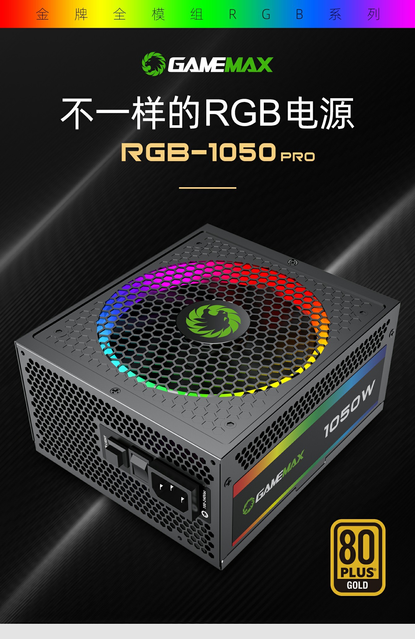 GameMax RGB-1050 PRO, 金牌模组电源,全模块化 LLC+DC-DC 设计,强大的单路 +12V 输出设计有助于确保稳定,并可靠地为其他 PC 组件供电。配备 140 毫米 ARGB 风扇有助于提供更明亮和令人惊叹的灯光效果,支持与华硕、技嘉、微星和华擎兼容的 RGB 主板同步,提供无数照明可能性。