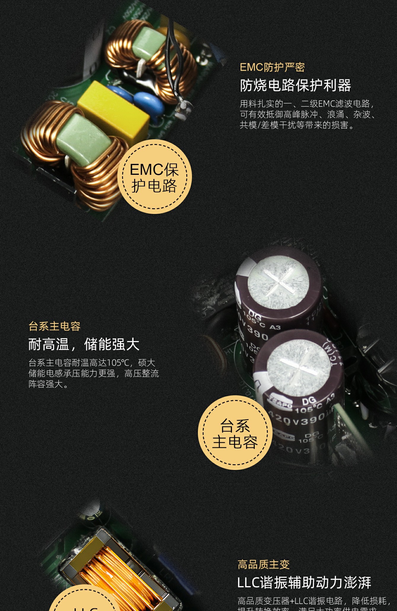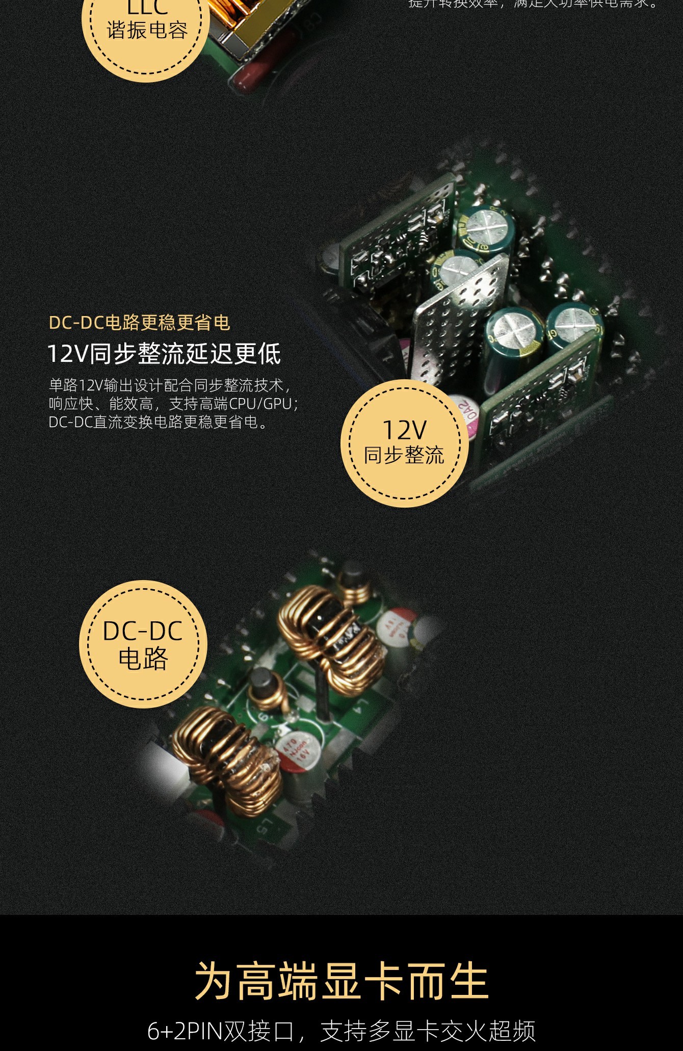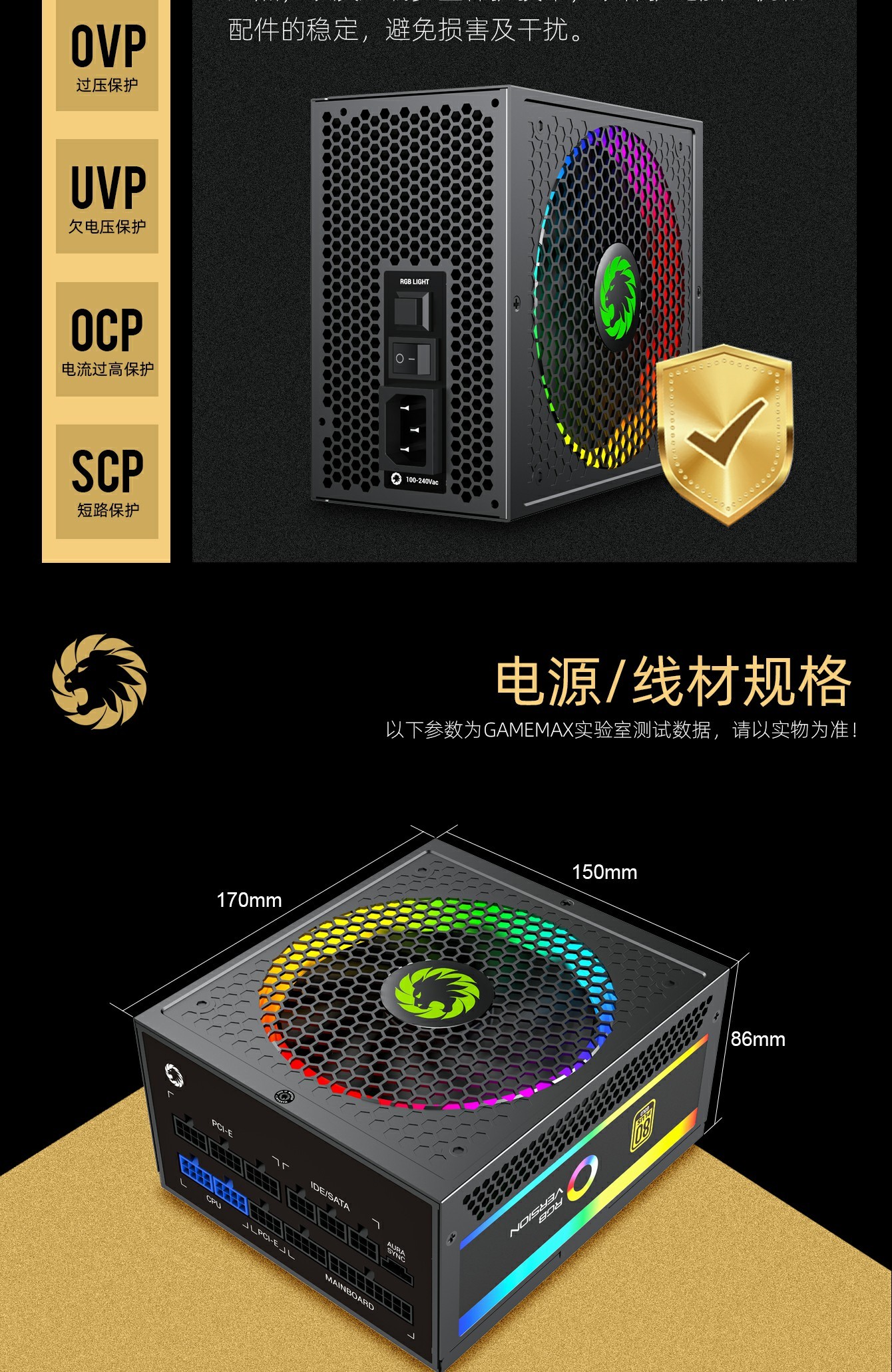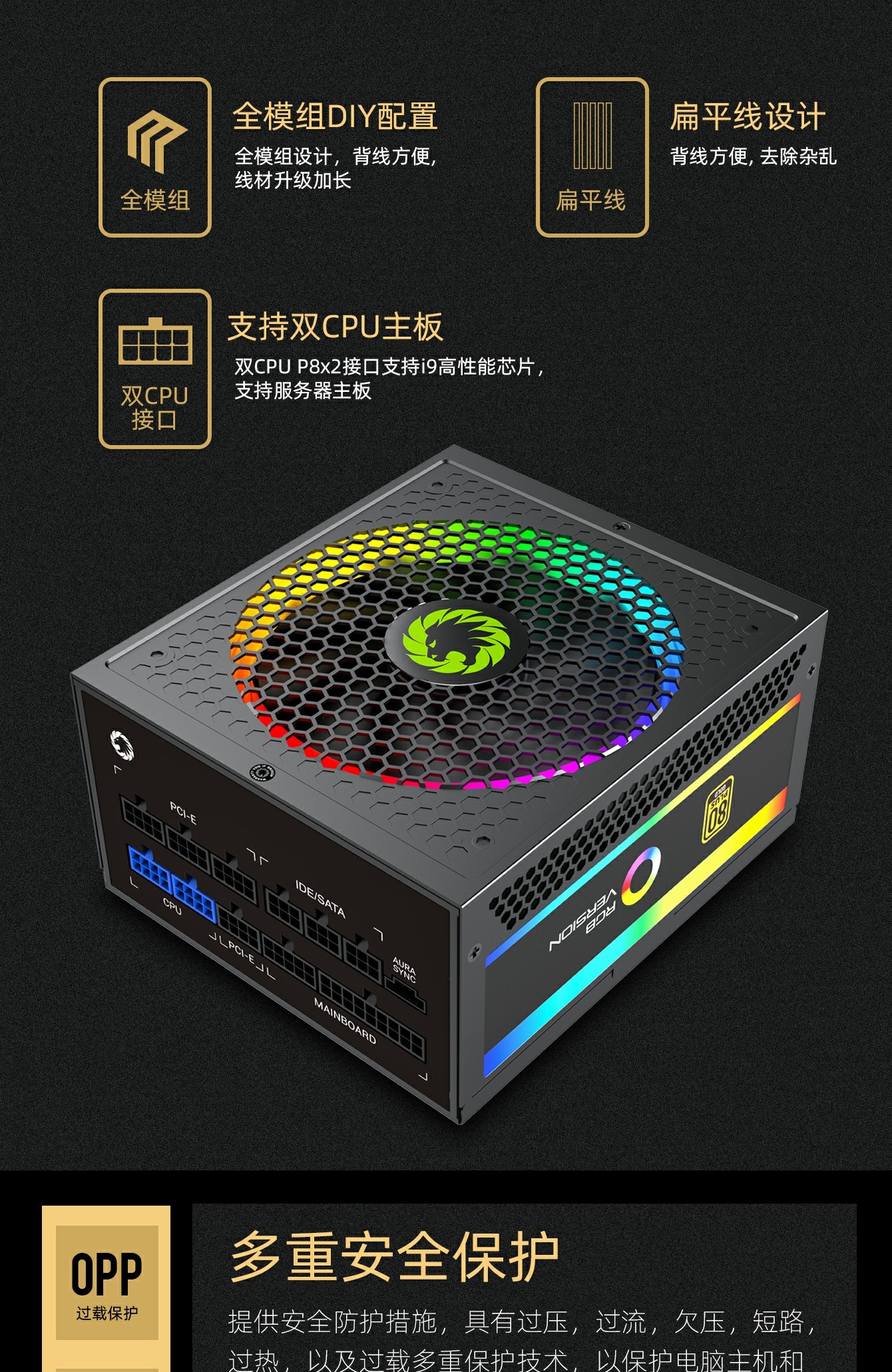 输出与保护:强大的+12V单轨提供稳定的直流输出,支持高端显卡和PC系统。优秀的电容器提供稳定性、耐用性和可靠性,包括 OPP/OVP/UVP/SCP/OCP 电气保护。