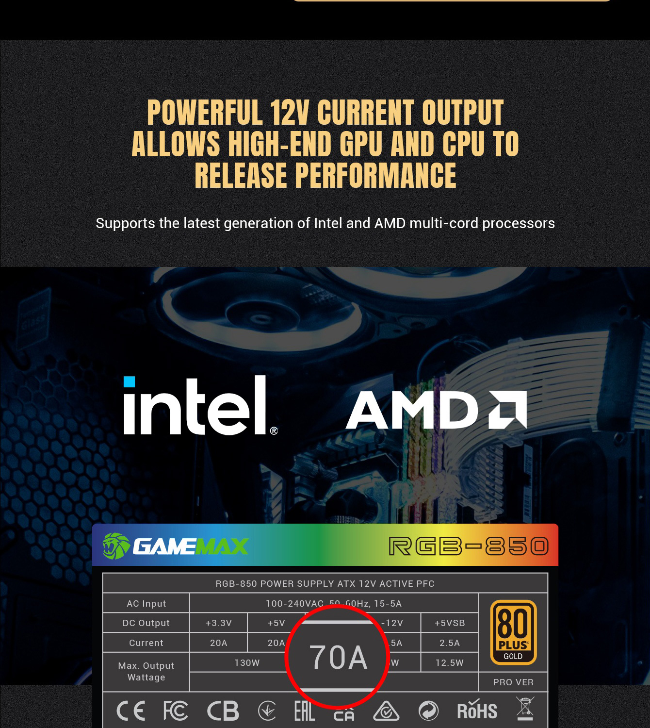 GameMax RGB-850 PRO Fully Modular 80+ Gold Certified,12V SYNC Rectification design for Powerful single +12V rail helps ensure a stable and reliable supply to other PC components
