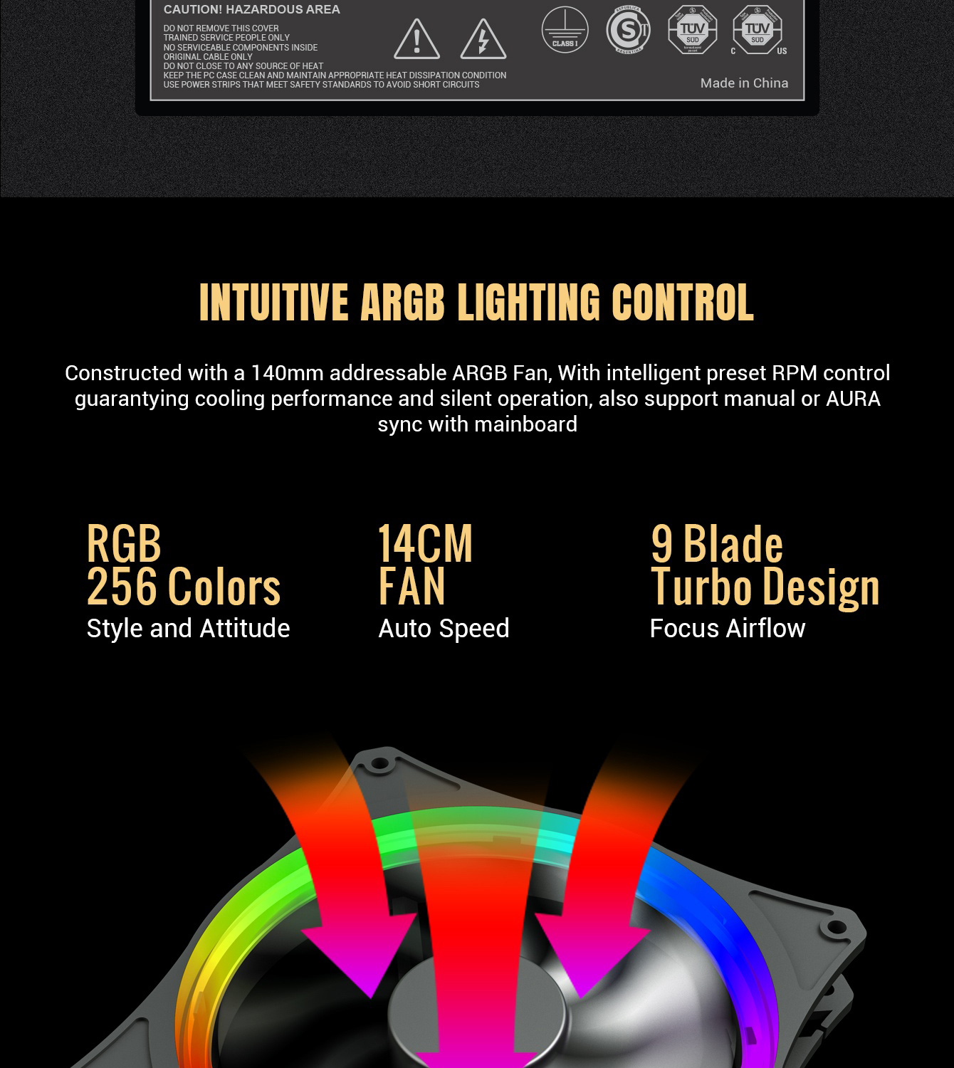 • With 140mm ARGB fan helps deliver brighter and stunning light effect and supports synchronization with compatible RGB motherboards from ASUS, GIGABYTE, MSI, and ASRock for countless illumination possibilities.