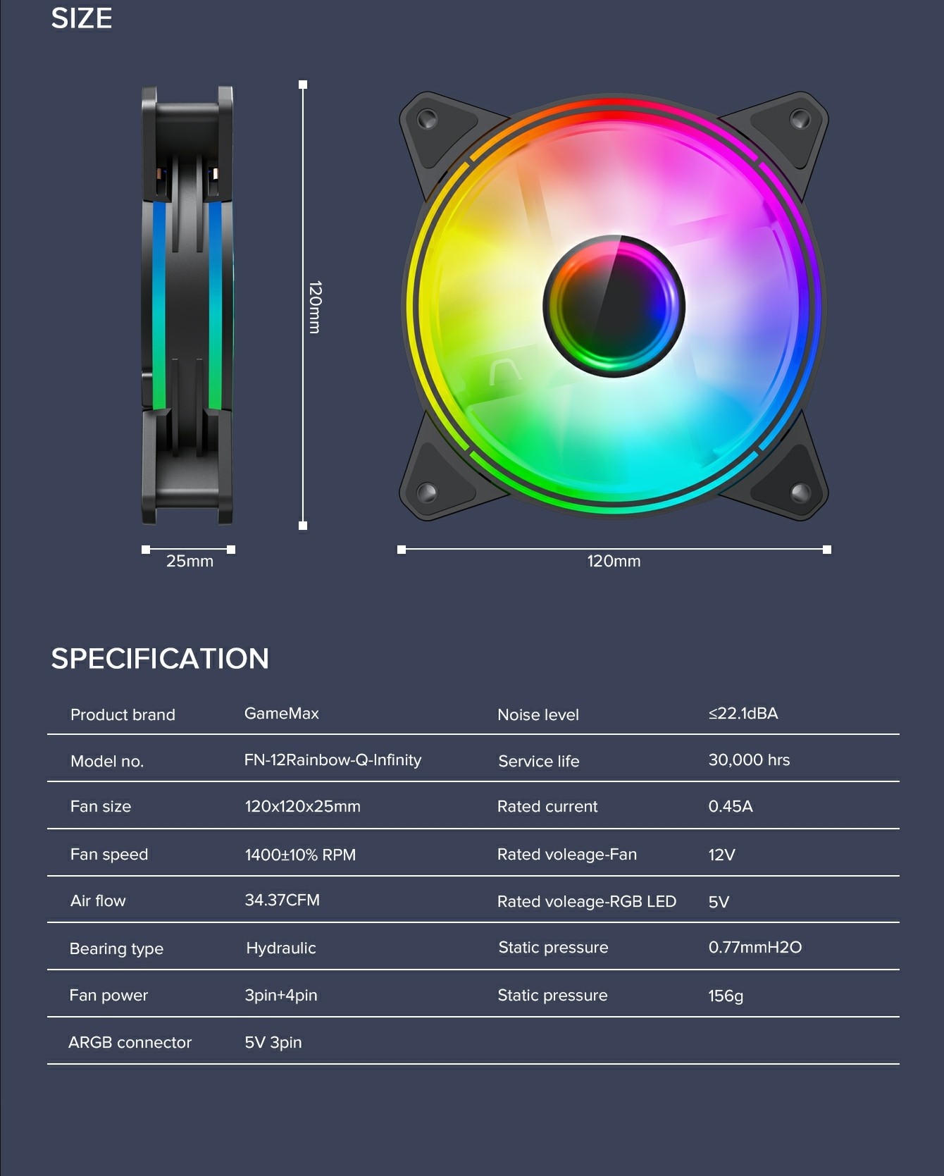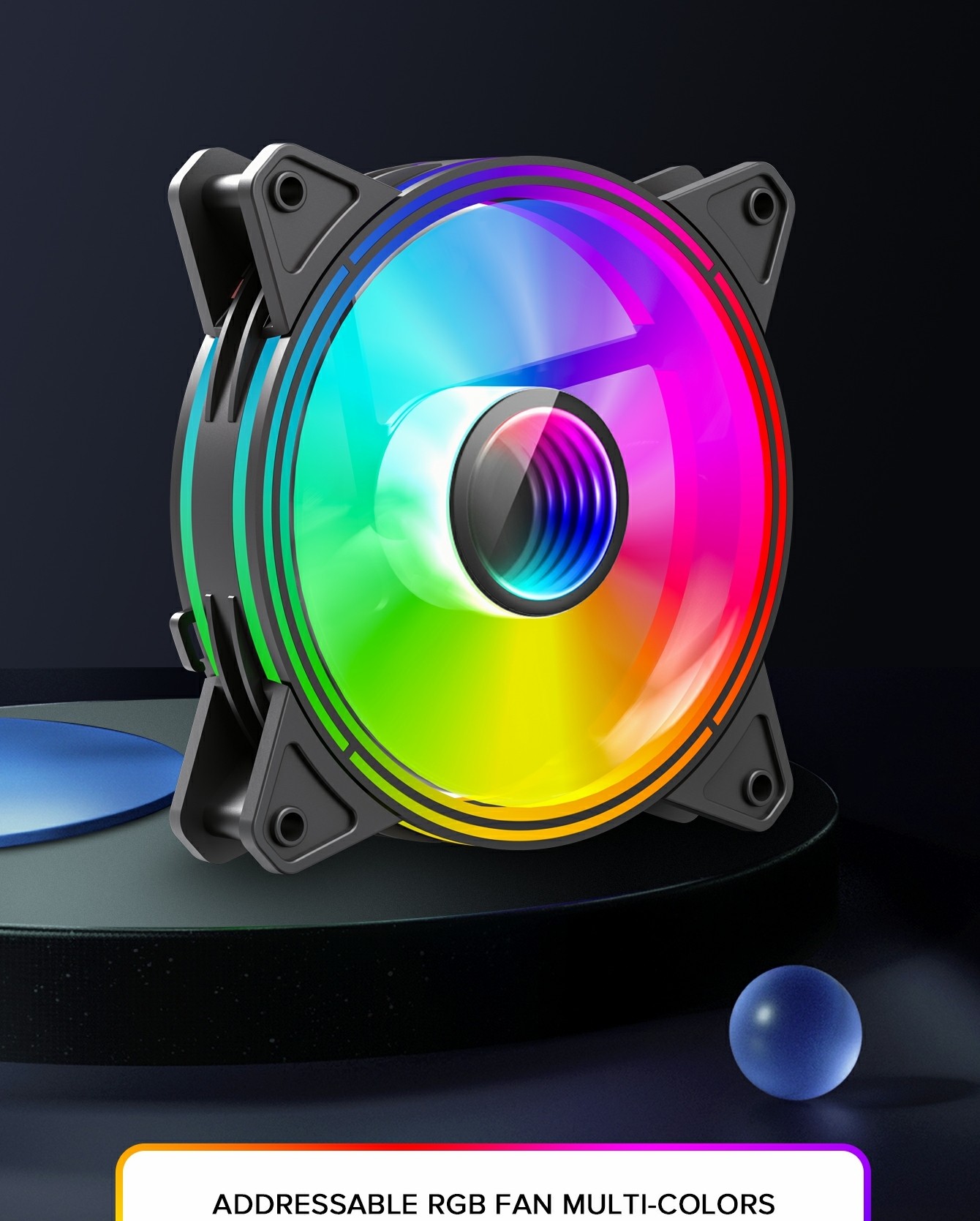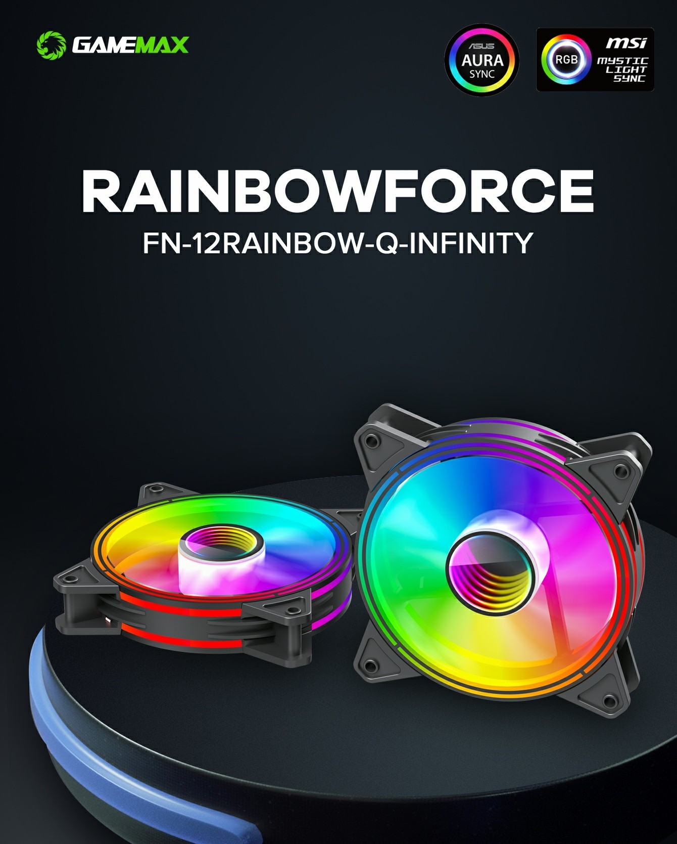 The FN-12Rainbow-Q-Infinity is a stylish 120mm fan featuring a striking outer quad-ring light and an infinity mirror center effect, delivering vibrant ARGB lighting.