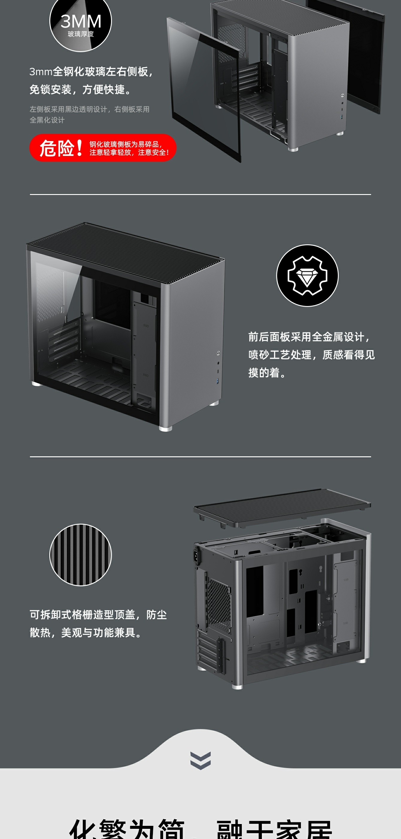 玻璃侧板及镂空侧板互换设计,提供额外的散热气流通道