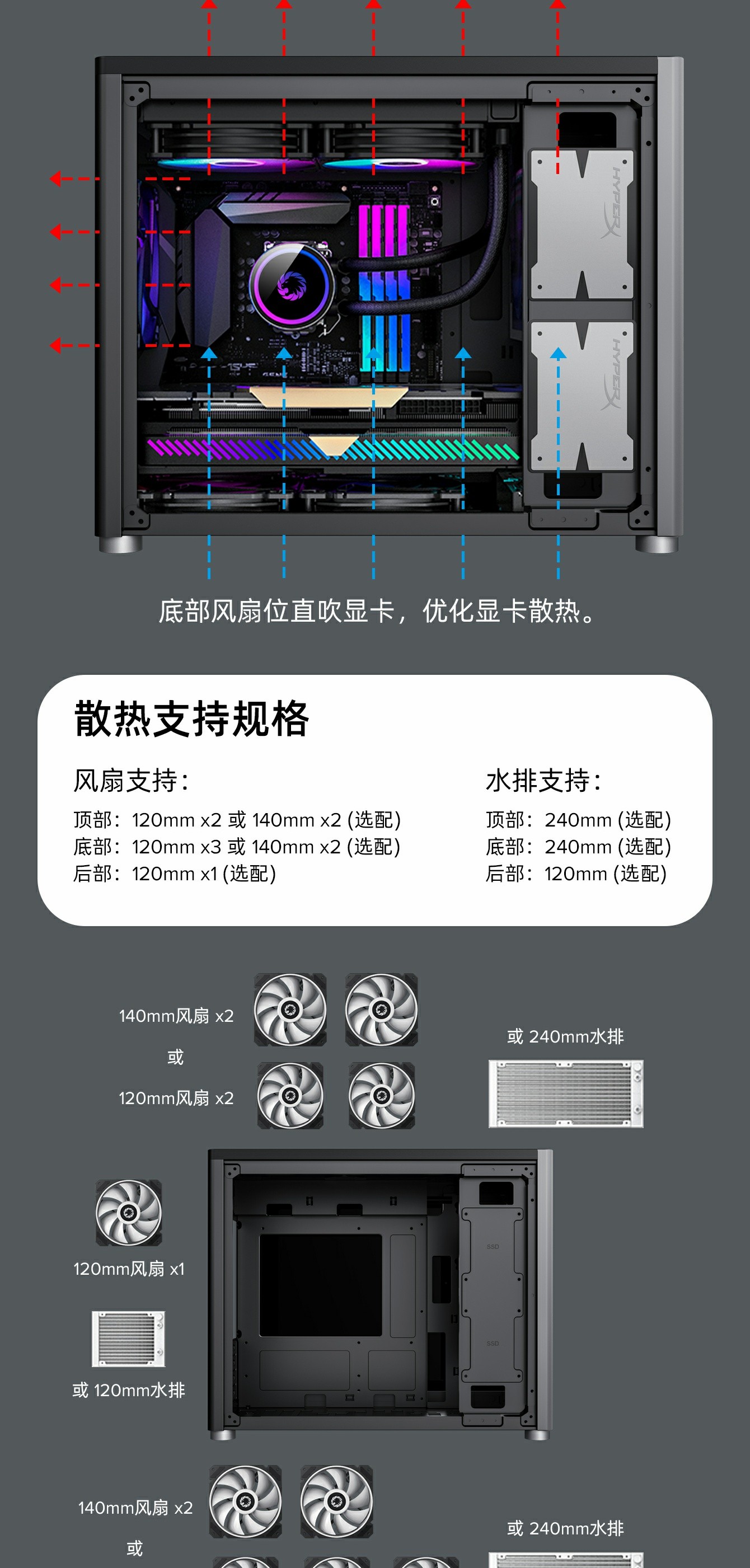 底部风扇位直吹显卡,优化显示散热