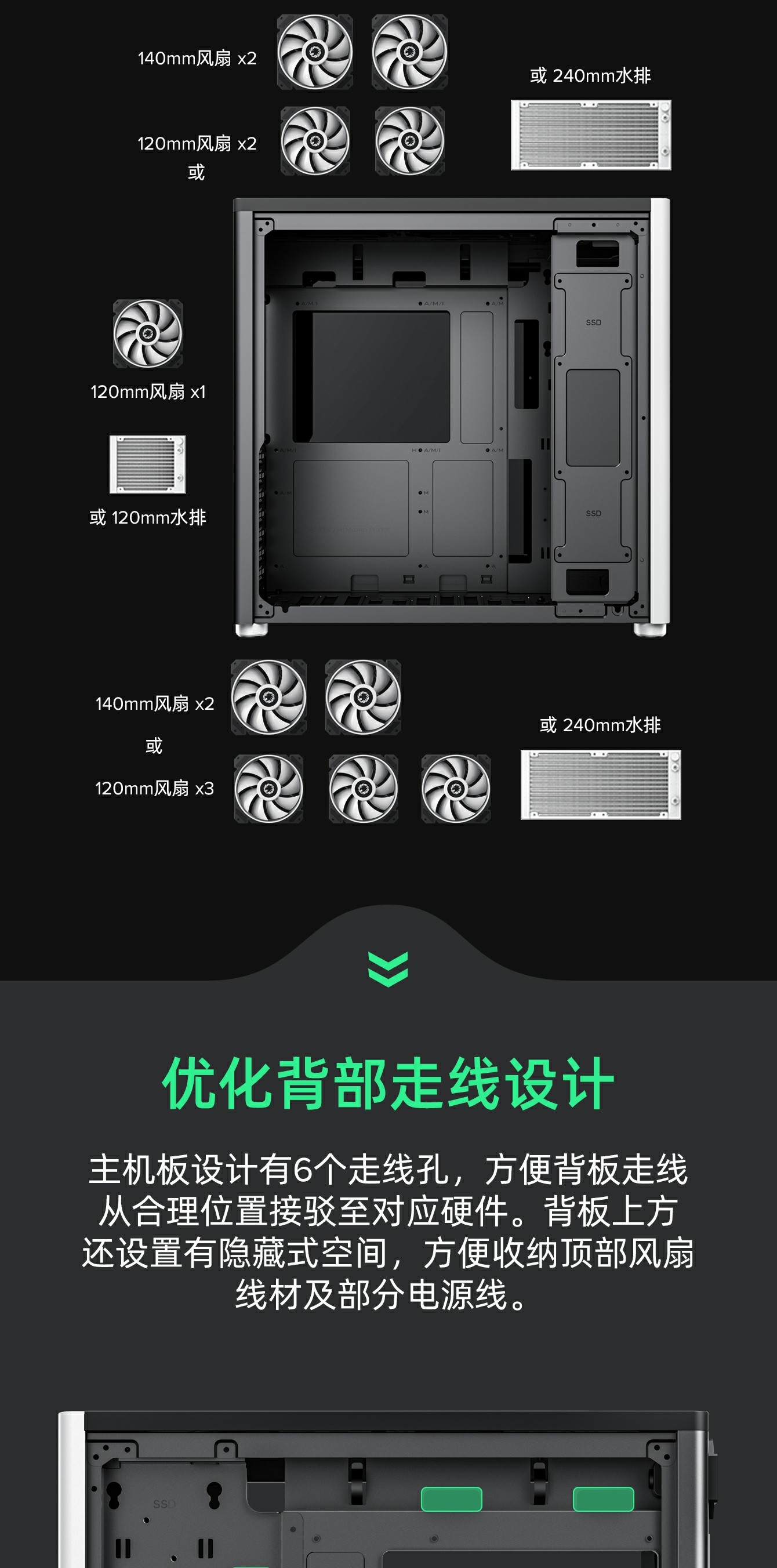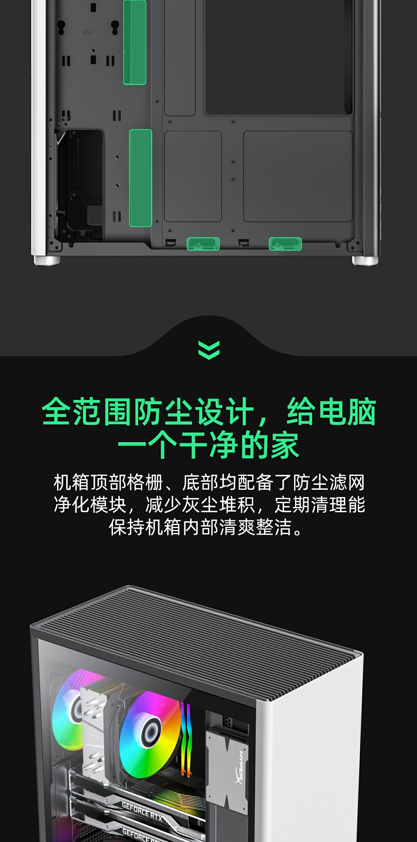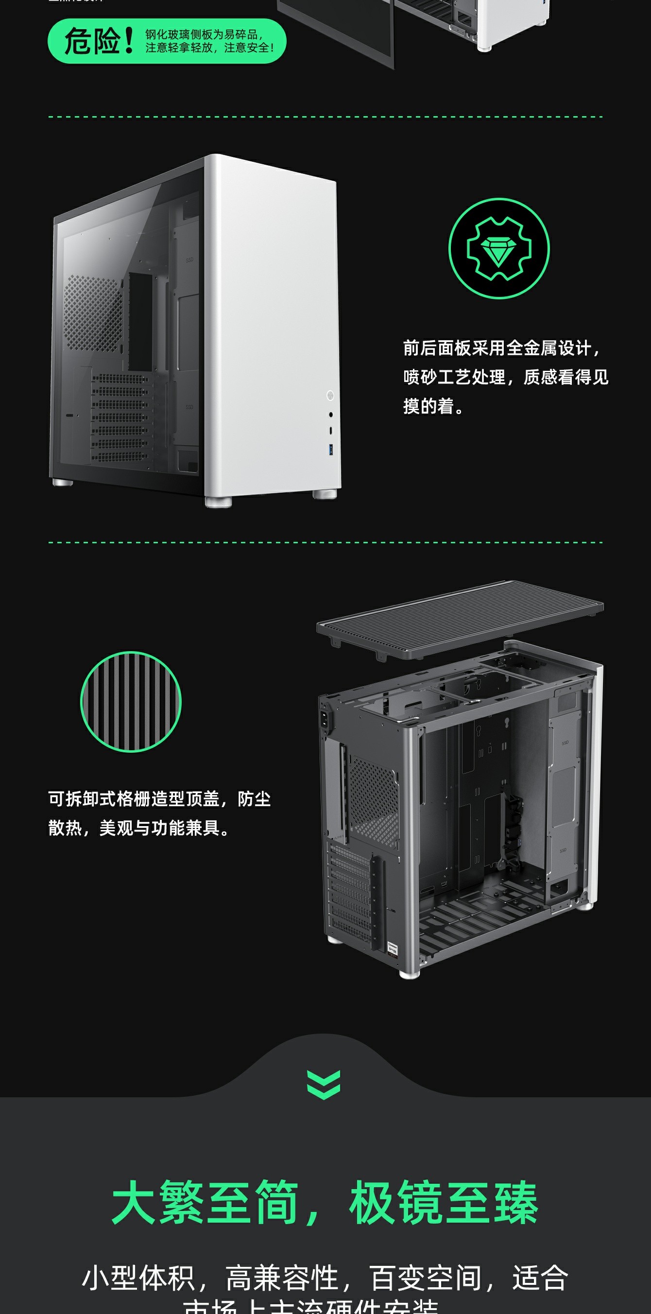 玻璃侧板及镂空侧板互换设计,提供额外的散热气流通道