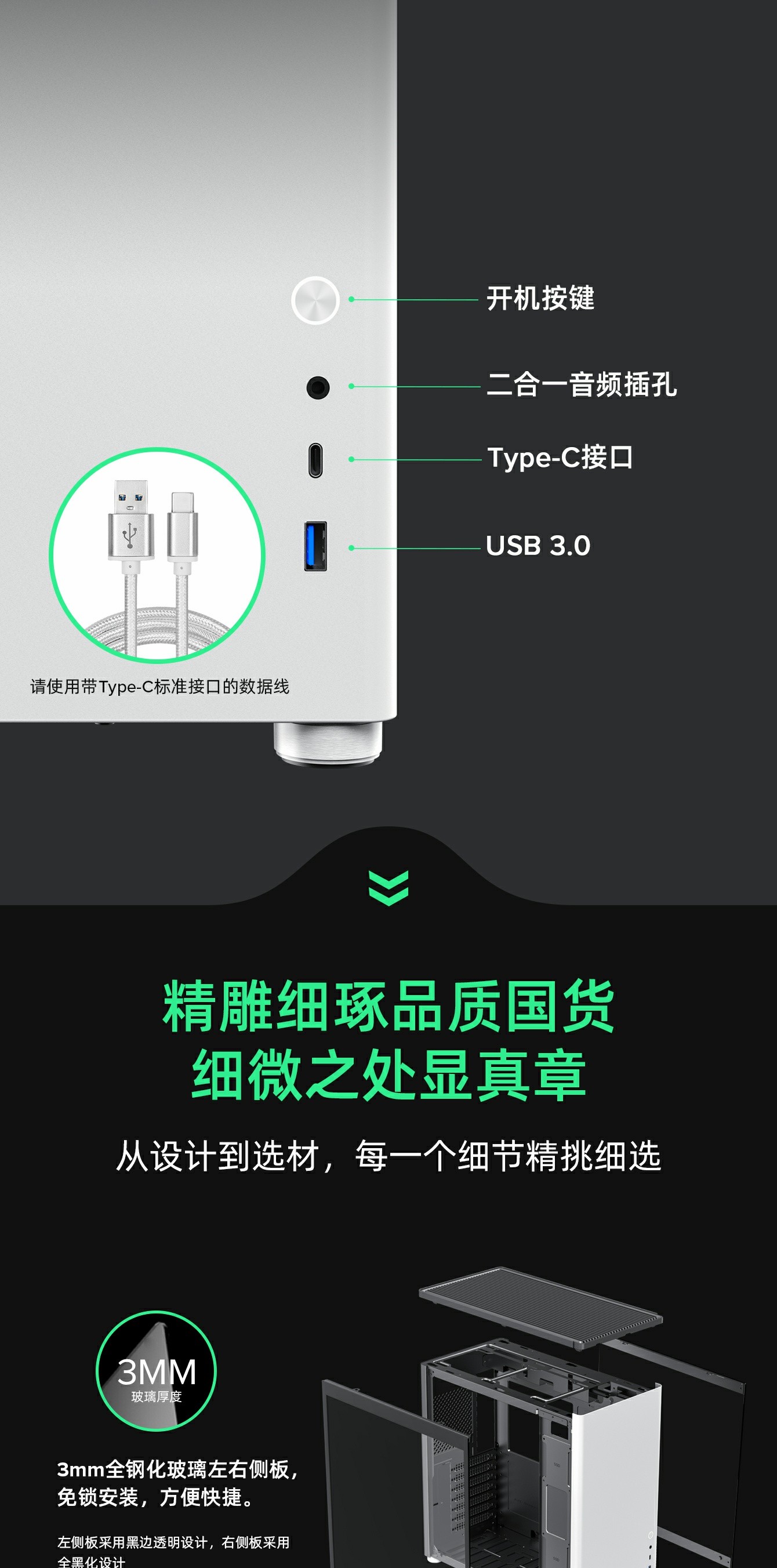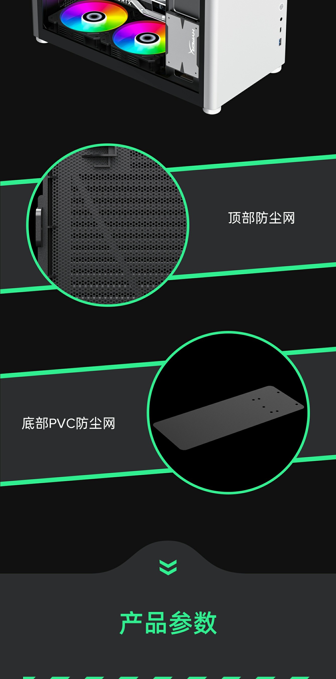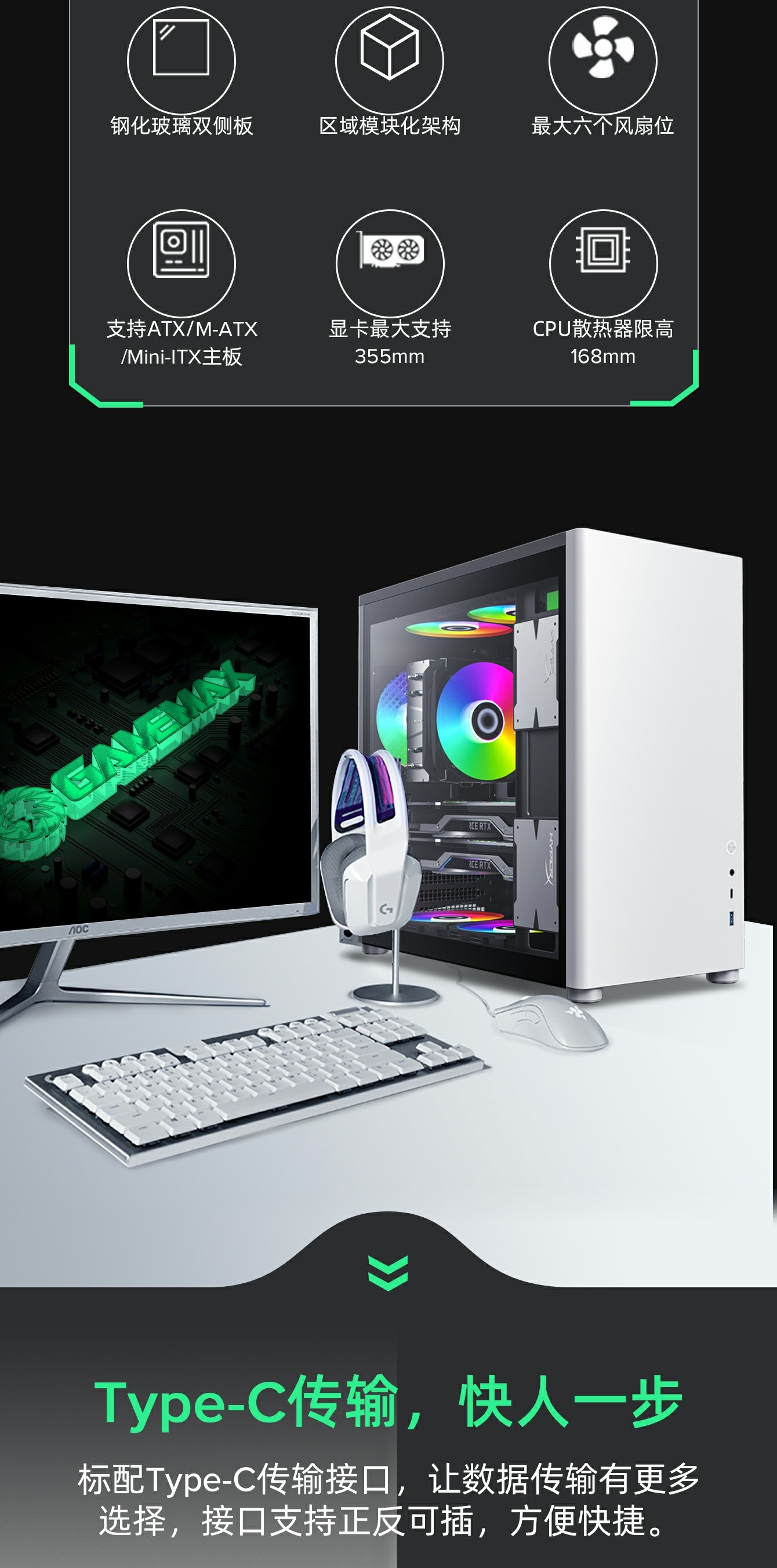 玻璃侧板及镂空侧板互换设计,提供额外的散热气流通道