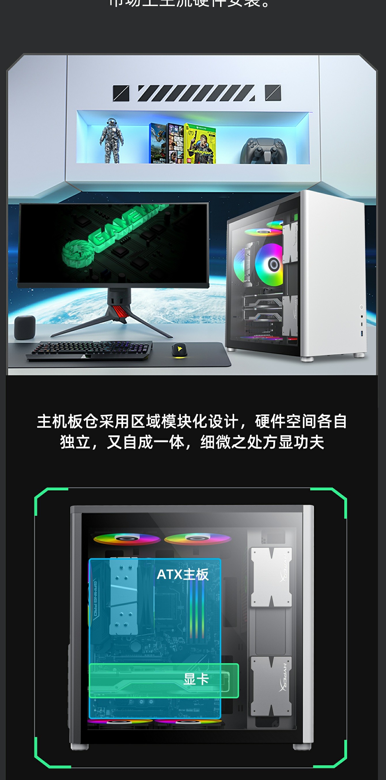 主机板仓采用区块模块化设计,优化线材管理,充分利用内部空间。