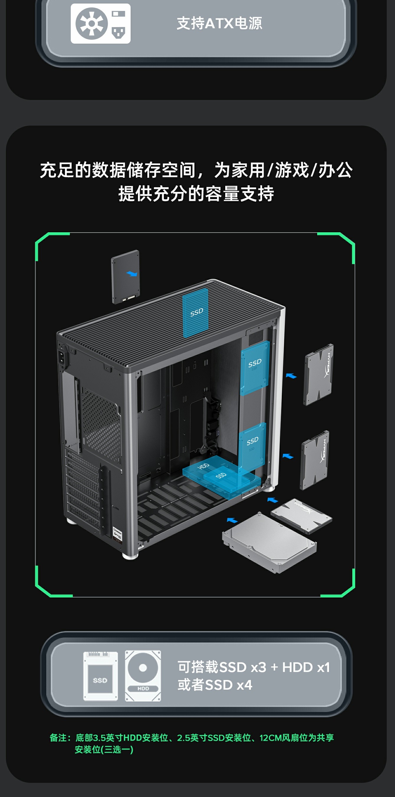 硬盘3.5" (HDD)3.5" x 1+SSDx 3 or SSD*4