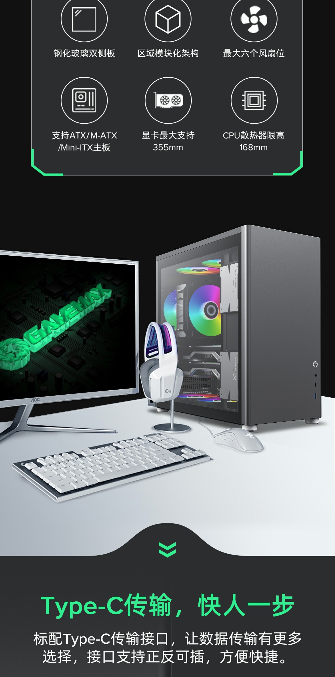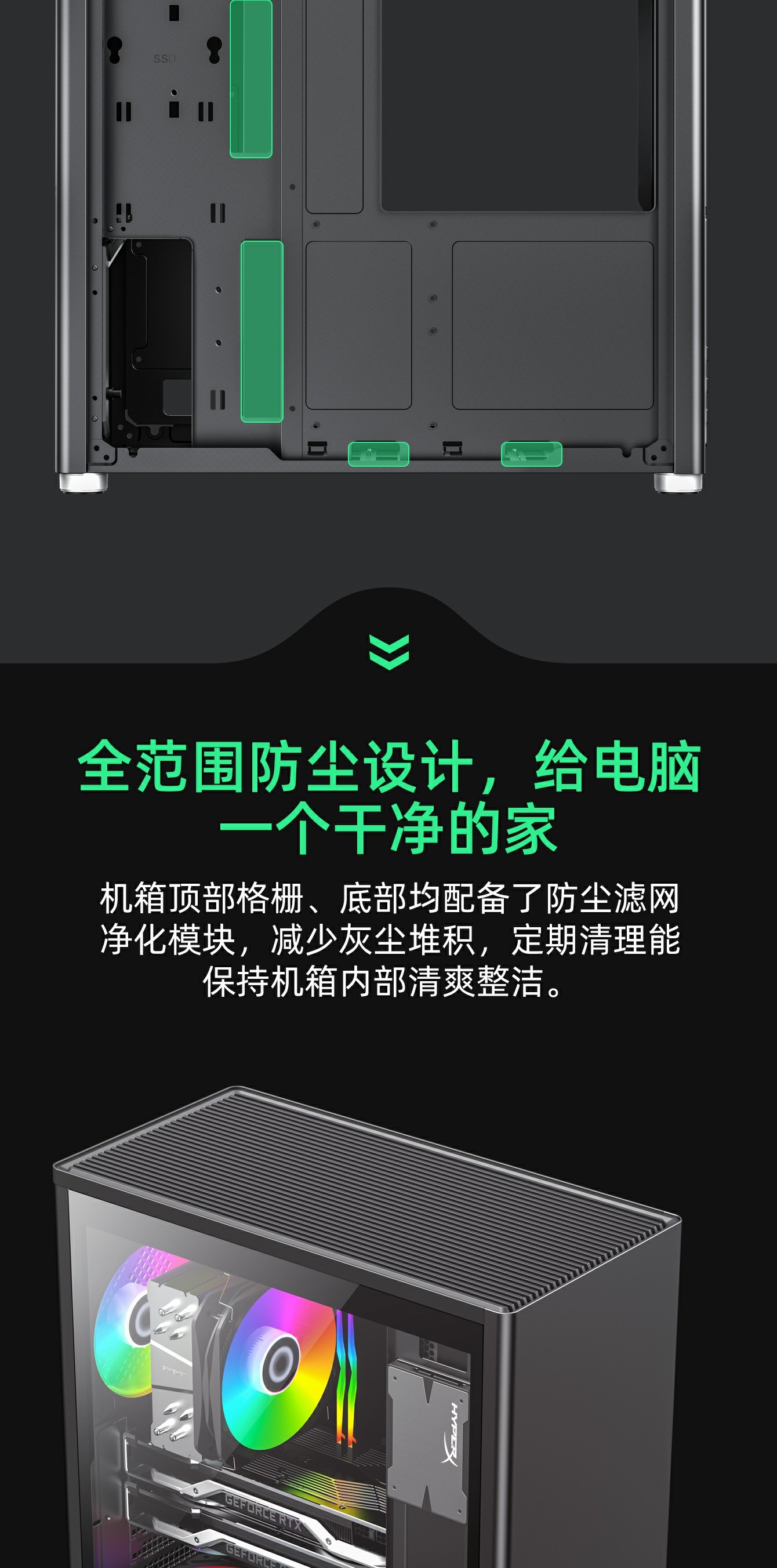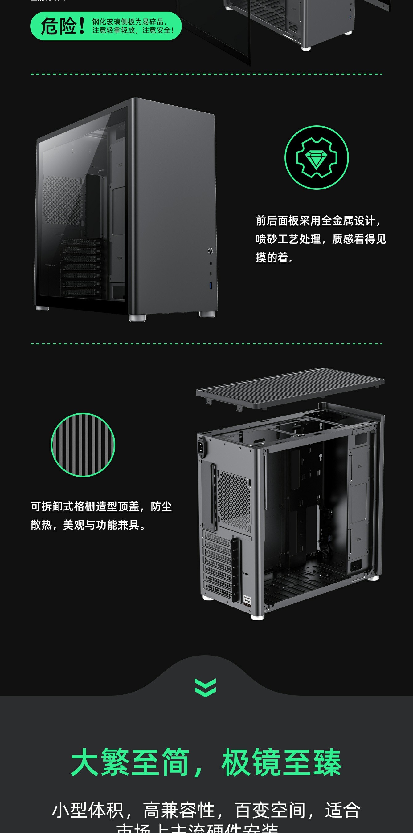 玻璃侧板及镂空侧板互换设计,提供额外的散热气流通道