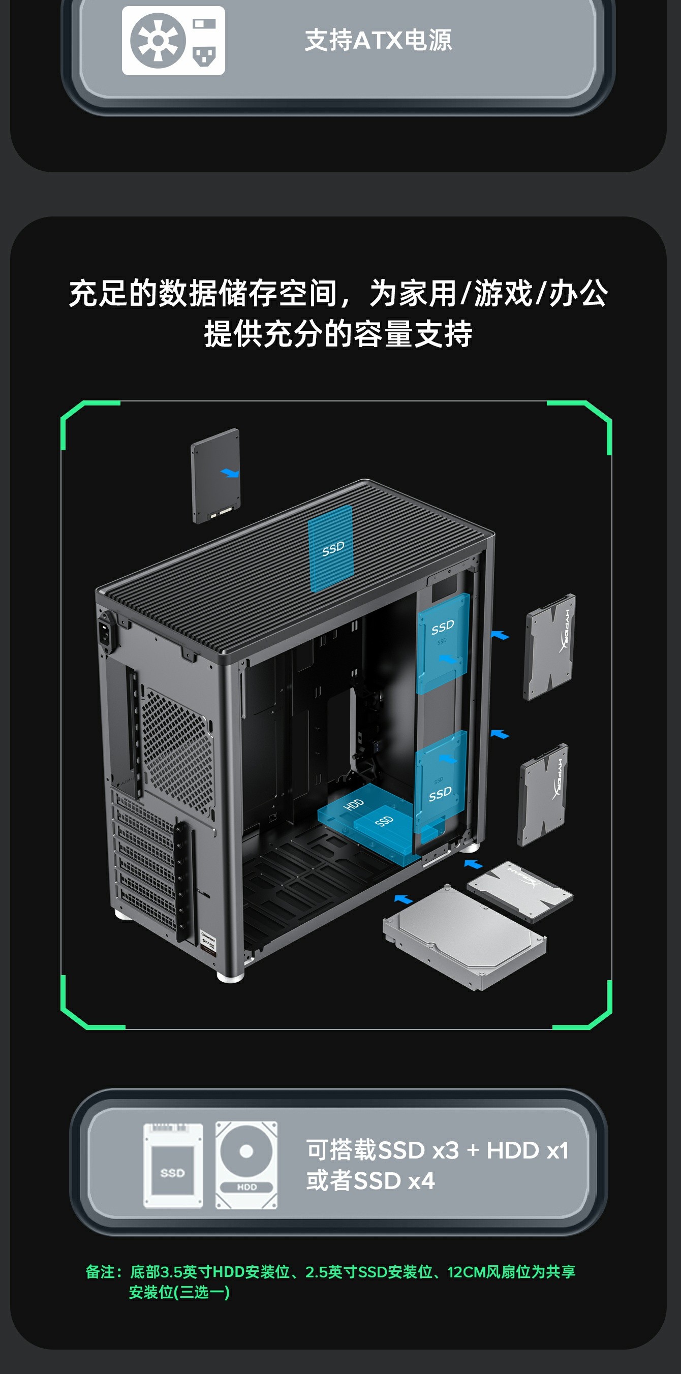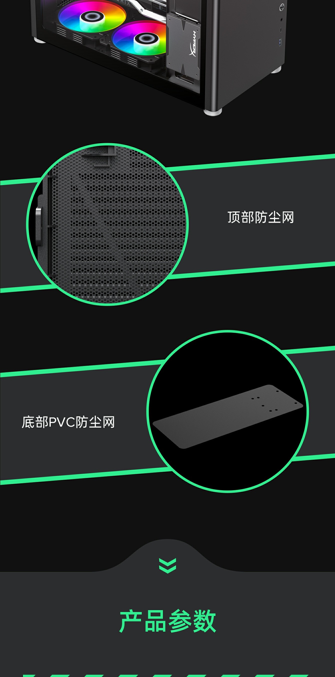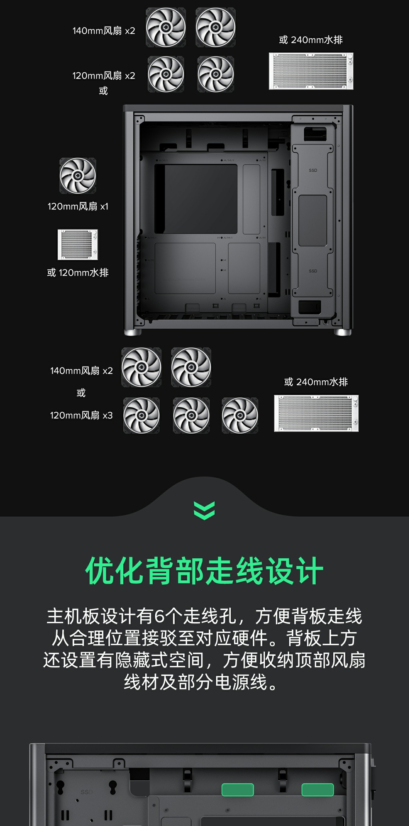 玻璃侧板及镂空侧板互换设计,提供额外的散热气流通道