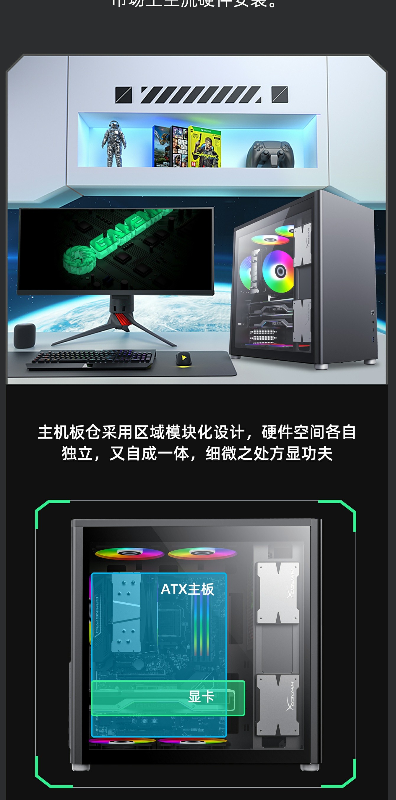 主机板仓采用区块模块化设计,优化线材管理,充分利用内部空间。