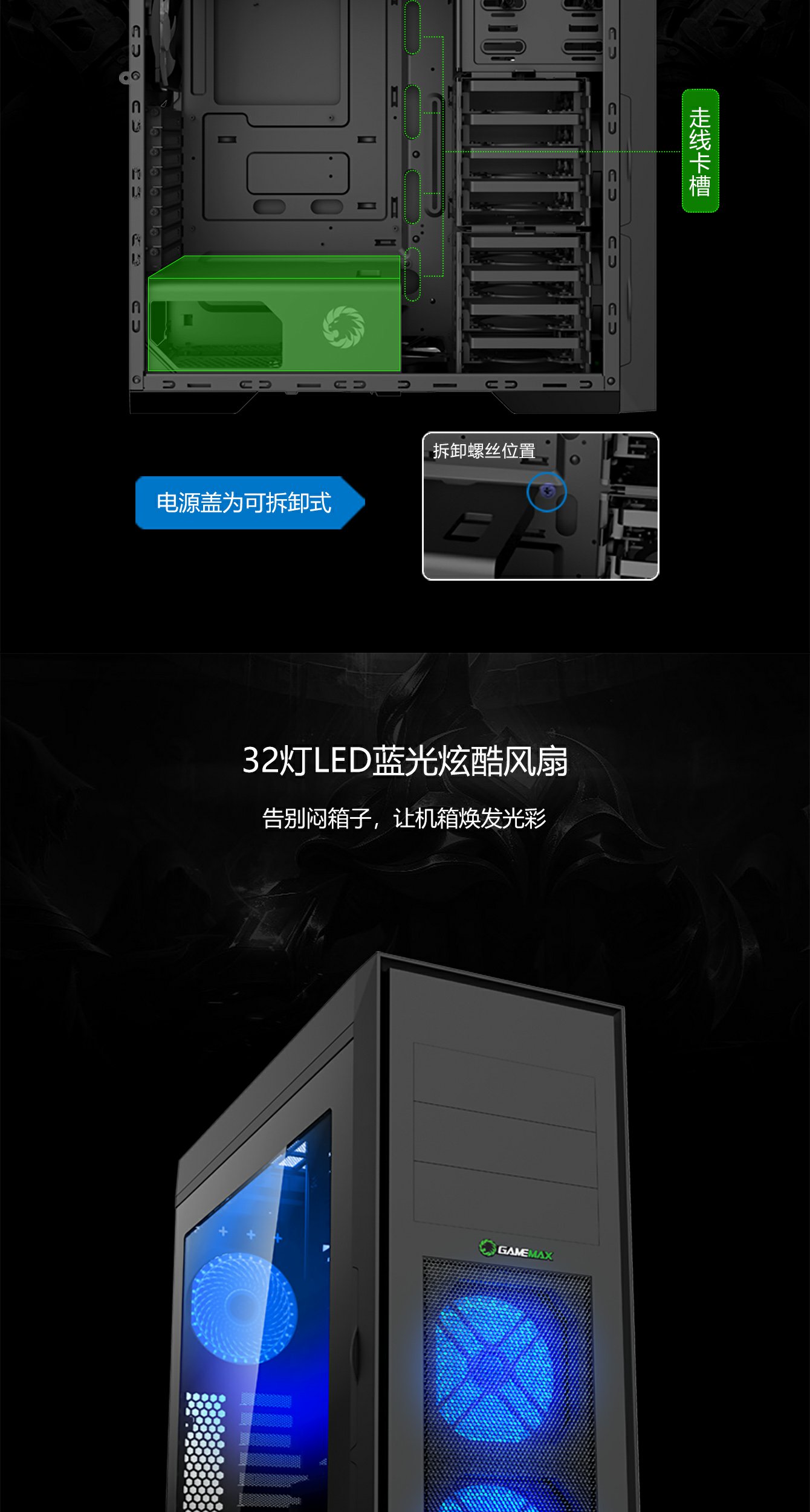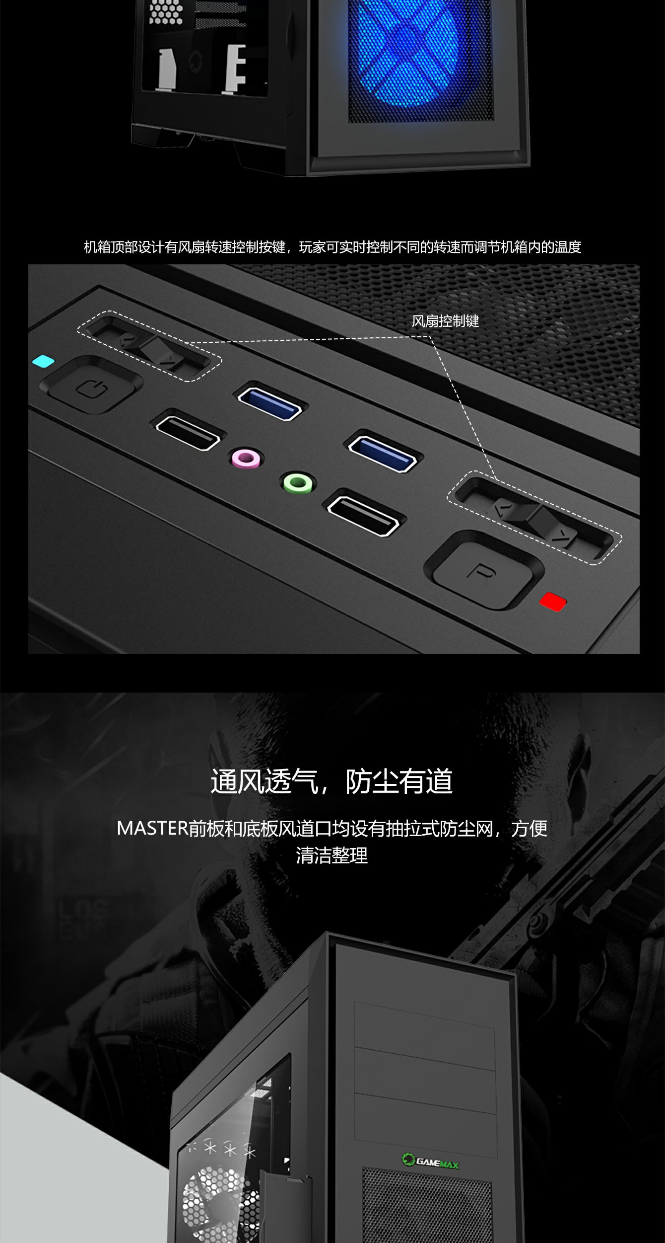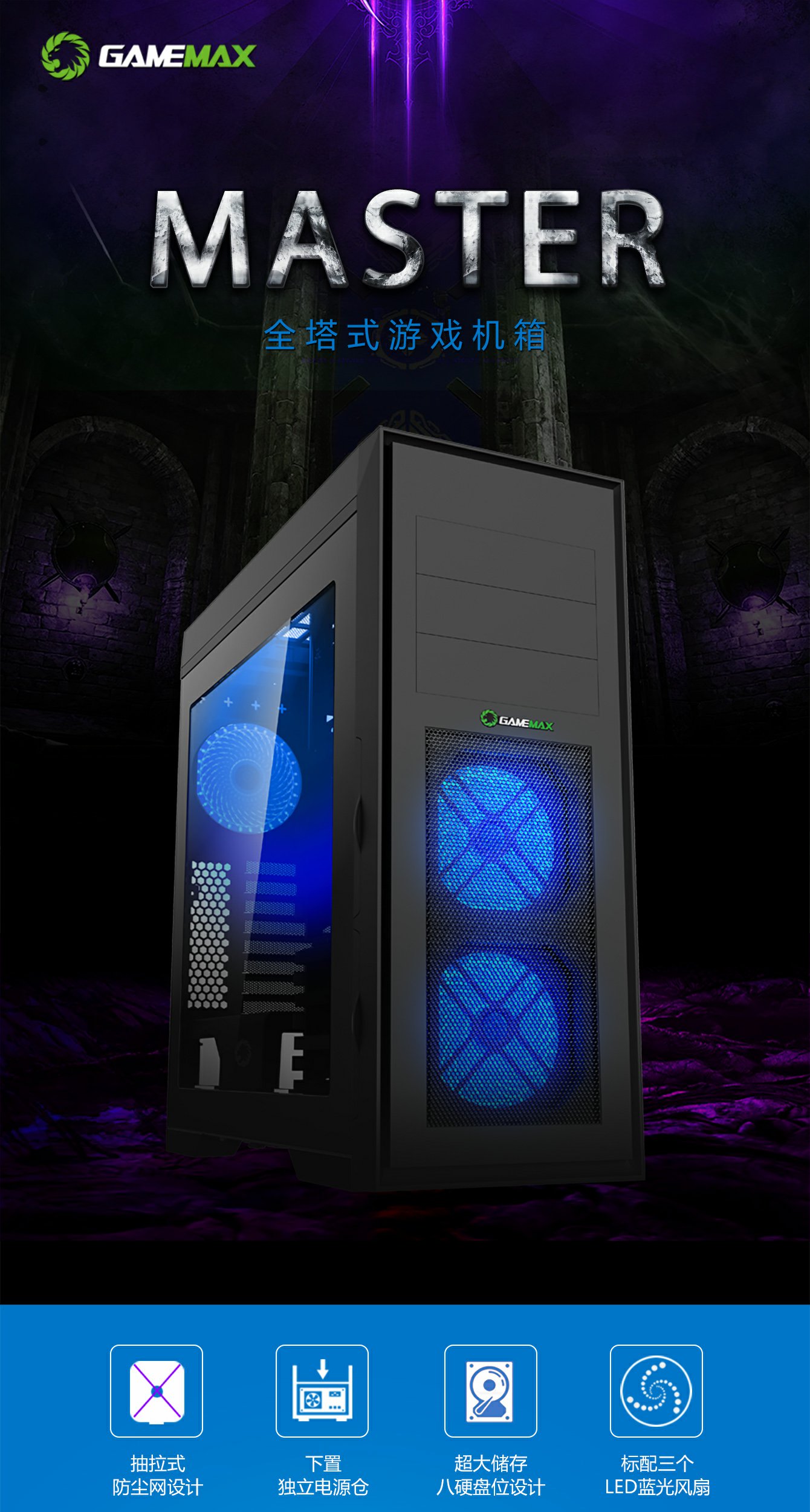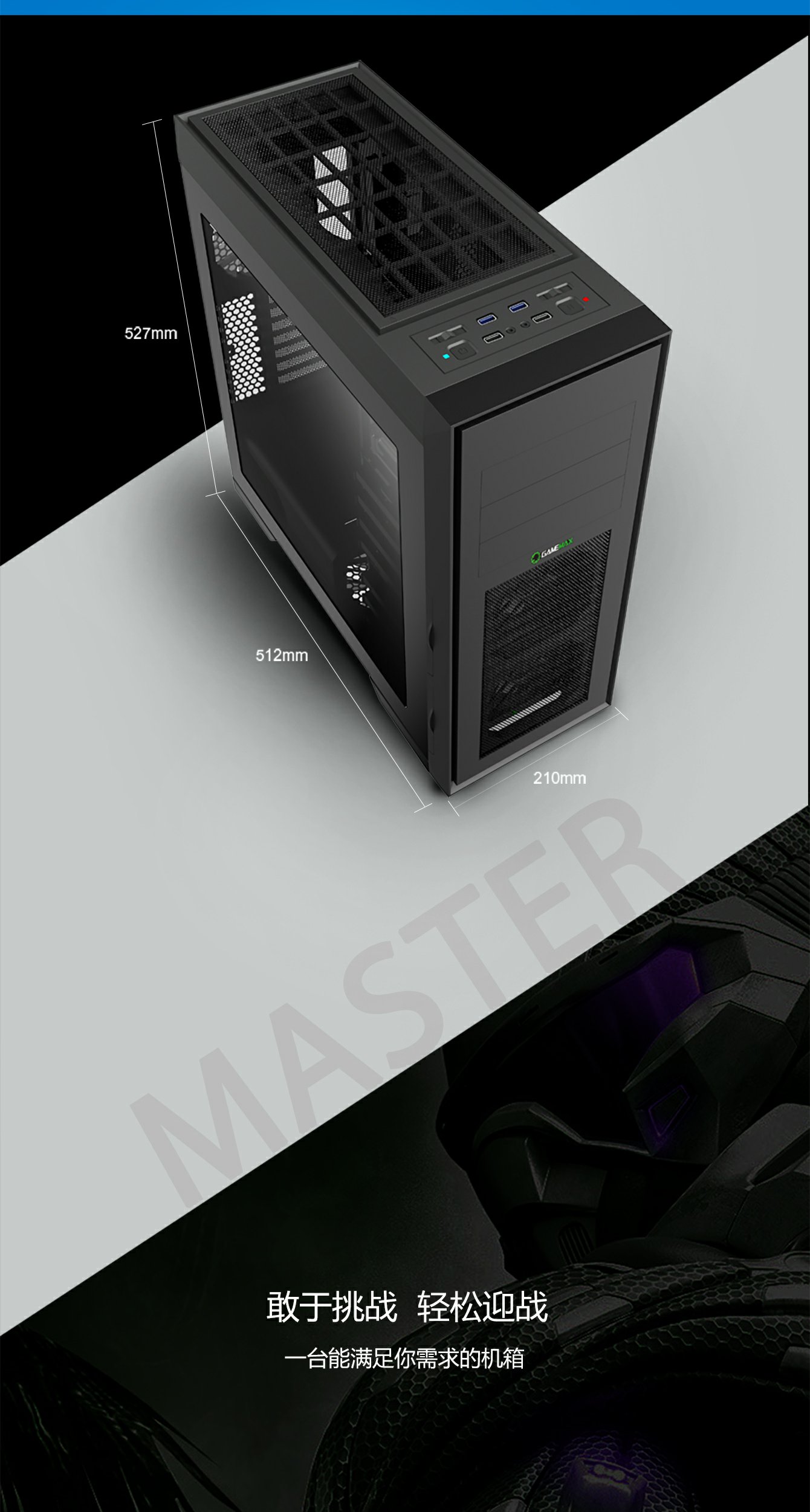 GameMax游戏帝国 Master 是全塔式图形工作站M905机箱,支持 360水排顶置,预装 3x12cm led 风扇用于进气,排出热空气,为您的系统提供最佳冷却效果