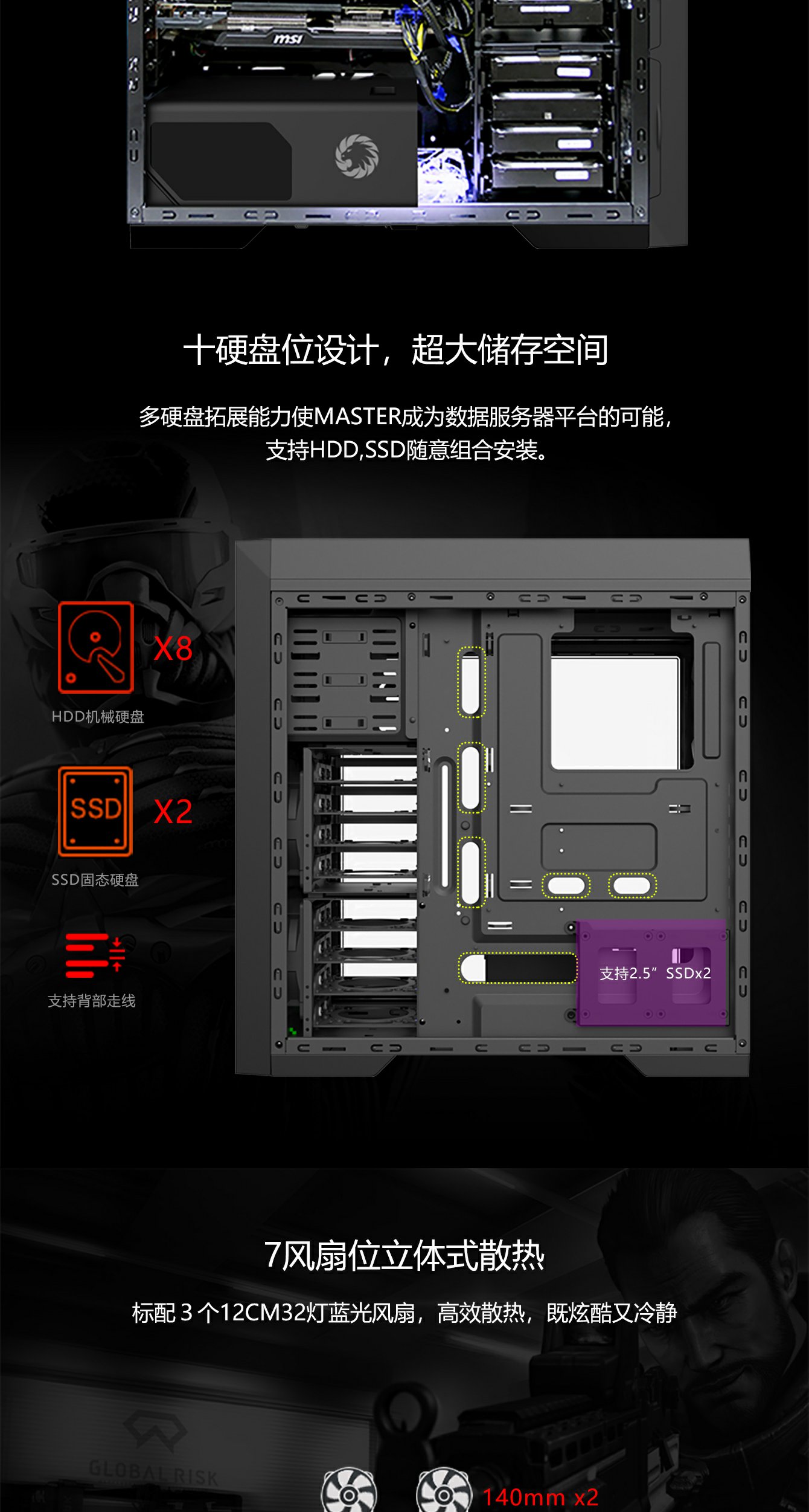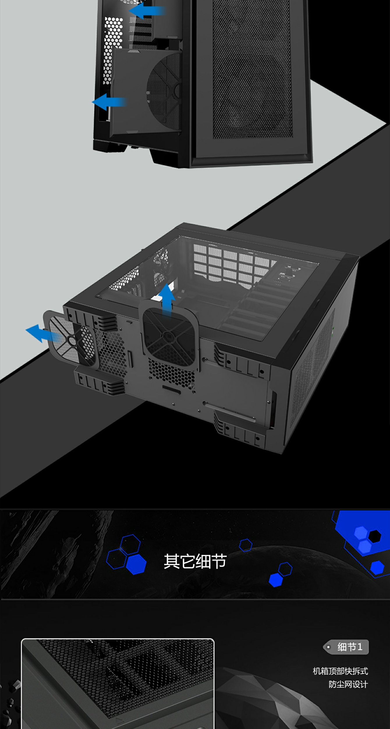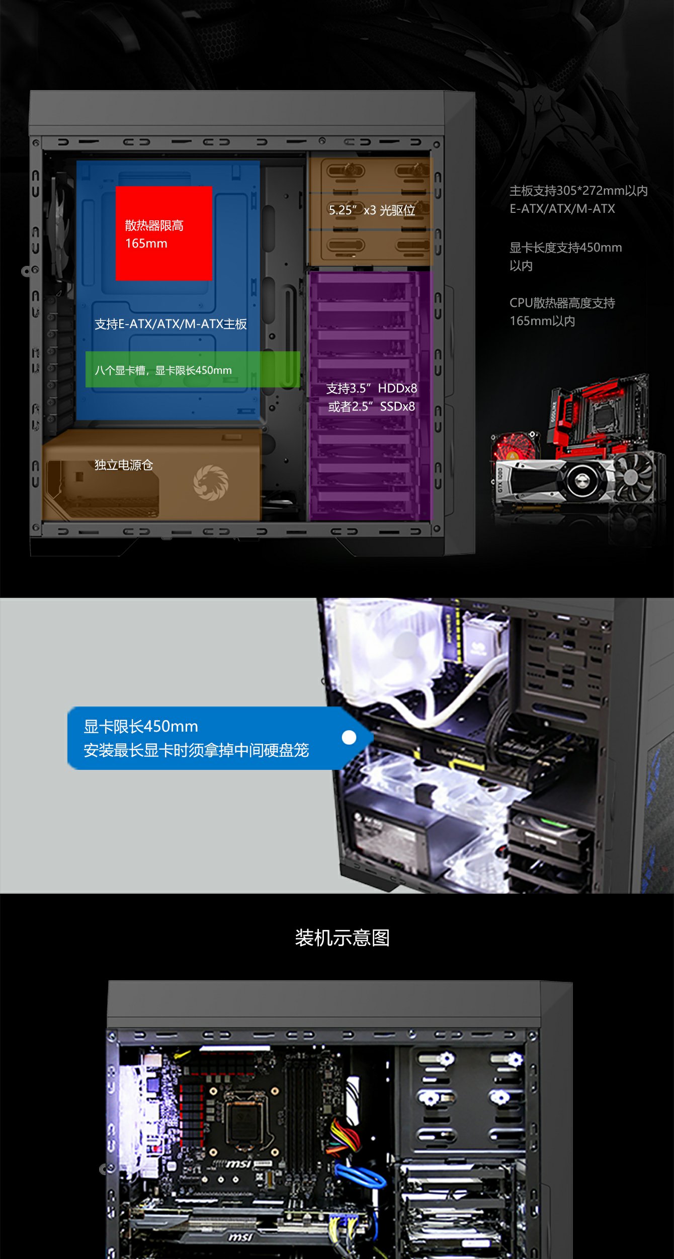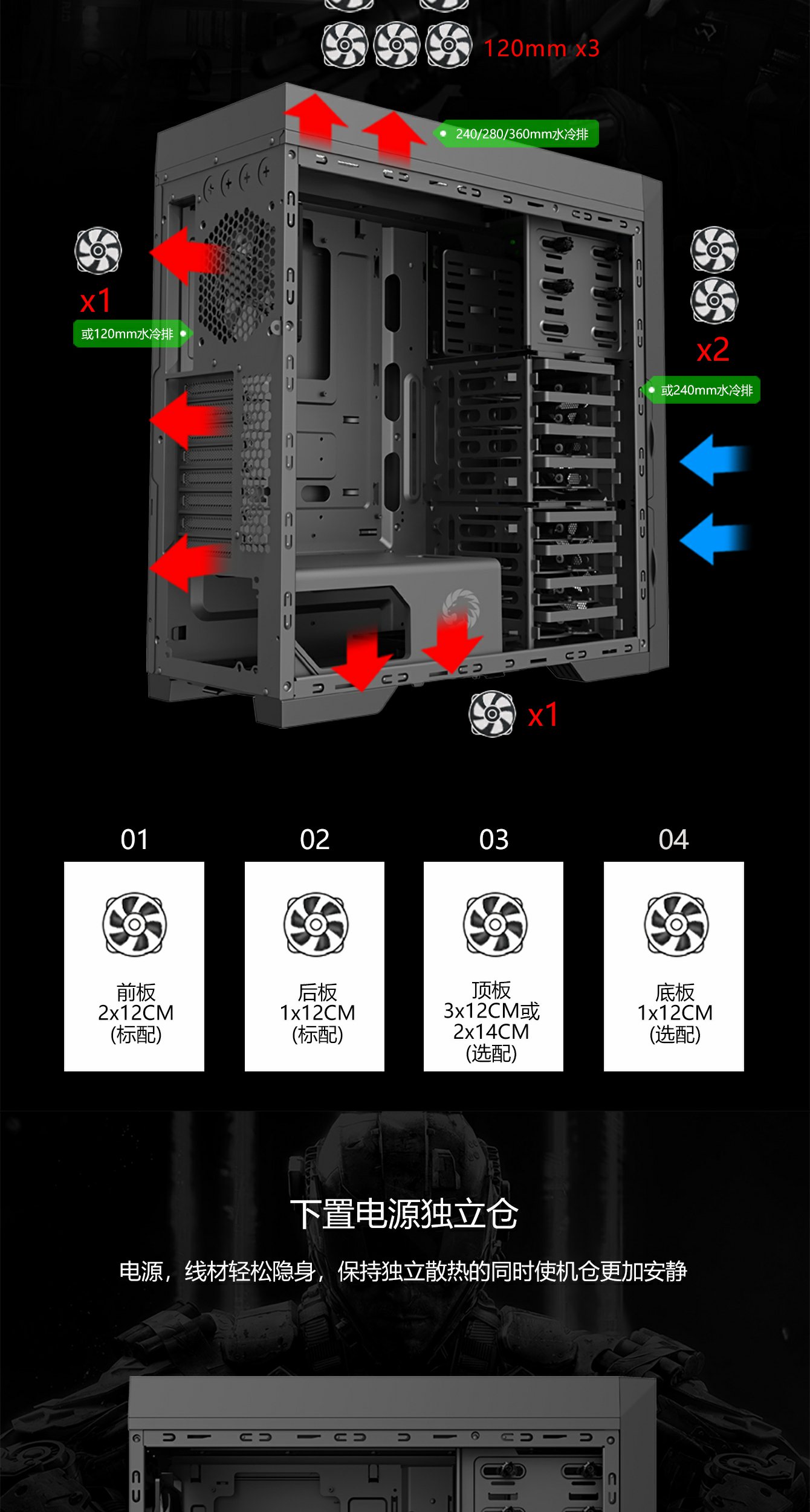 GameMax游戏帝国 Master 是全塔式图形工作站M905机箱,支持 360水排顶置,预装 3x12cm led 风扇用于进气,排出热空气,为您的系统提供最佳冷却效果