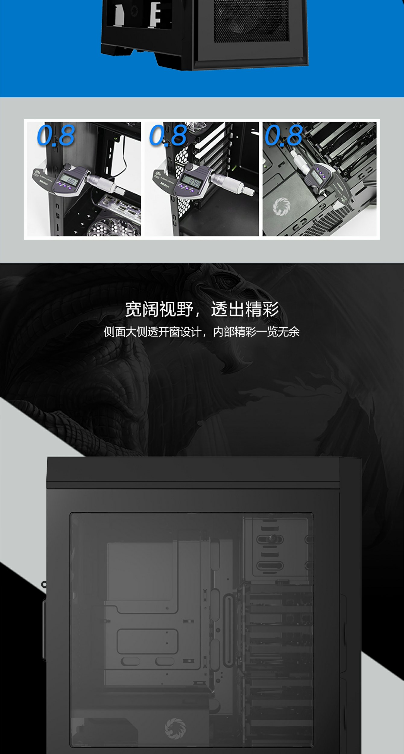 视野开阔,尽显精彩,侧板带侧透窗,内部一目了然