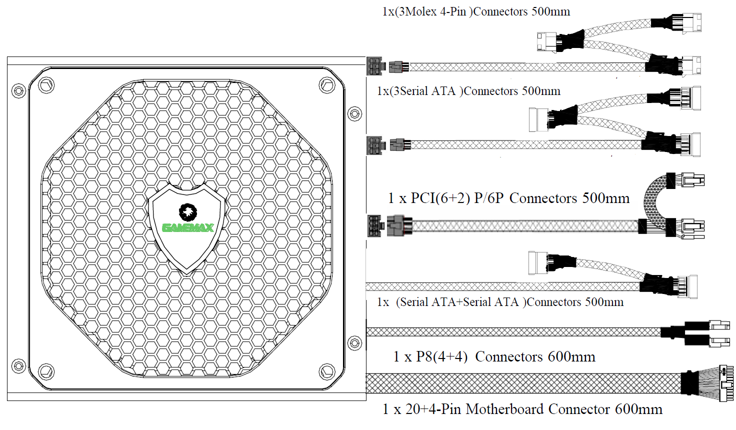 GameMax游戏帝国GM 系列电源,采用高效80+APFC电路金牌设计,输出端口为半模组,模组化线材允许您仅连接系统需要的电缆。 更少的电缆使电脑机箱内部更整洁,并且在您的机箱内有更好的气流。并GM系列电源 具有多重保护设计,输出高效率,12V大电流升级版,为电脑运行提供耐用性和对您下一个系统构建的完全信心。