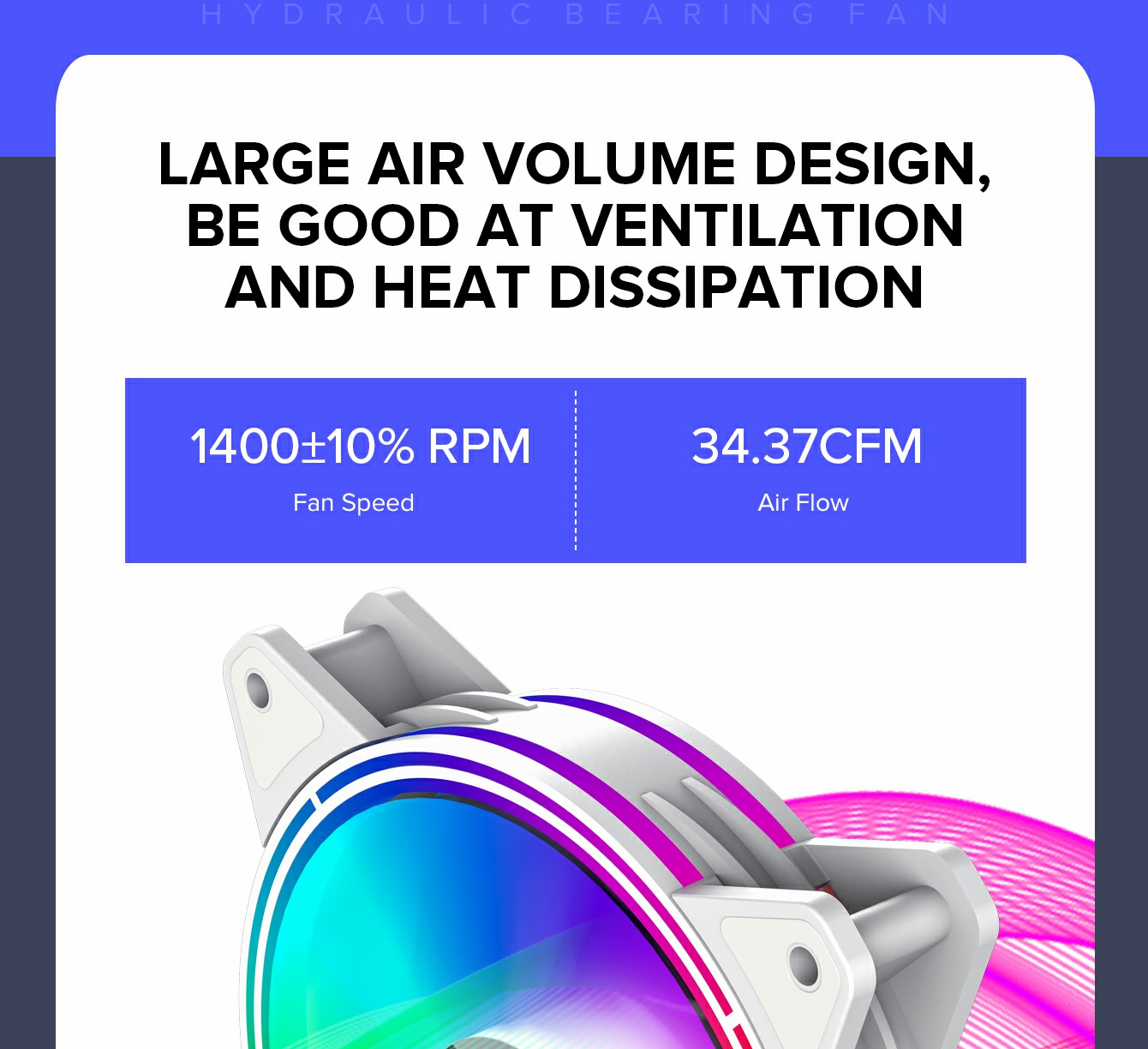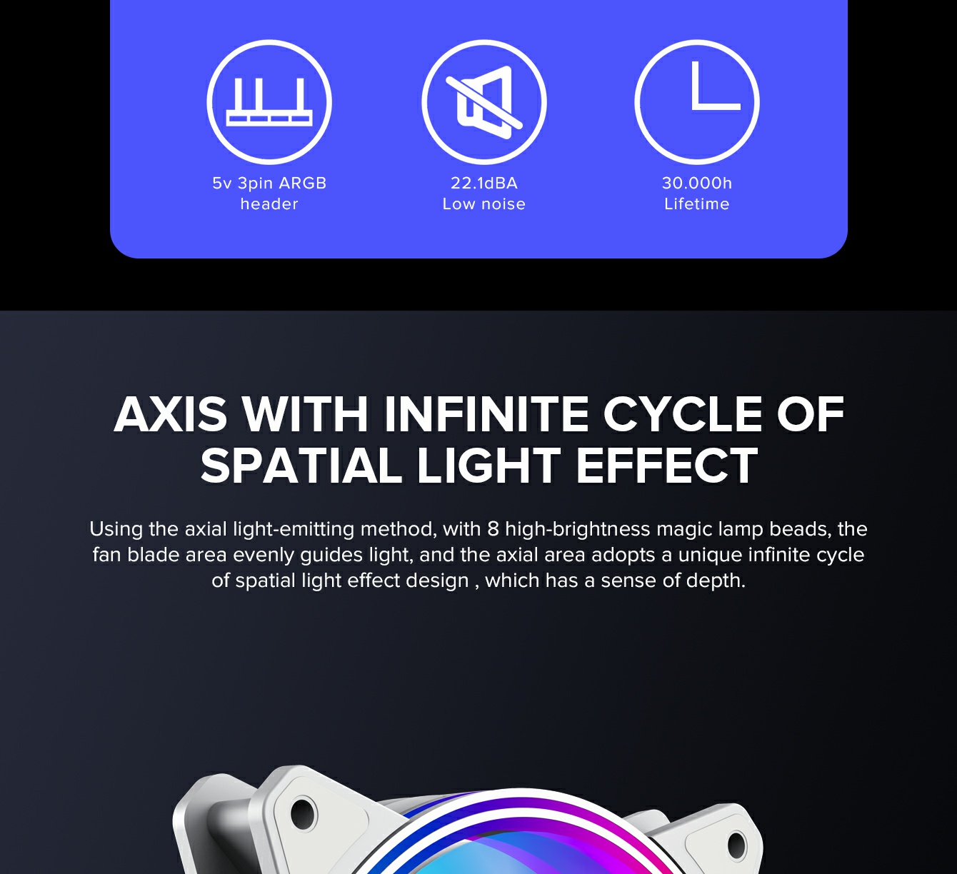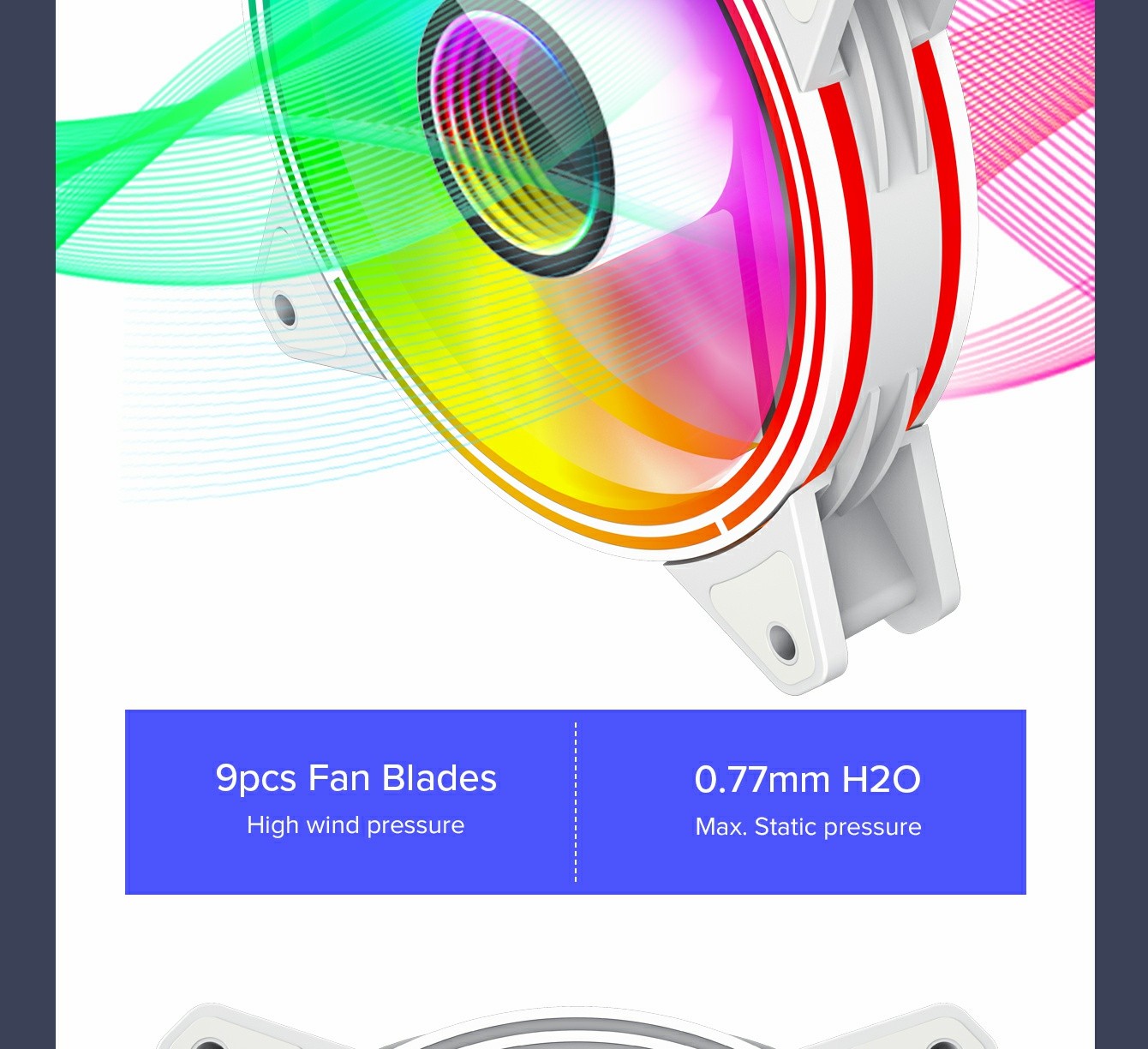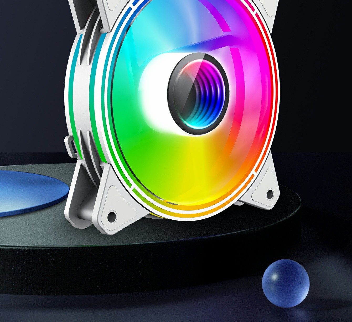Brand new for FN-12Rainbow-Q-Infinity Full White, ARGB 120mm Fan, it is outer quad ring light along with infinity light effect in the Centre of fan, and a hydraulic bearing silent fan