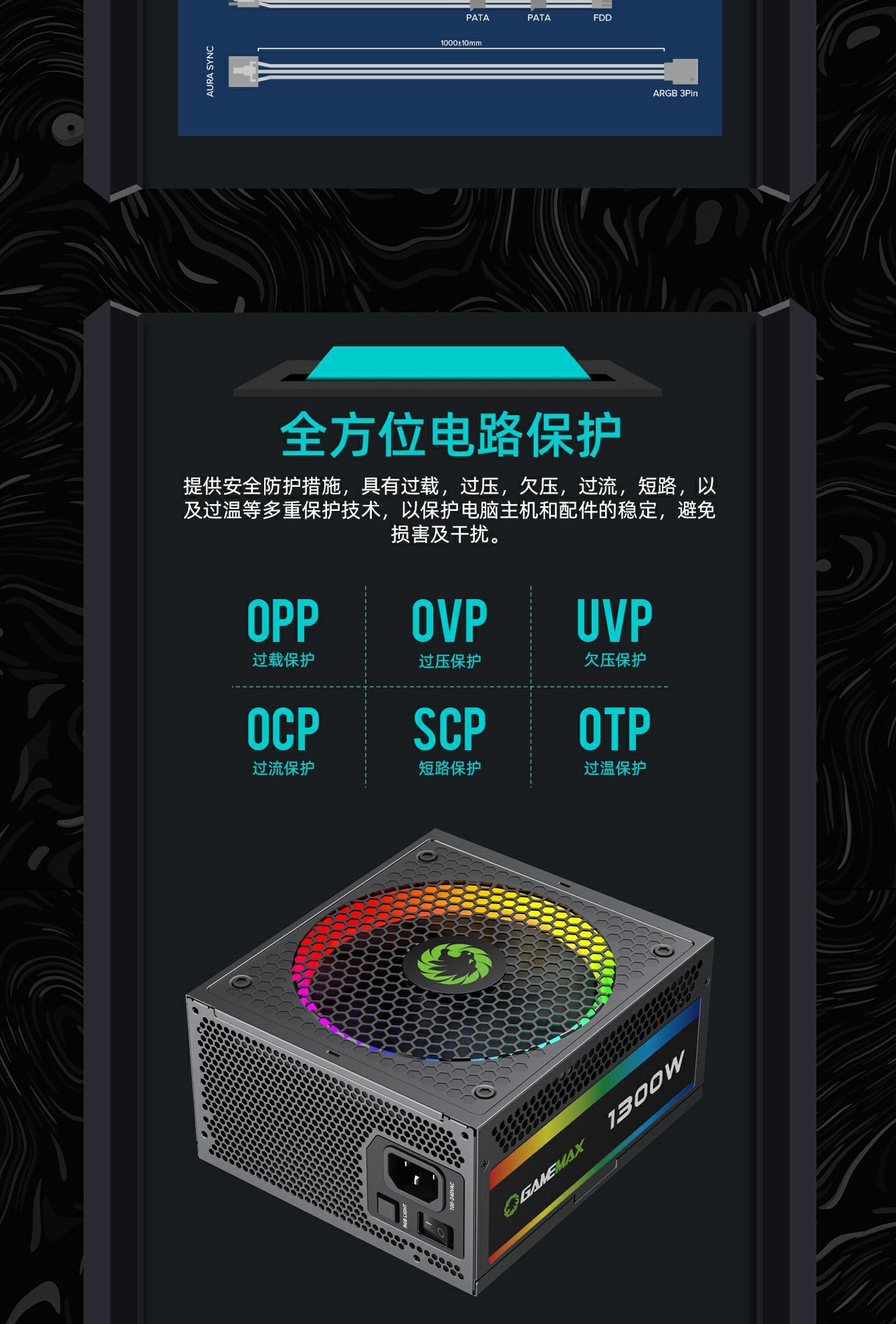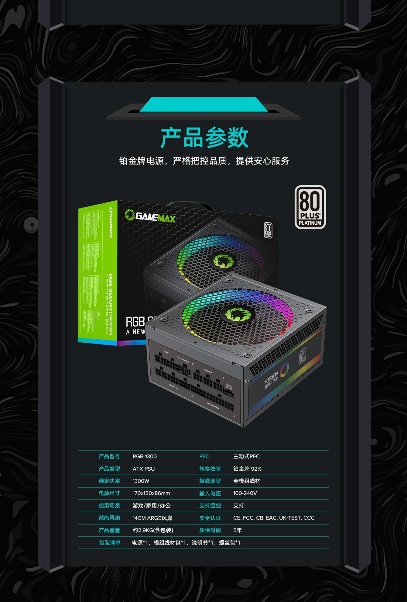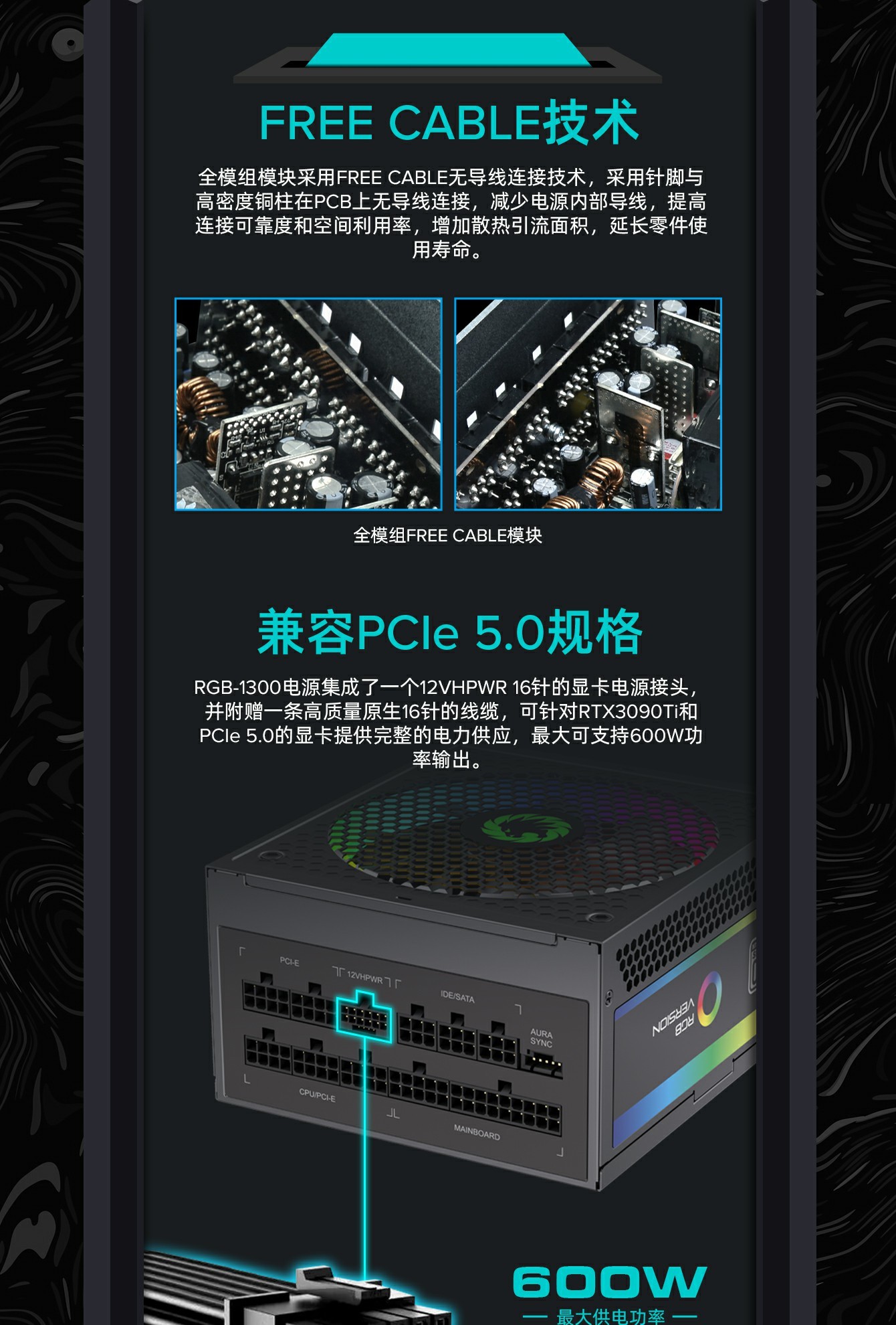GameMax RGB-1300 ATX3.0版本支持PCIe5.0, 铂金模组电源,全模块化 LLC+DC-DC 设计,强大的单路 +12V 输出设计有助于确保稳定,并可靠地为其他 PC 组件供电。配备 140 毫米 ARGB 风扇有助于提供更明亮和令人惊叹的灯光效果,支持与华硕、技嘉、微星和华擎兼容的 RGB 主板同步,提供无数照明可能性。