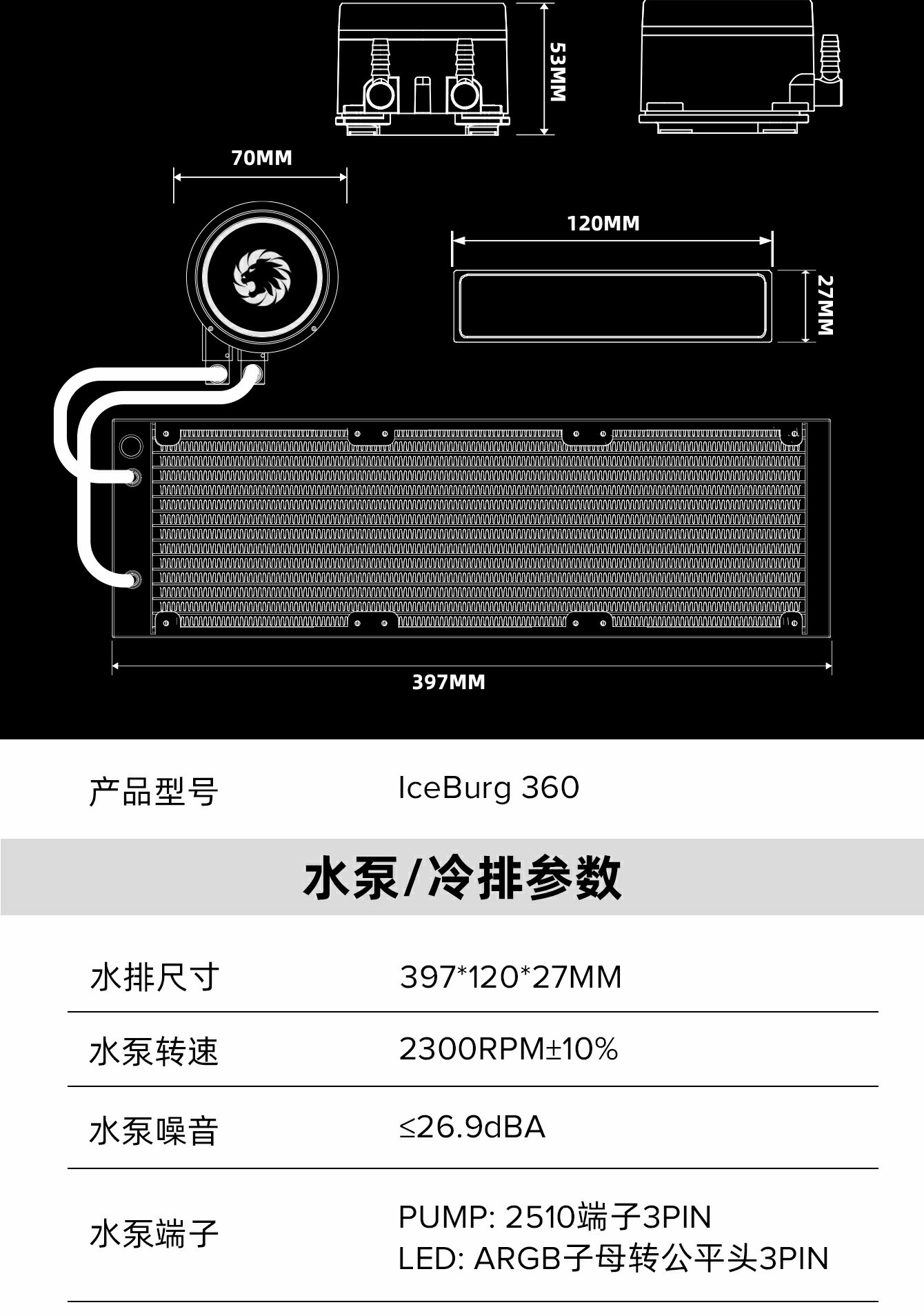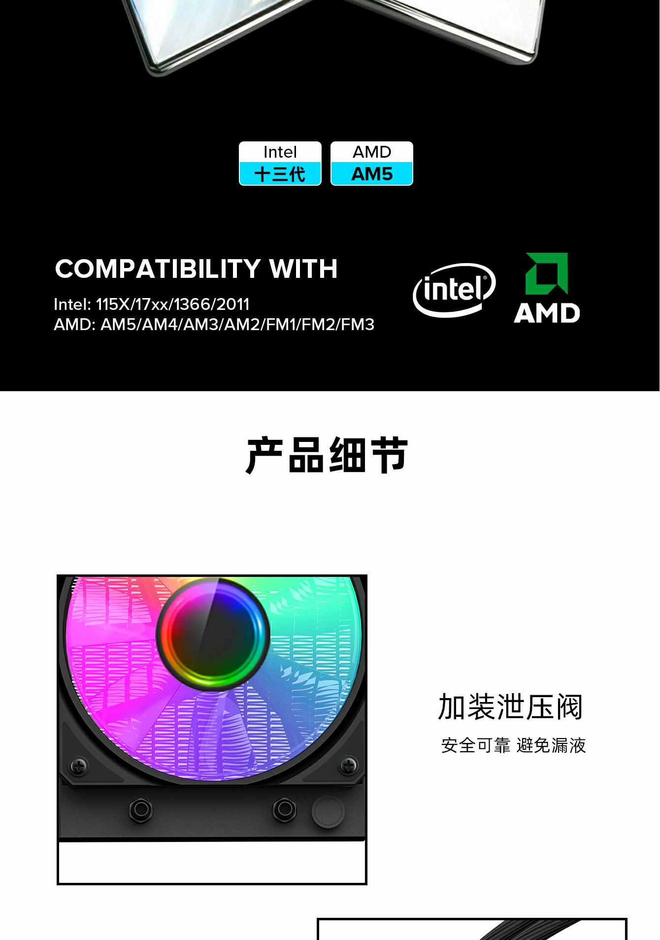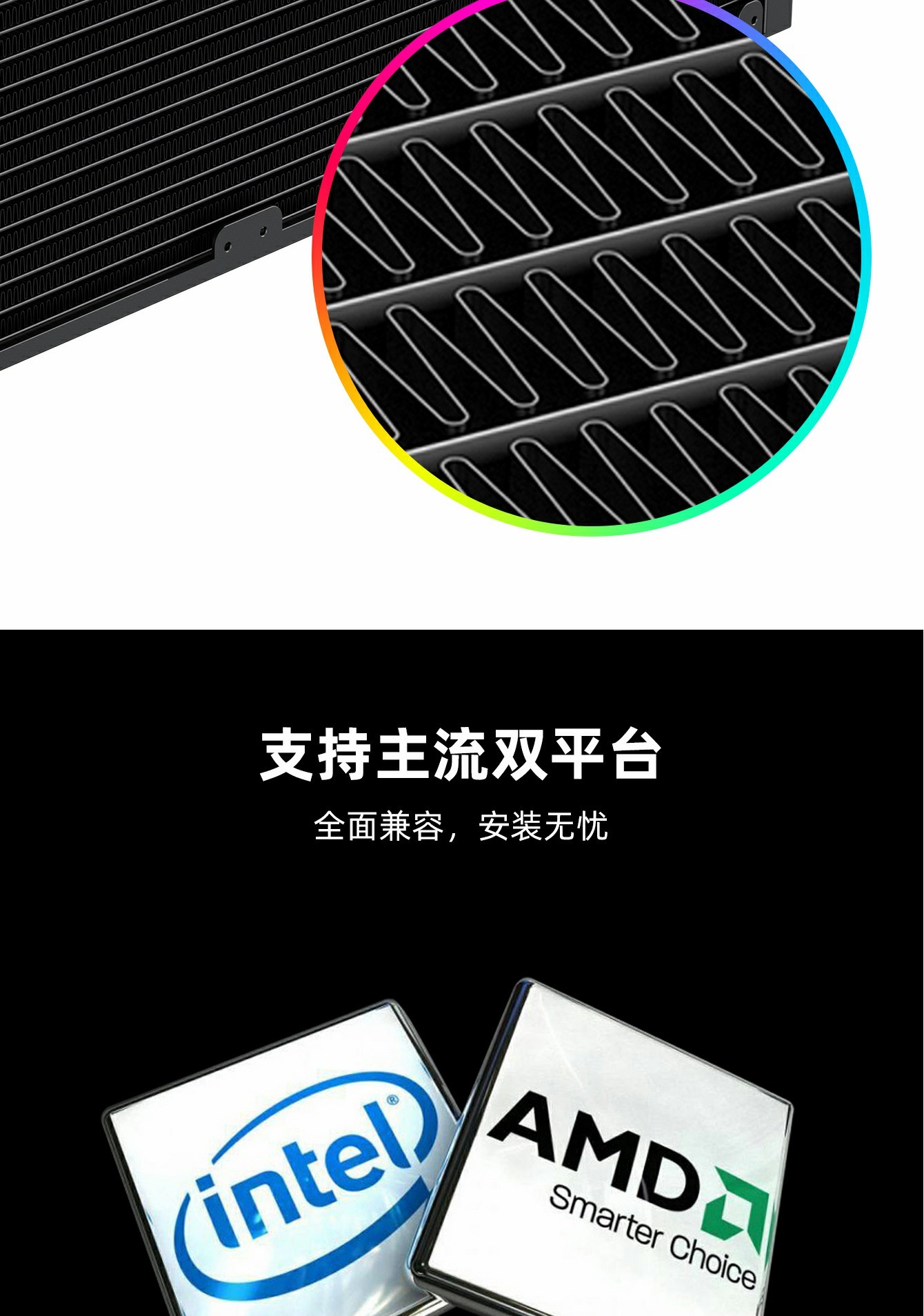 可寻址RGB同步:风扇和泵上的可寻址RGB照明可以通过5V 3引脚接口与主板同步,提供均匀而丰富的照明