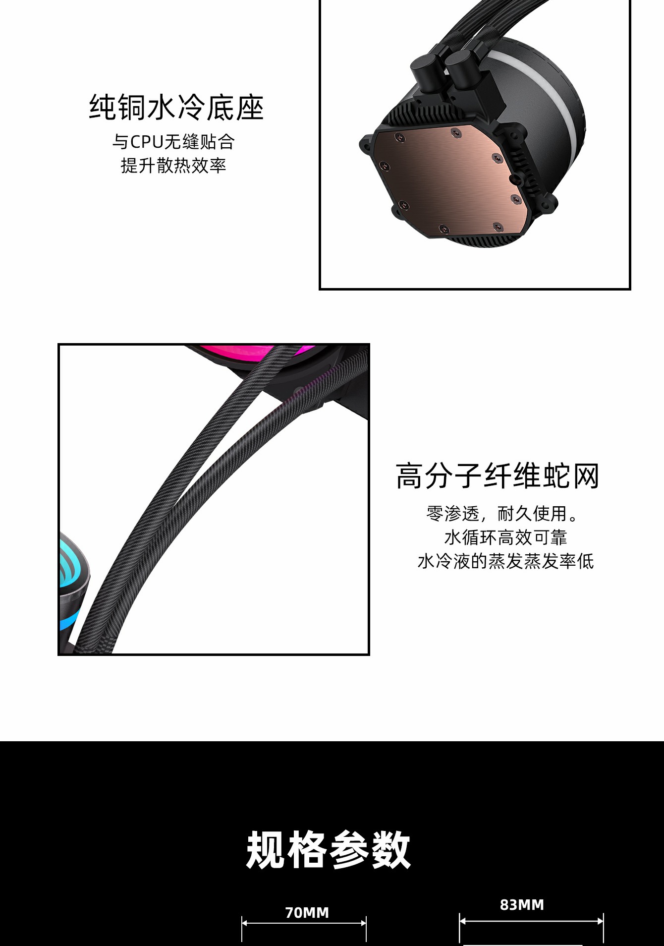 更好的冷却性能:具有更高效的冷板、喷铜底部、专有泵和针对静压进行优化的风扇,以确保CPU的出色传热
