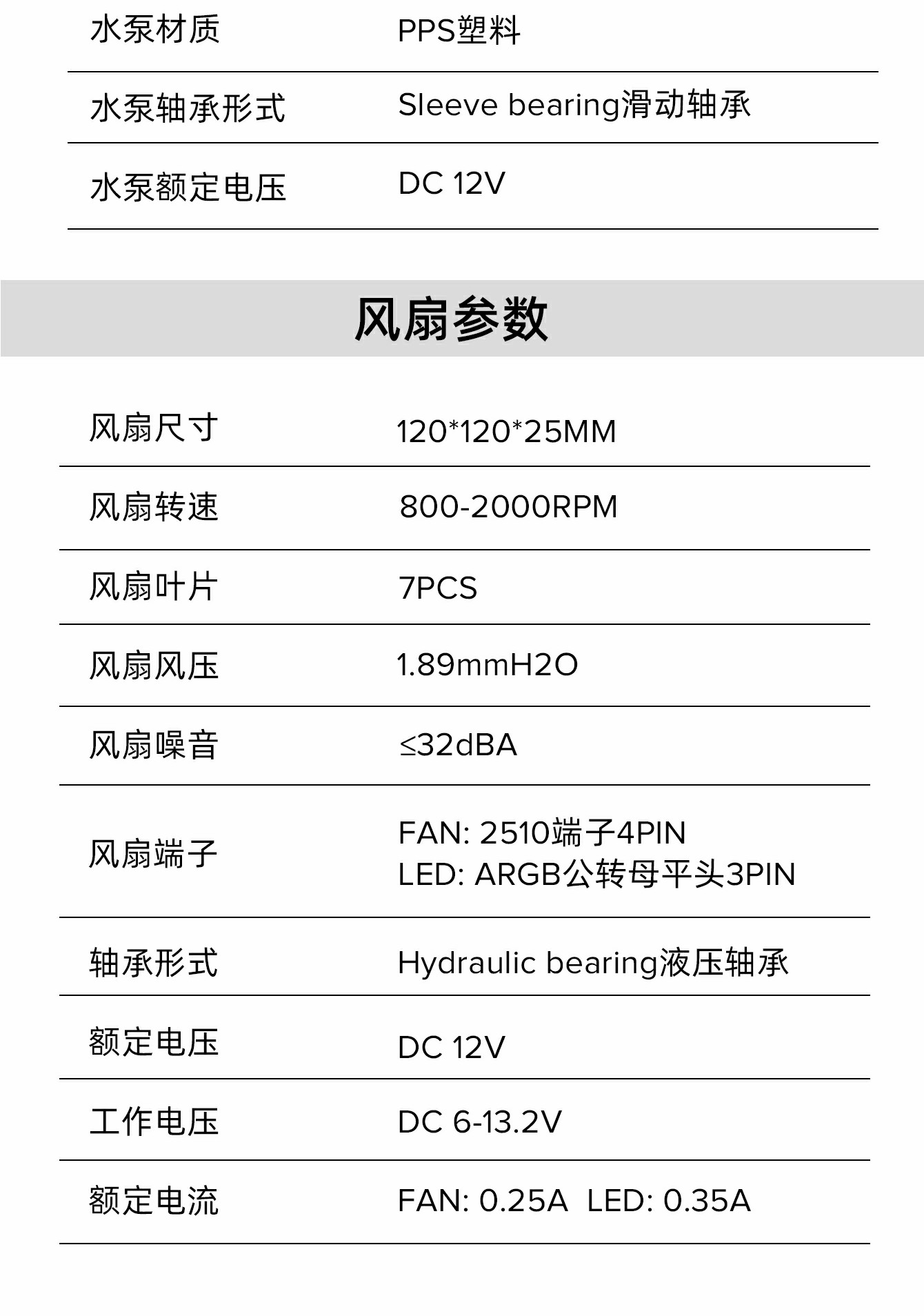 | RPM | 800-2000RPM | Lighting mode | ARGB internal 8PCS | Rated Current | Fan:0.25A LED 0.35A |