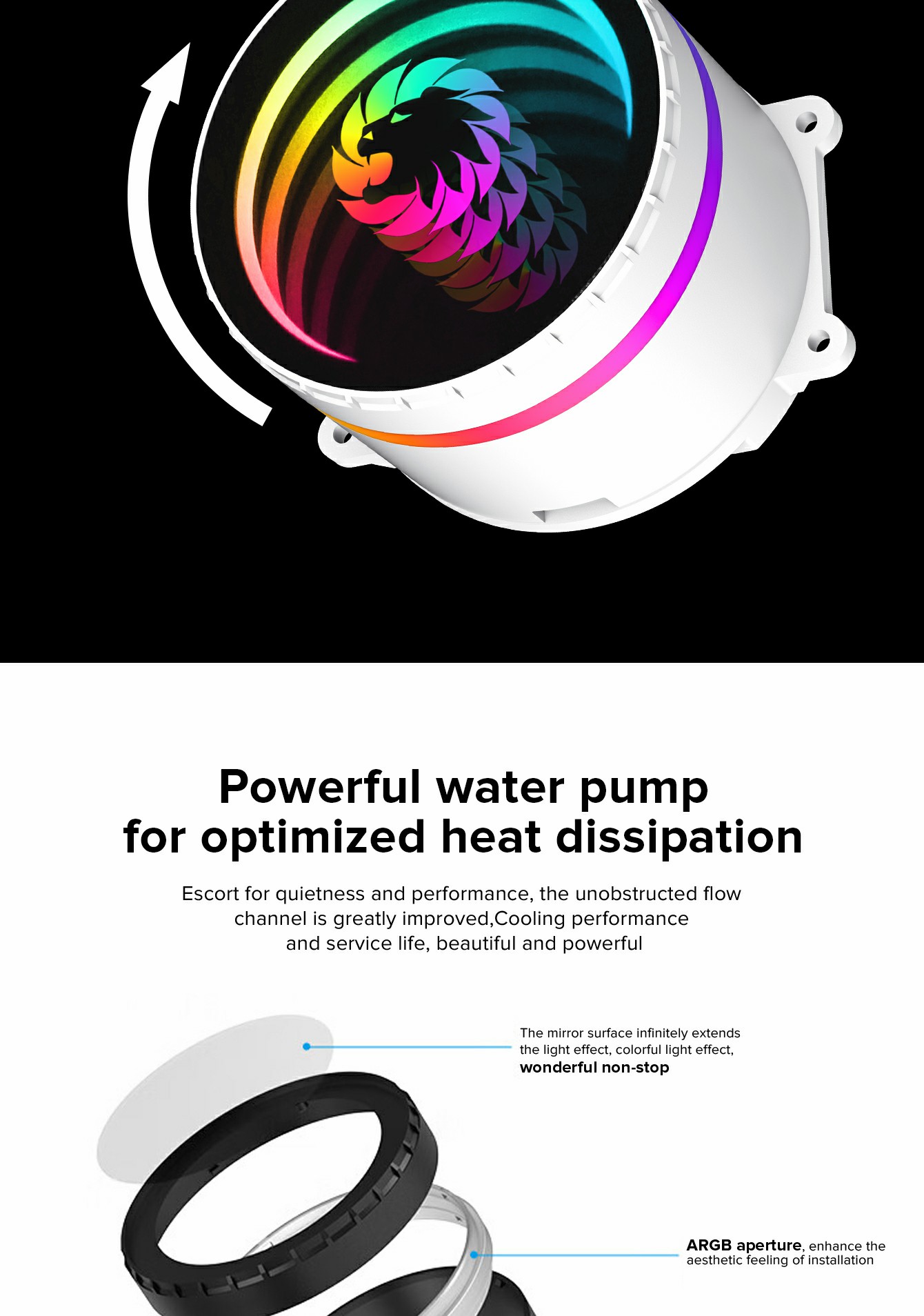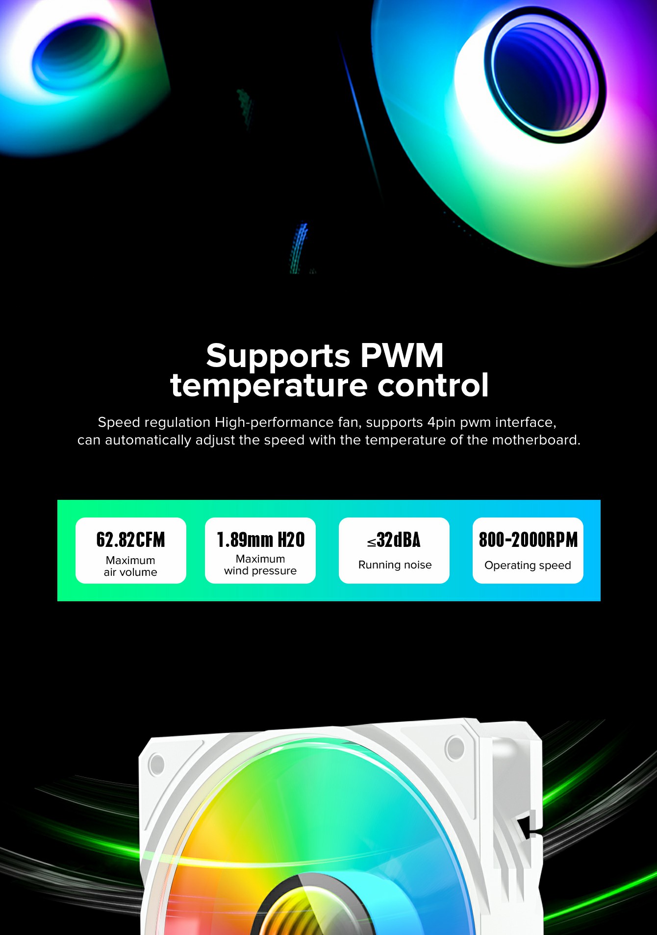 | RPM | 800-2000RPM | Lighting mode | ARGB internal 8PCS | Rated Current | Fan:0.25A LED 0.35A |