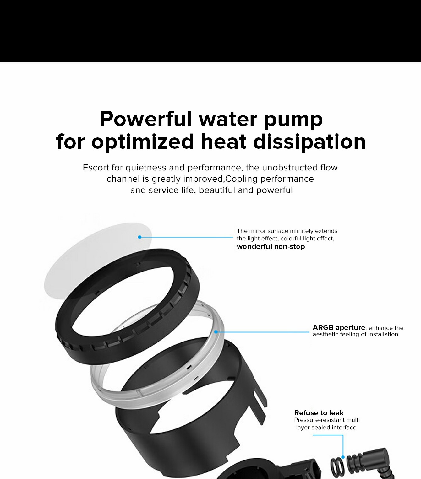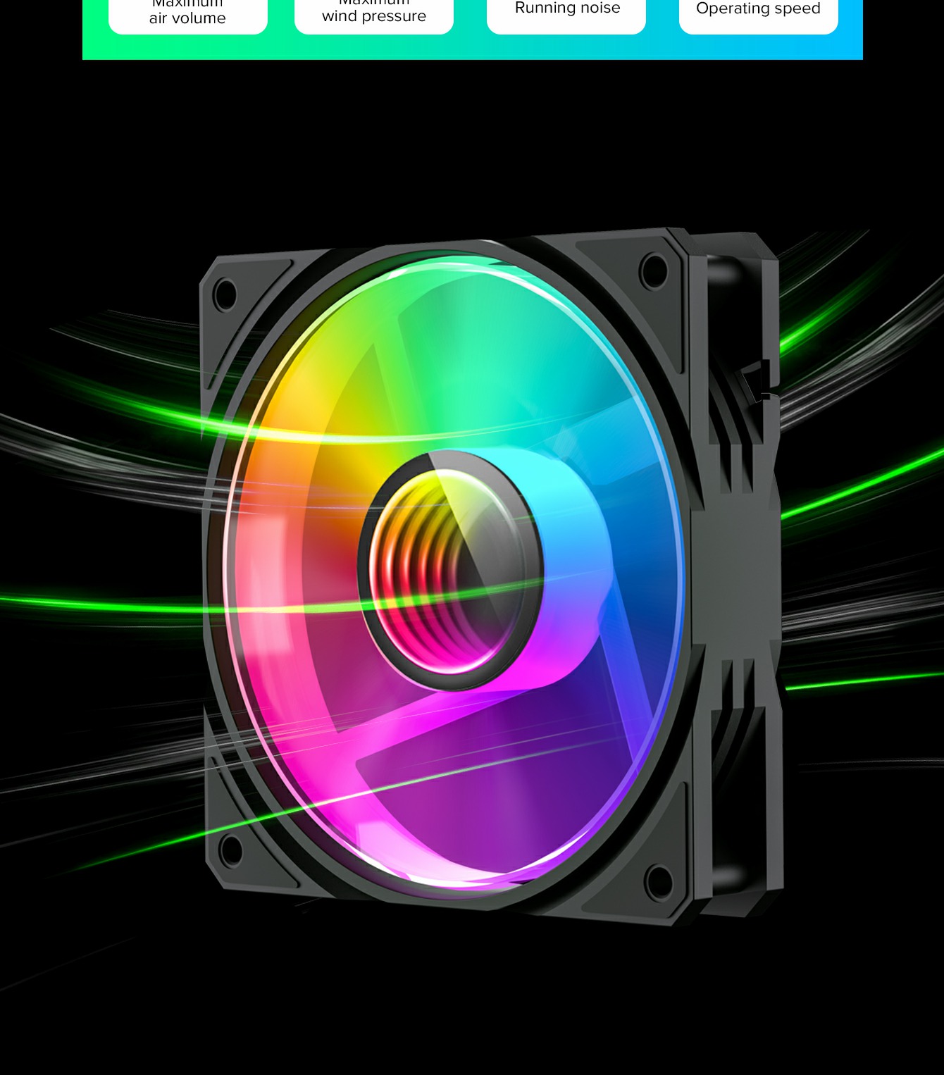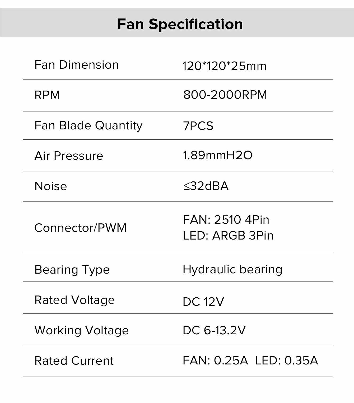 | RPM | 800-2000RPM | Lighting mode | ARGB internal 8PCS | Rated Current | Fan:0.25A LED 0.35A |