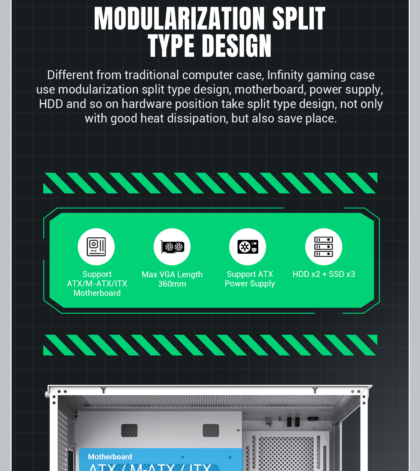 • Modular Design & Expandability,Supports ATX, Micro-ATX, and Mini-ITX motherboards with flexible hardware configuration options.