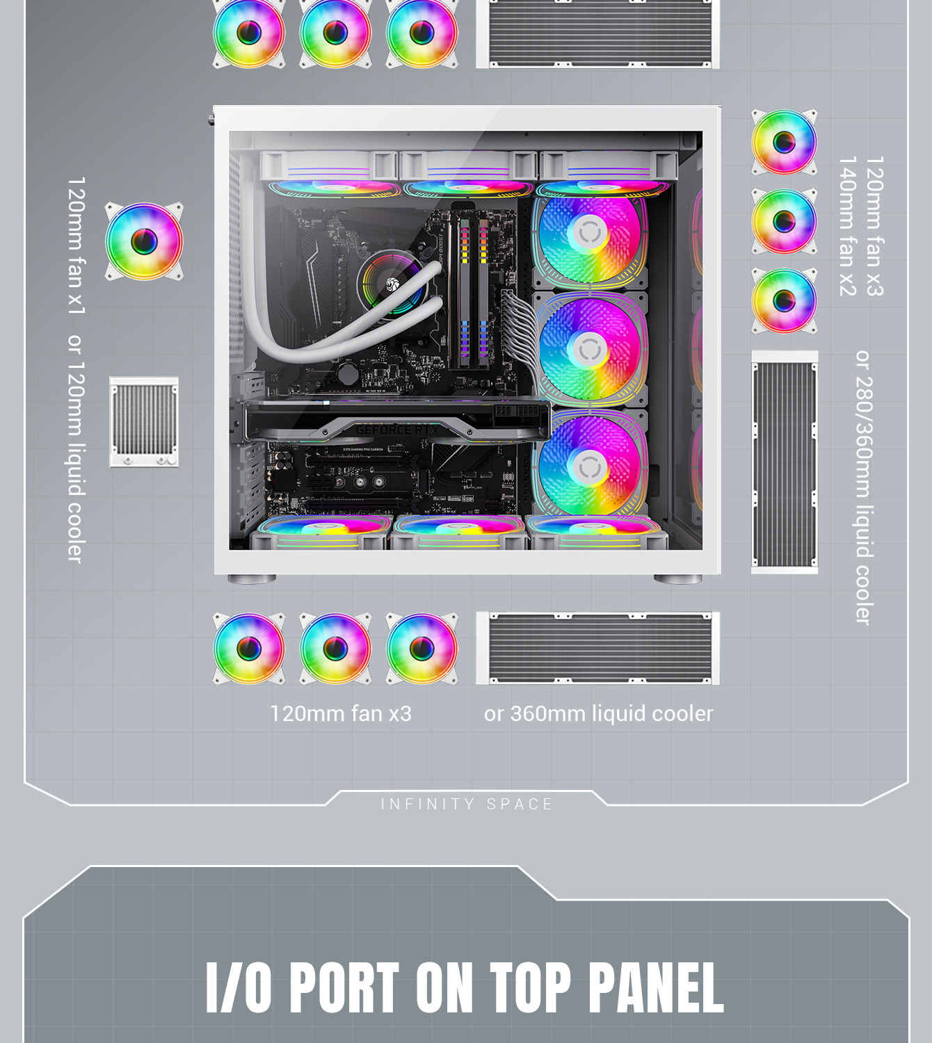 • Superior Cooling & Water Cooling,Supports 360mm radiators on the top, bottom, and motherboard for efficient cooling.