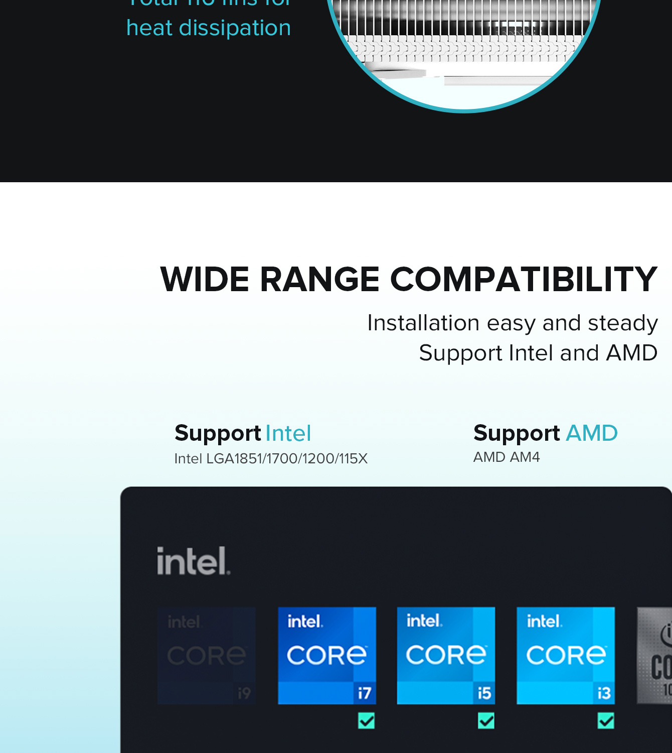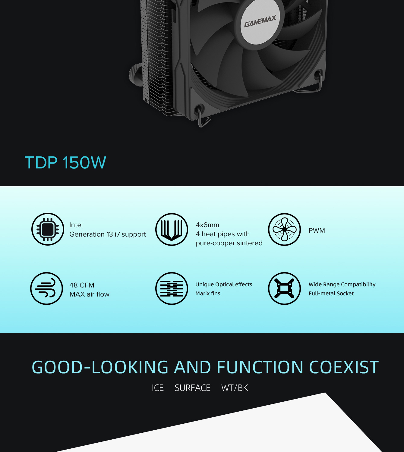【47mm Height,CPU Air Cooler】Ice Surface CPU Air Cooler is armed with 116 pieces of penetrate-design fins, and high-level metal fasteners