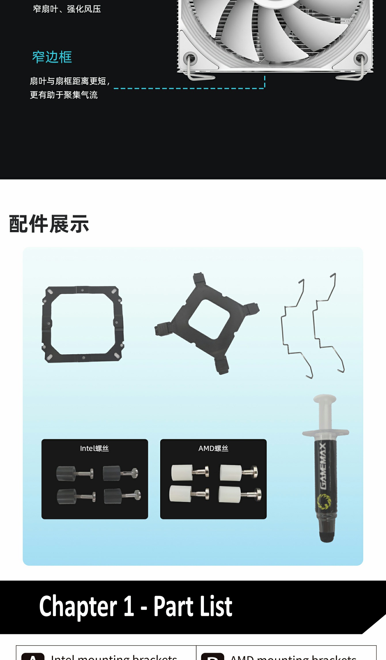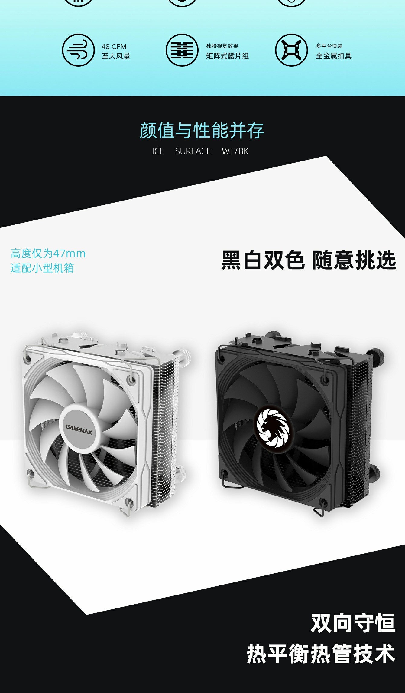 【47mm Height,CPU Air Cooler】Ice Surface CPU Air Cooler is armed with 40 pieces of penetrate-design fins, and high-level metal fasteners