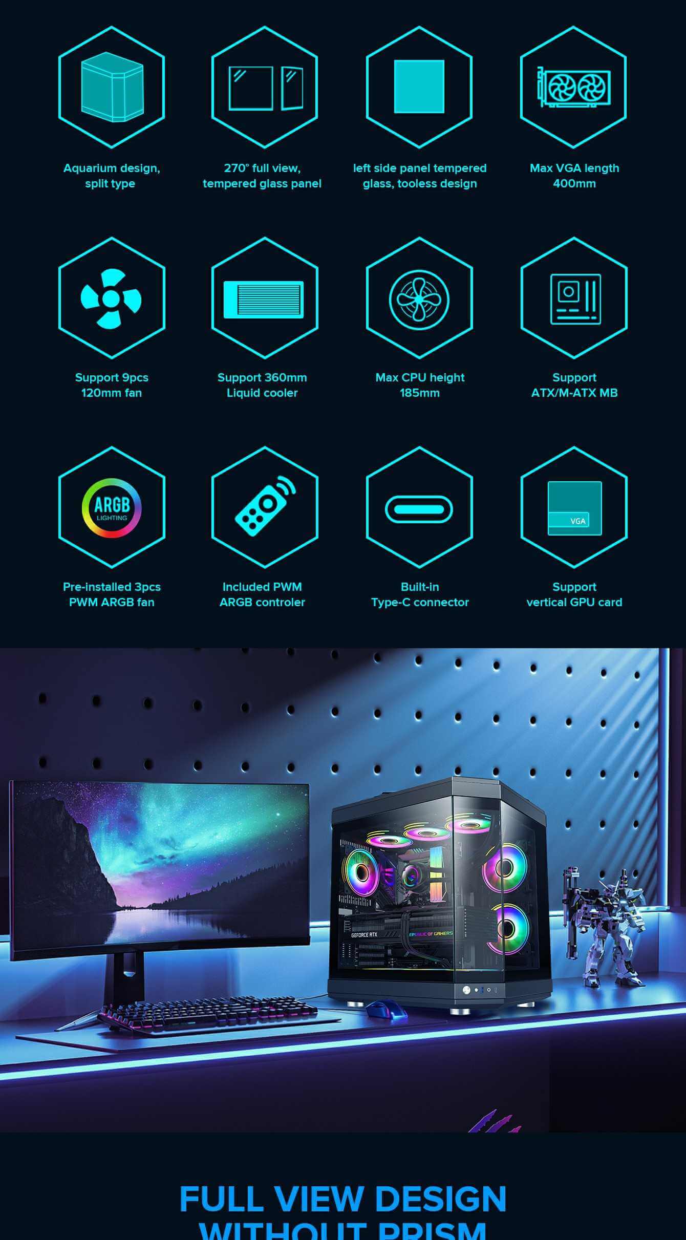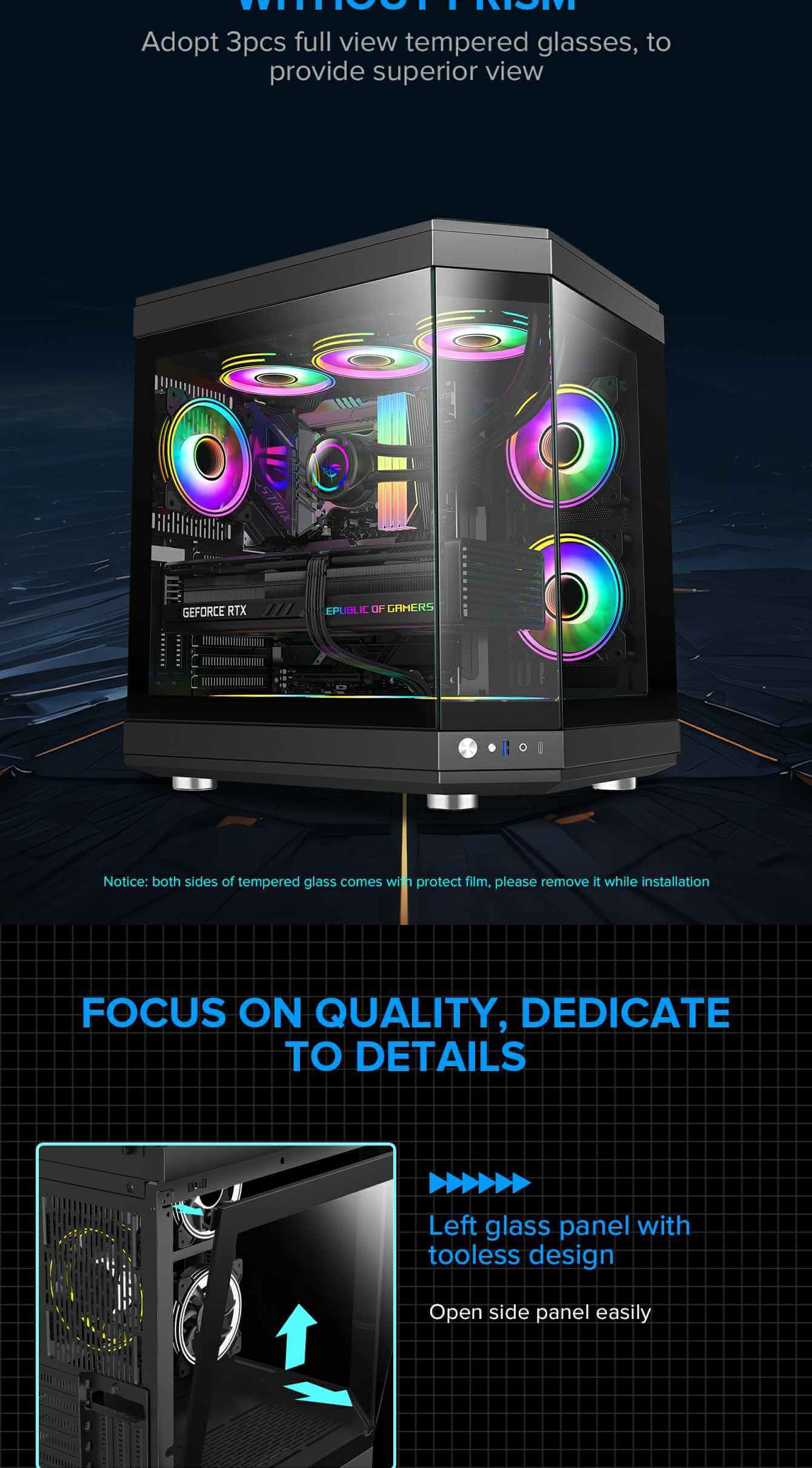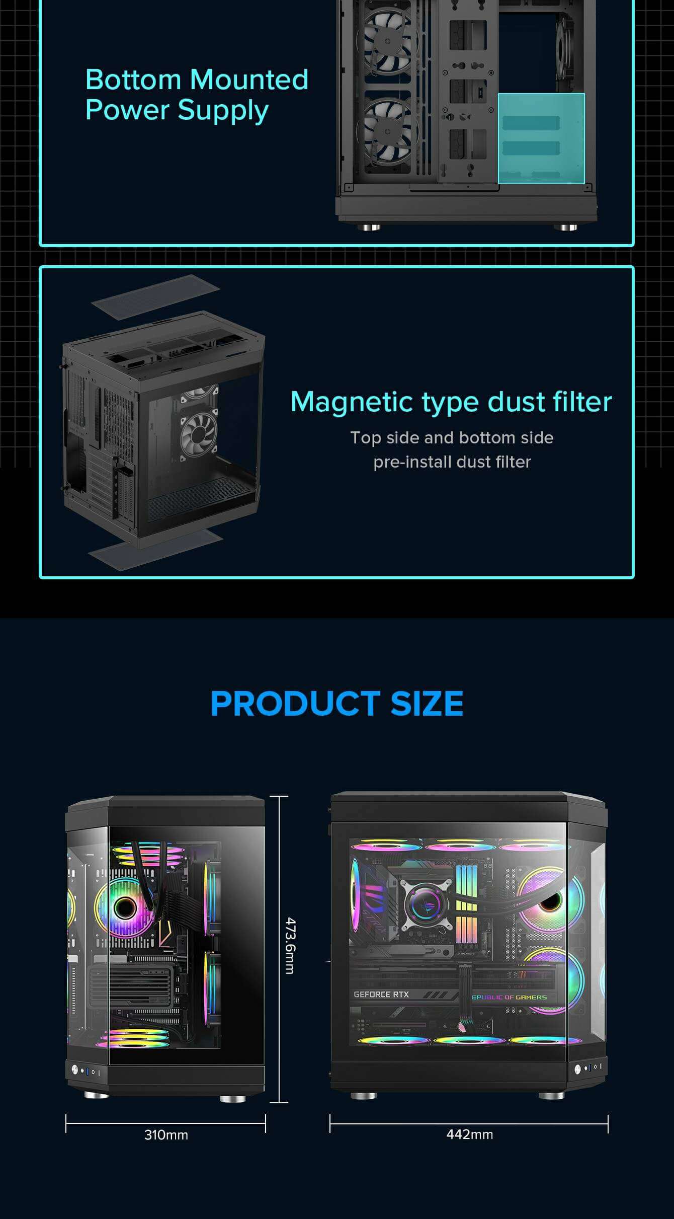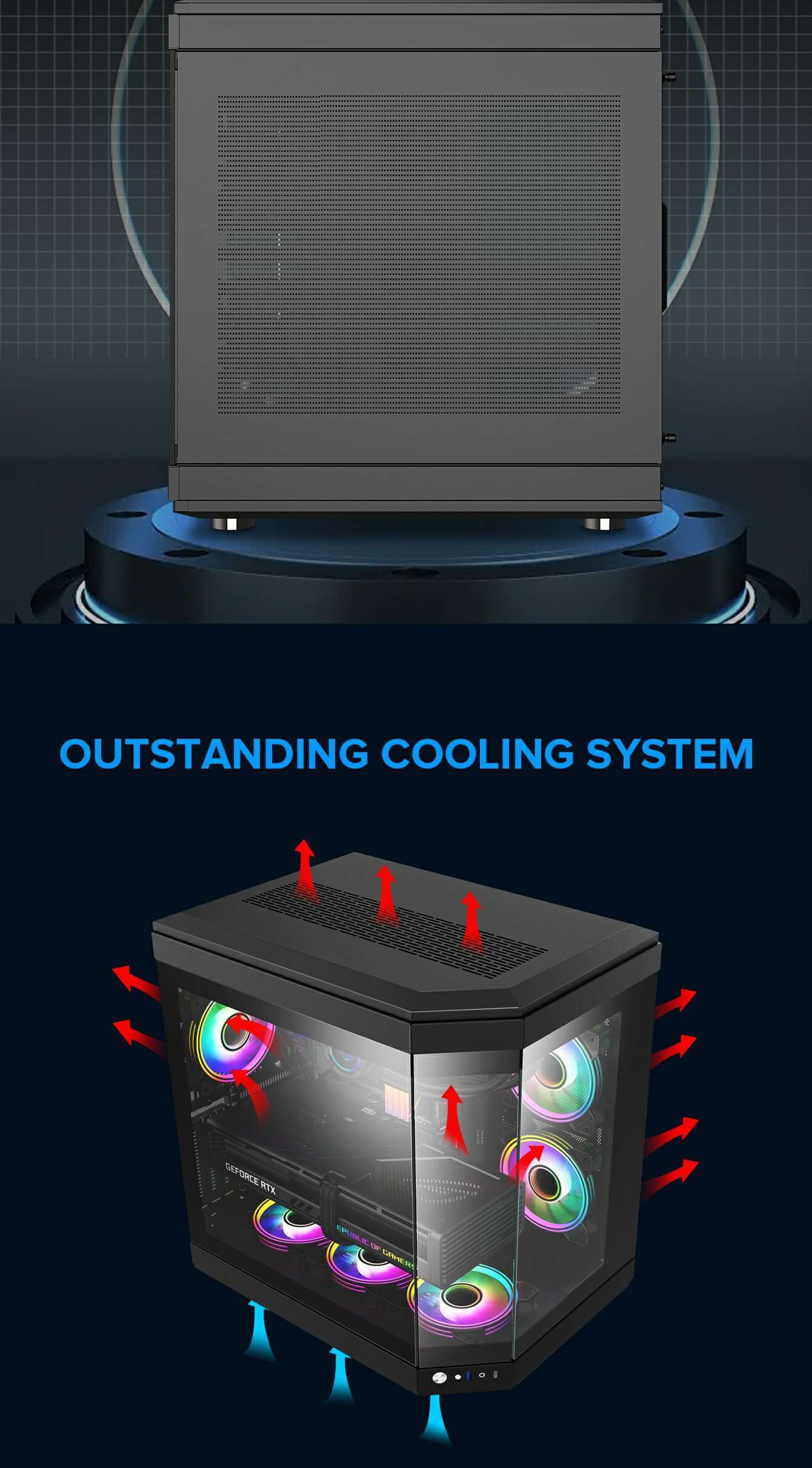 • Computer Case Focus on Cooling- 3 x pre-installed 120mm ARGB Fans- 2 beneath the floor, and one at the back of the case
